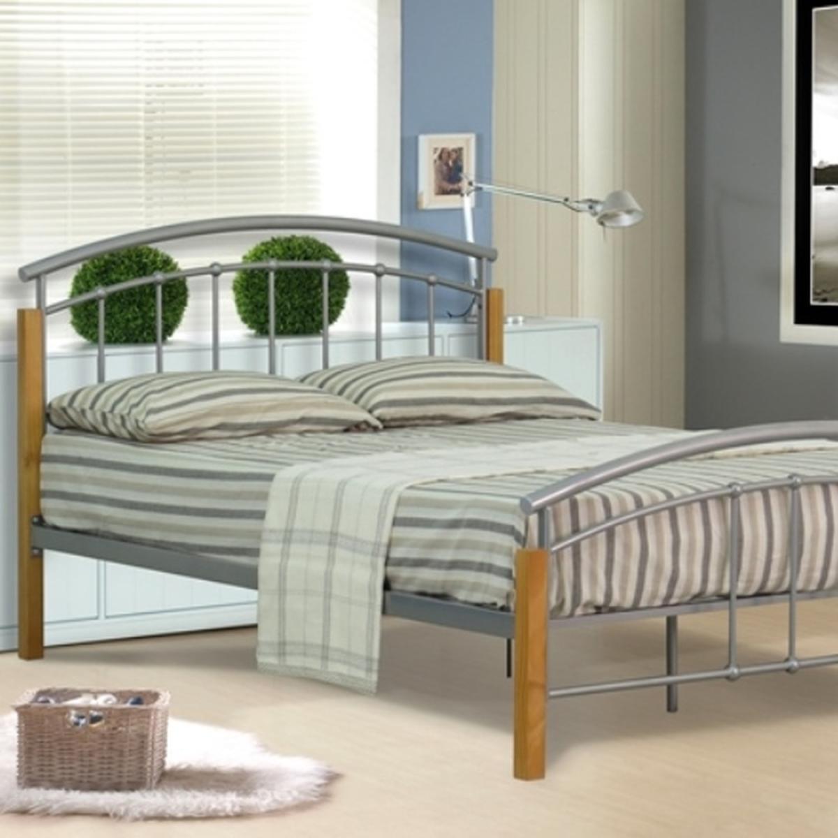 Adding a contemporary twist on the traditional wooden design, the frame brings a fresh look to any bedroom. The metal frame has a slightly curved head and foot end which is complemented by wooden corner posts. The bed features a visual delight of both straight and curved lines on both the headboard and footboard, the bed is available in silver to complement any bedroom design either modern or traditional. The bed is sturdy with a sprung slatted base which adds support to the stylish, sleek frame.