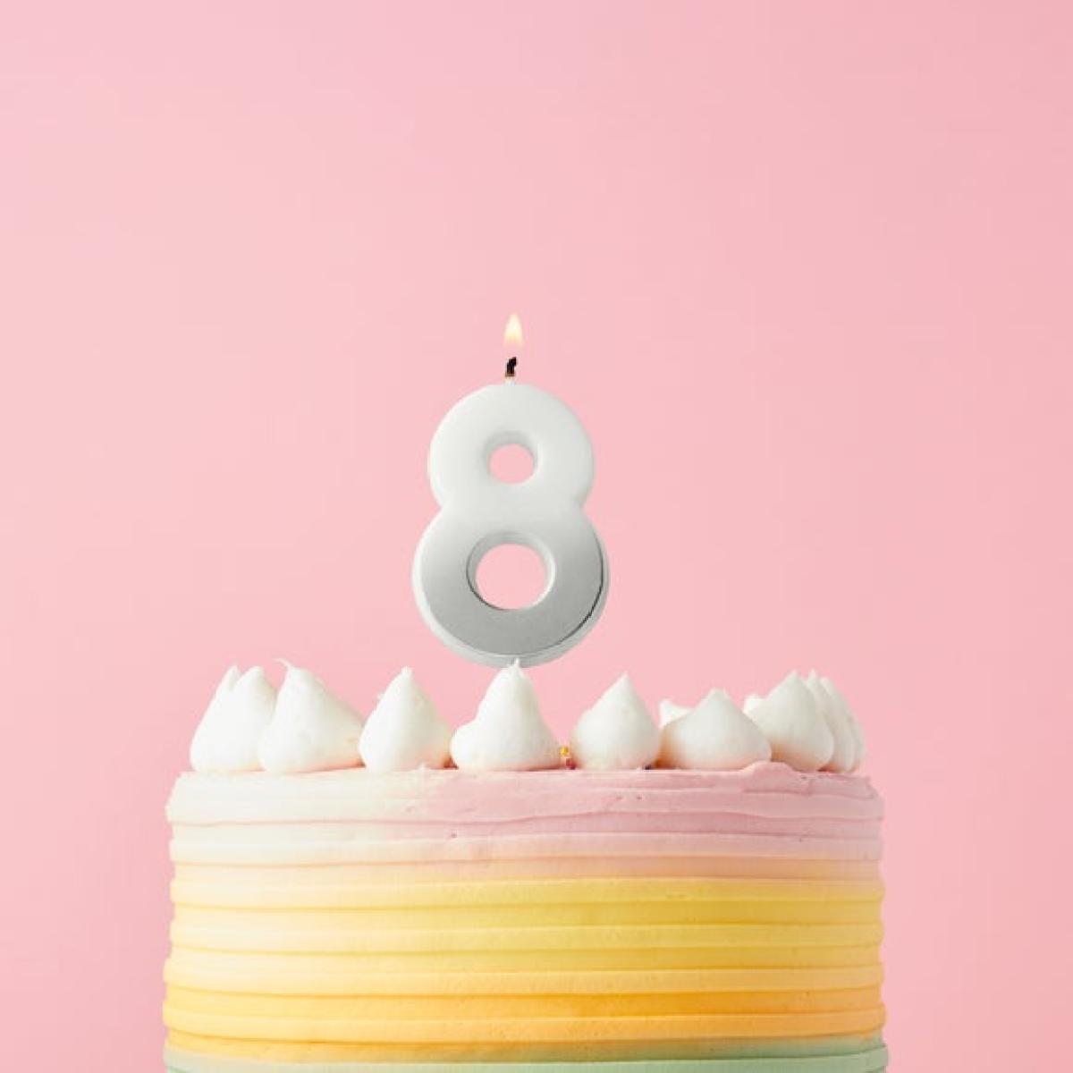 * Stunning silver ombre design * Ideal cake topper size * Slow burning time * Available in other numbers and colours Top off your cake in shimmering style with our Silver Ombre Number '8' Candle. Featuring a stunning ombre finish and slow-burning design, it’s the perfect size for birthday cakes and is available in other numbers and colours to suit any celebration.