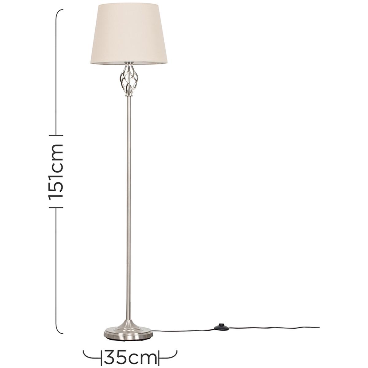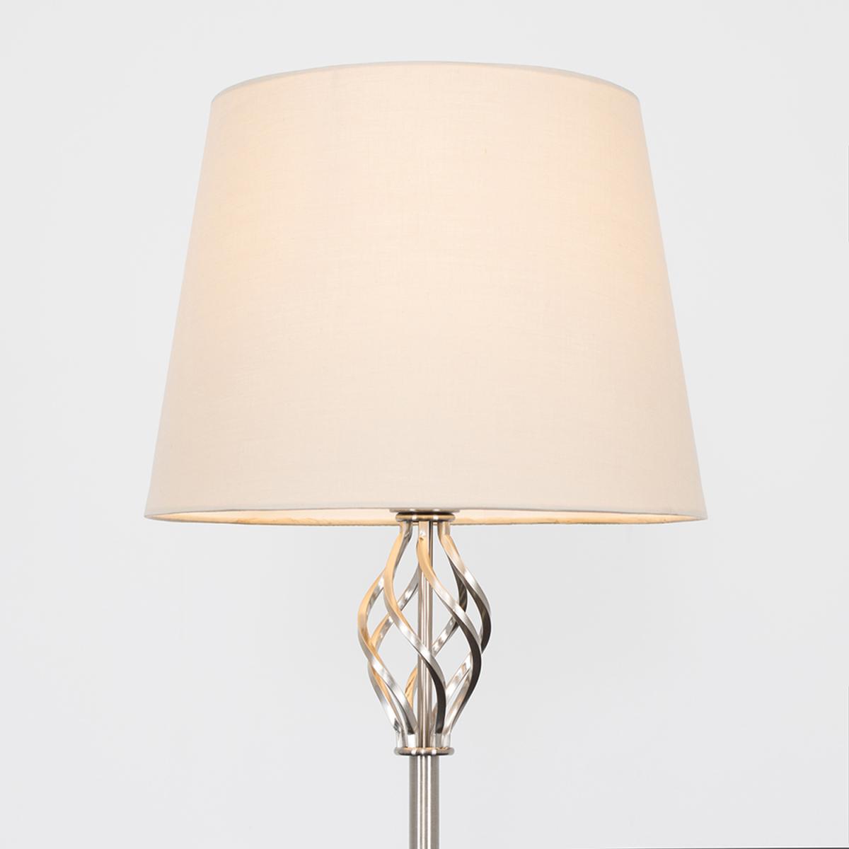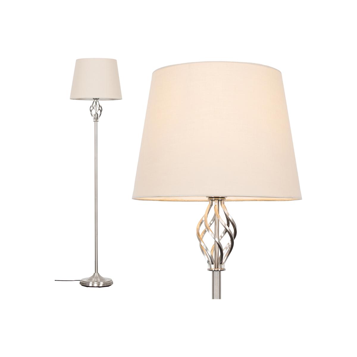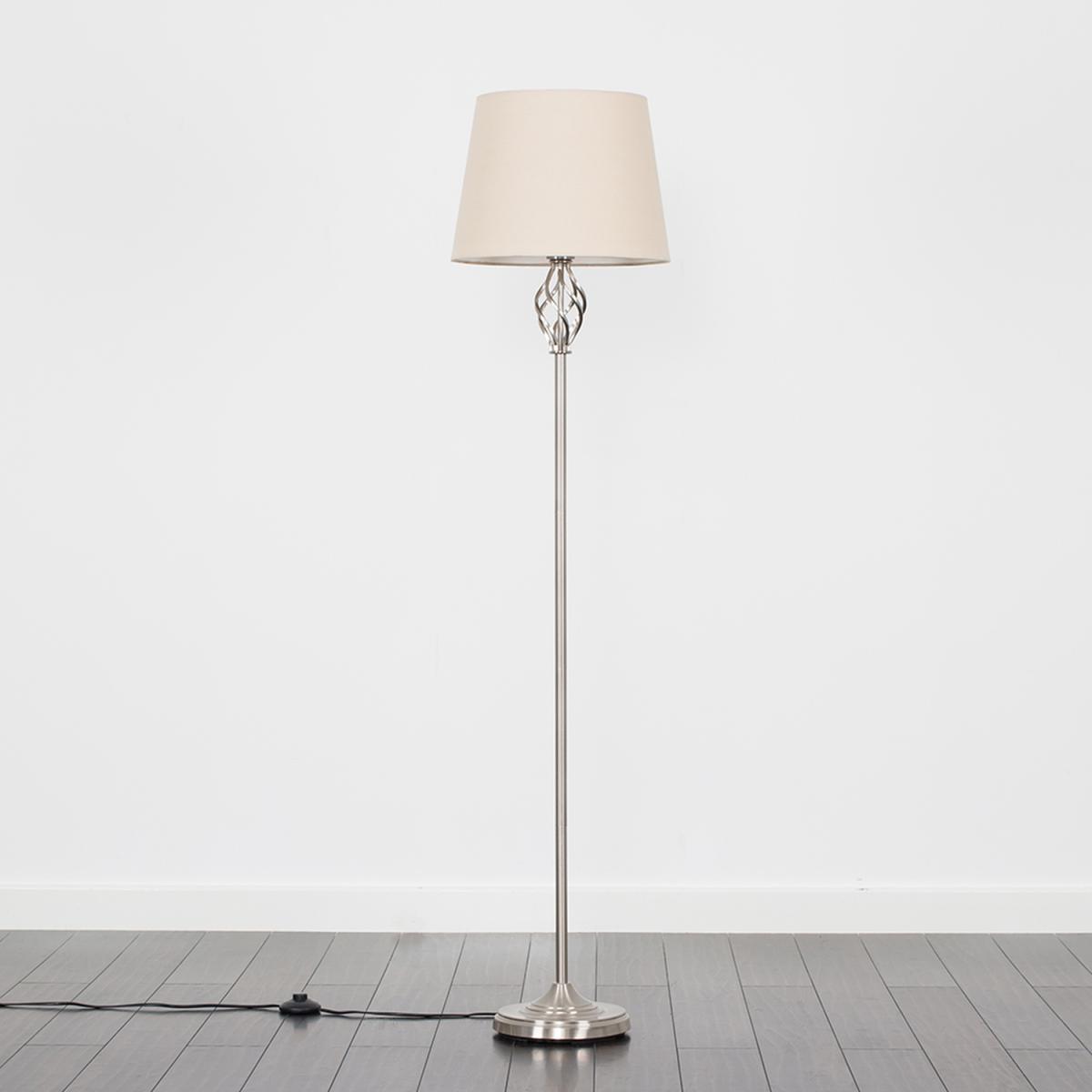 Traditional style barley twist floor lamp in a satin nickel metal finish. Complete with a beige tapered light shade. This floor lamp will make a great addition to any room in your home. Its twist design matches most interiors whether modern or traditional. Floor lamps are a great way to bring additional lighting to a room or you can use them reduce your main light output, and create a more relaxing moodatmosphere.