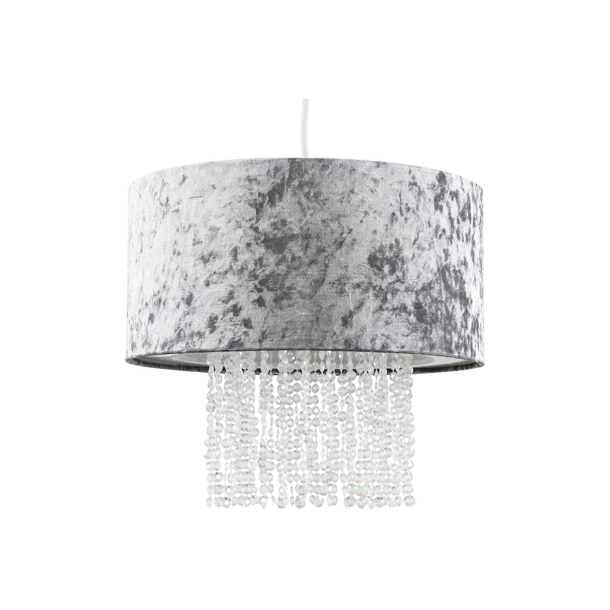 Modern cylinder ceiling pendant light shade in a silver grey velvet finish, which features clear acrylic jewel droplets which cast subtle patterns around the room when lit. Ideal for lounges, dining rooms, bedrooms, hallways and other areas around the home. Easily fits to your existing ceiling lampholder - no electrician required. Ceiling lights are usually the main light source in a room. The right fitting can create a statement and complete your living space look.
