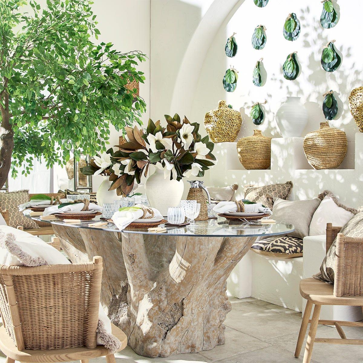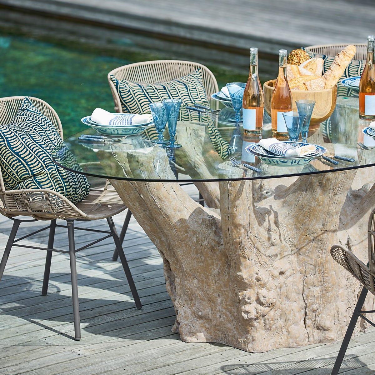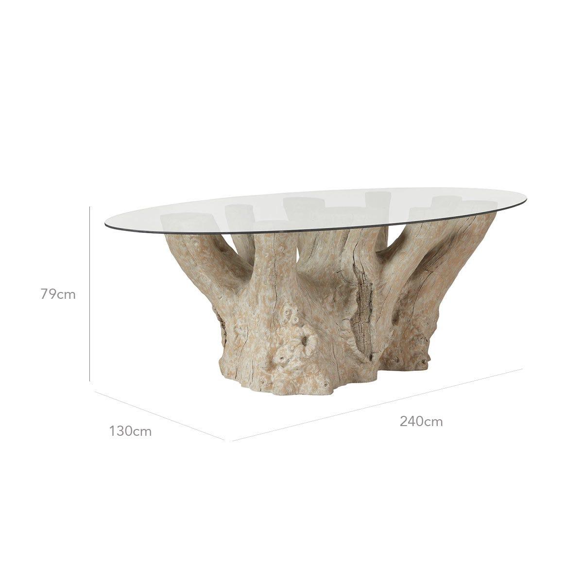 You asked, we answered. After receiving numerous requests to create more oval-shaped dining tables, we designed the Silverstein. Seating ten, the Silverstein's clear glass top contrasts beautifully with its textured resin base. It's perfect for summer dining - be that by a pool, on a terrace or in the middle of a country garden - but it makes as big of a statement when styled indoors. Silverstein Tree Trunk Table - Natural