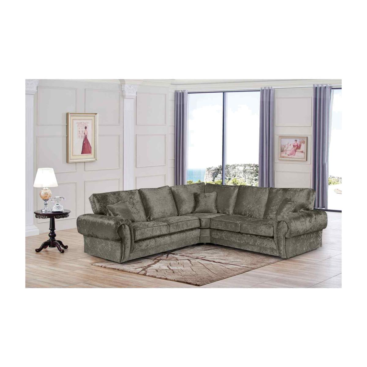 An all-time classic, this stunning corner sofa is now available in a luxurious plush velour fabric, beautifully handmade in the UK using the finest materials. This sofa consists of fullback cushions and 3 scatter cushions. This sofa will add a grand and luxurious look to any living room setting.