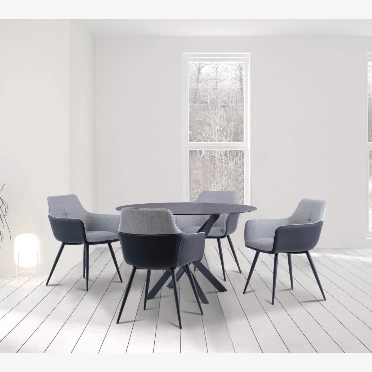 The Silvia round dining set is a simple yet modern and stylish set. The retro design and look of the table is the perfect fit for any home. Featuring a black tinted glass top with black powder coated curved legs. The set is perfectly complimented by the Savoy dining chairs. The chairs are a stunning high end armchair with a textured fabric front, complimented with contrasting faux lether outer. Beautiful detailed contrast stitching provides a refined look. The Silvia round dining set is a simple yet modern and stylish set. The retro design and look of the table is the perfect fit for any home. Featuring a black tinted glass top with black powder coated curved legs. The set is perfectly complimented by the Savoy dining chairs. The chairs are a stunning high end armchair with a textured fabric front, complimented with contrasting faux lether outer. Beautiful detailed contrast stitching provides a refined look.