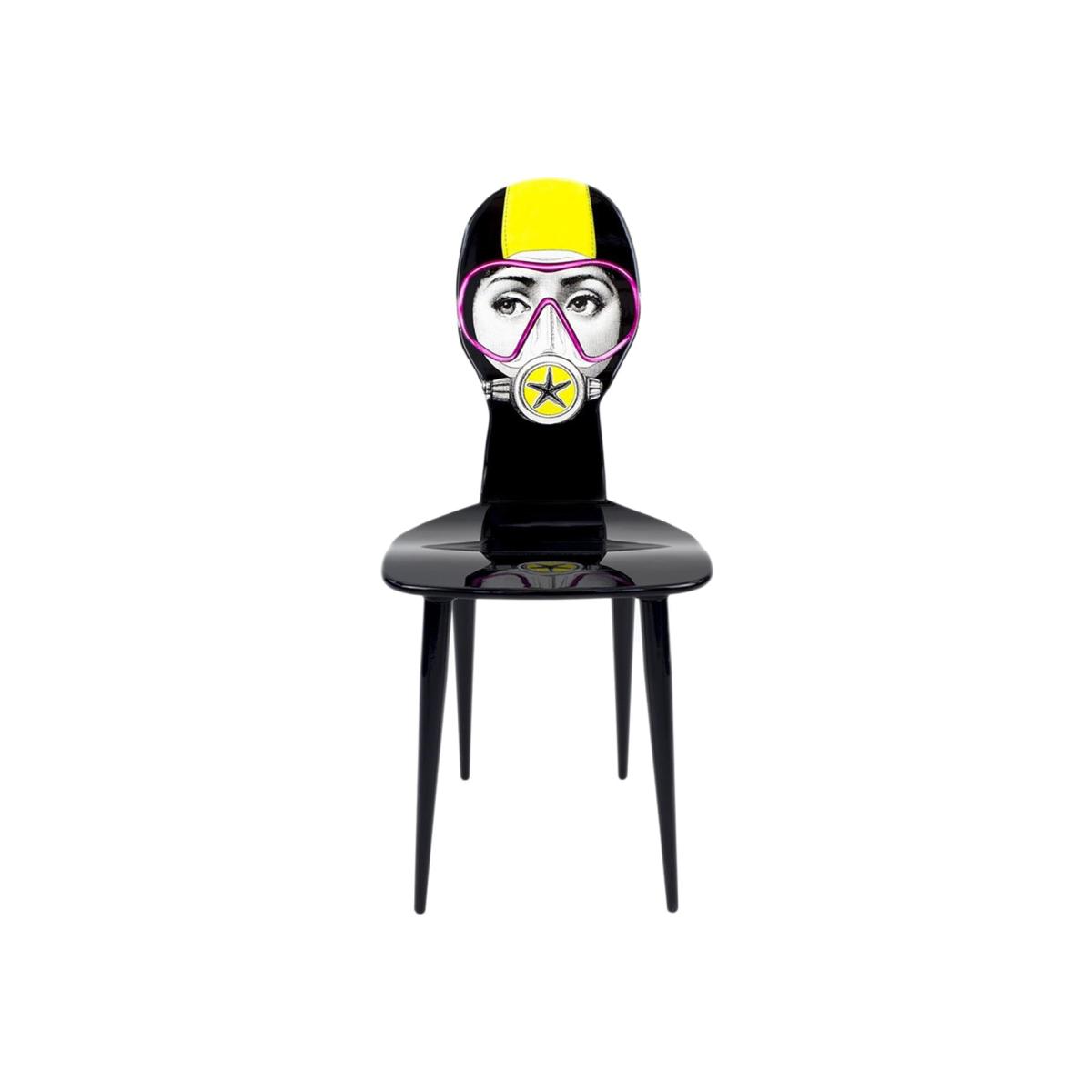 Create an eye-catching statement in any room of the home with this stunning Silviasub chair from Fornasetti. This elegant black chair is finished with a striking backrest featuring the iconic face of opera singer Lina Cavalieri wearing a deep sea diving mask. Perfect for practical use or as an indulgent decorative piece, team with more items available separately from Fornasetti to transform your interior.