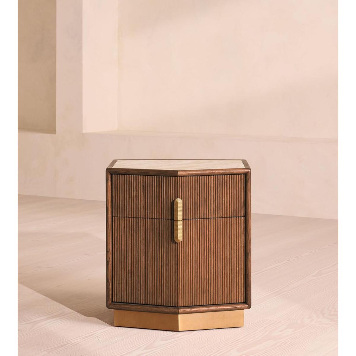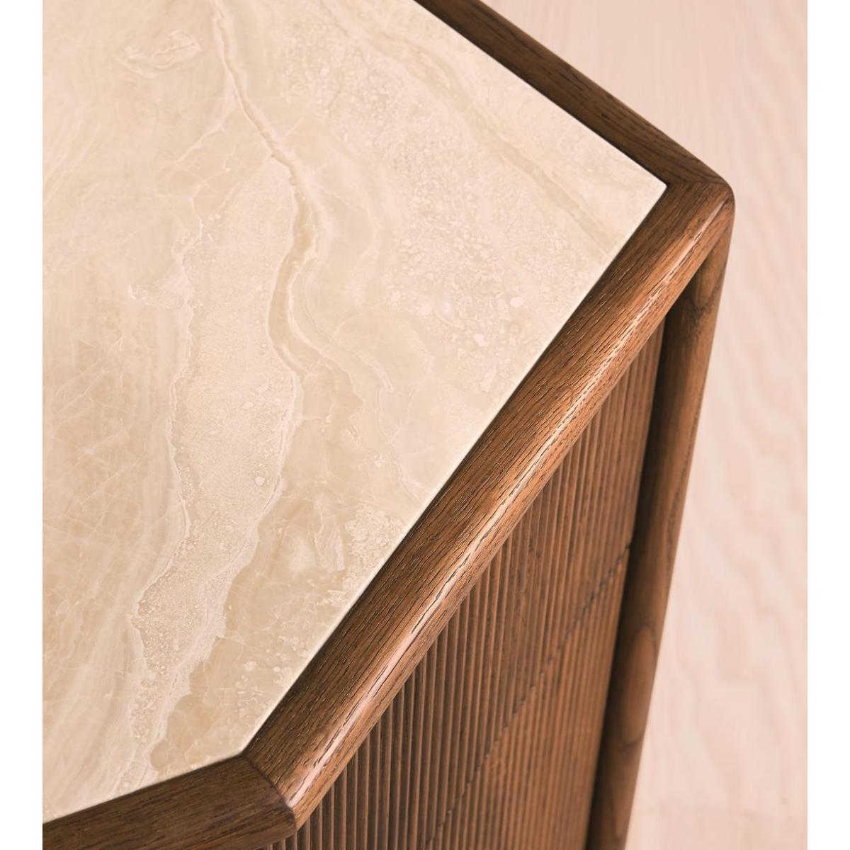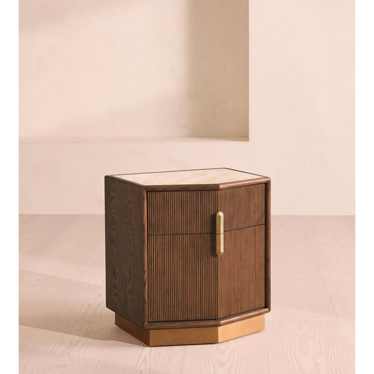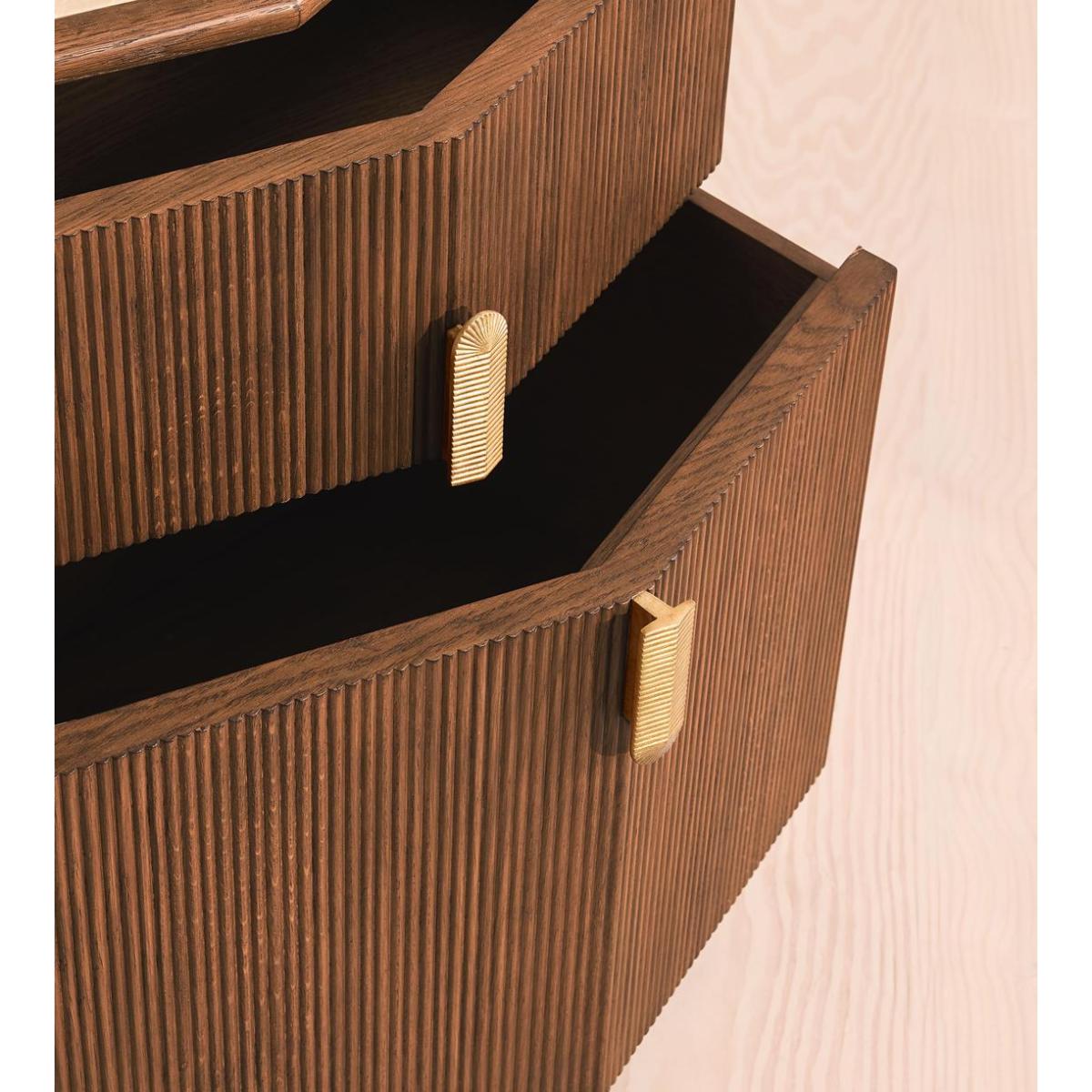 Dark-stained oak wood characterised by micro-reeded detailing creates an angular, prism-shaped silhouette finished with a marble top. Carved from brown oak timber, the Silvio bedside table takes inspiration from the interiors of Soho House Berlin with its angular silhouette. Elevated by a plinth at the base and finished with a marble top sourced from Brazil, it's fitted with two storage drawers characterised by their fluted front.
