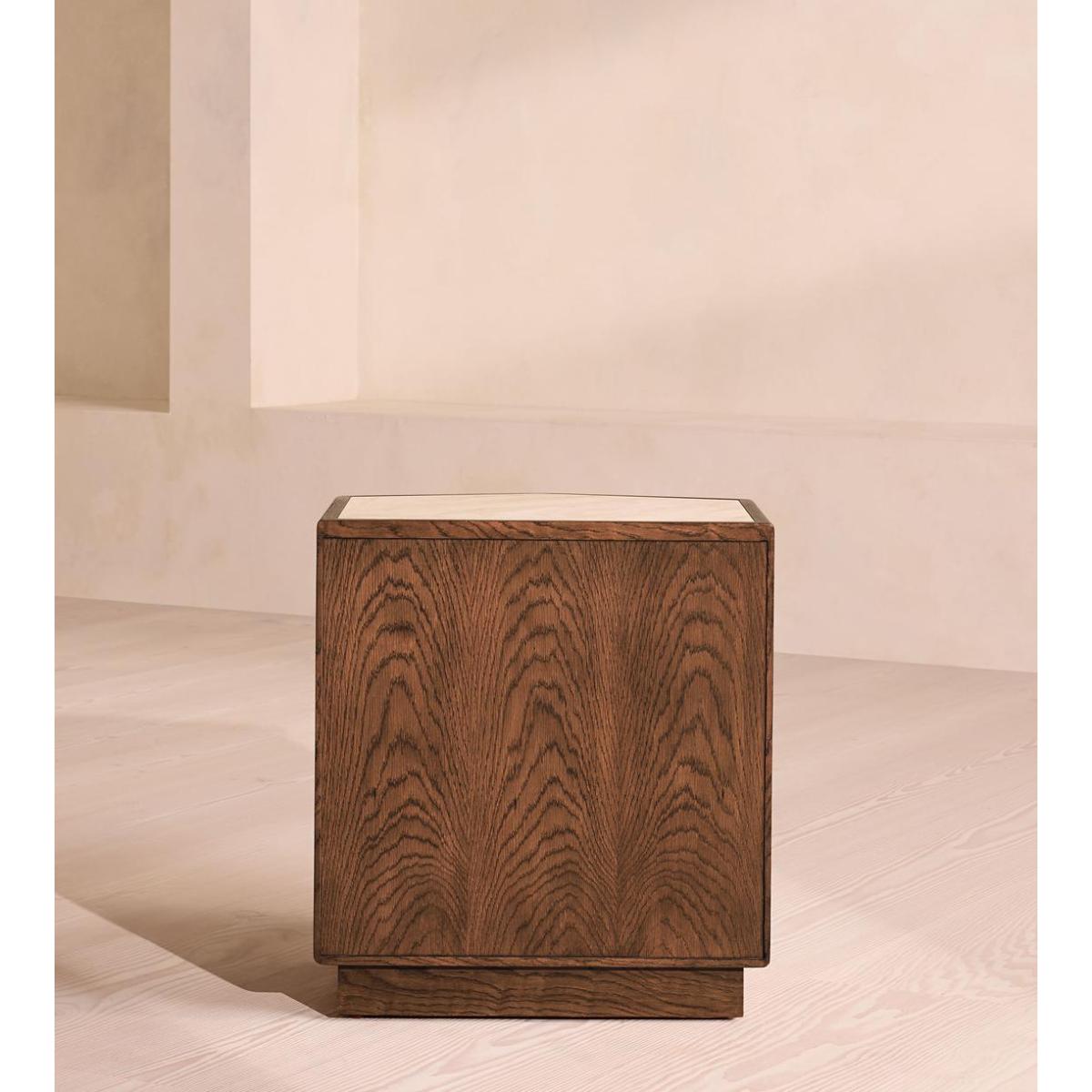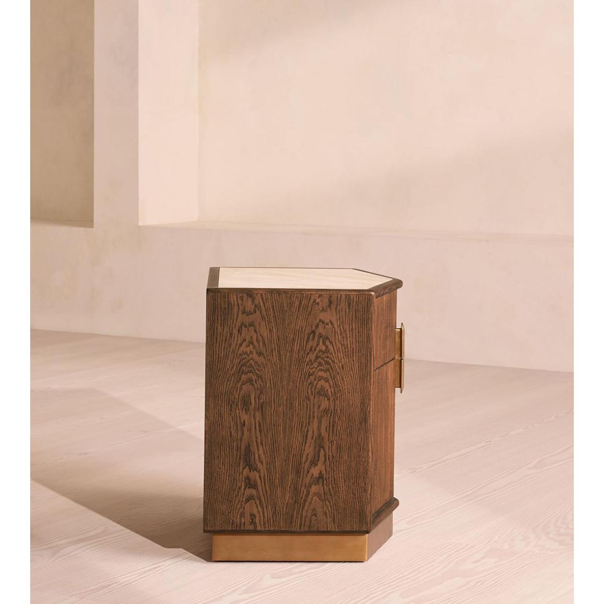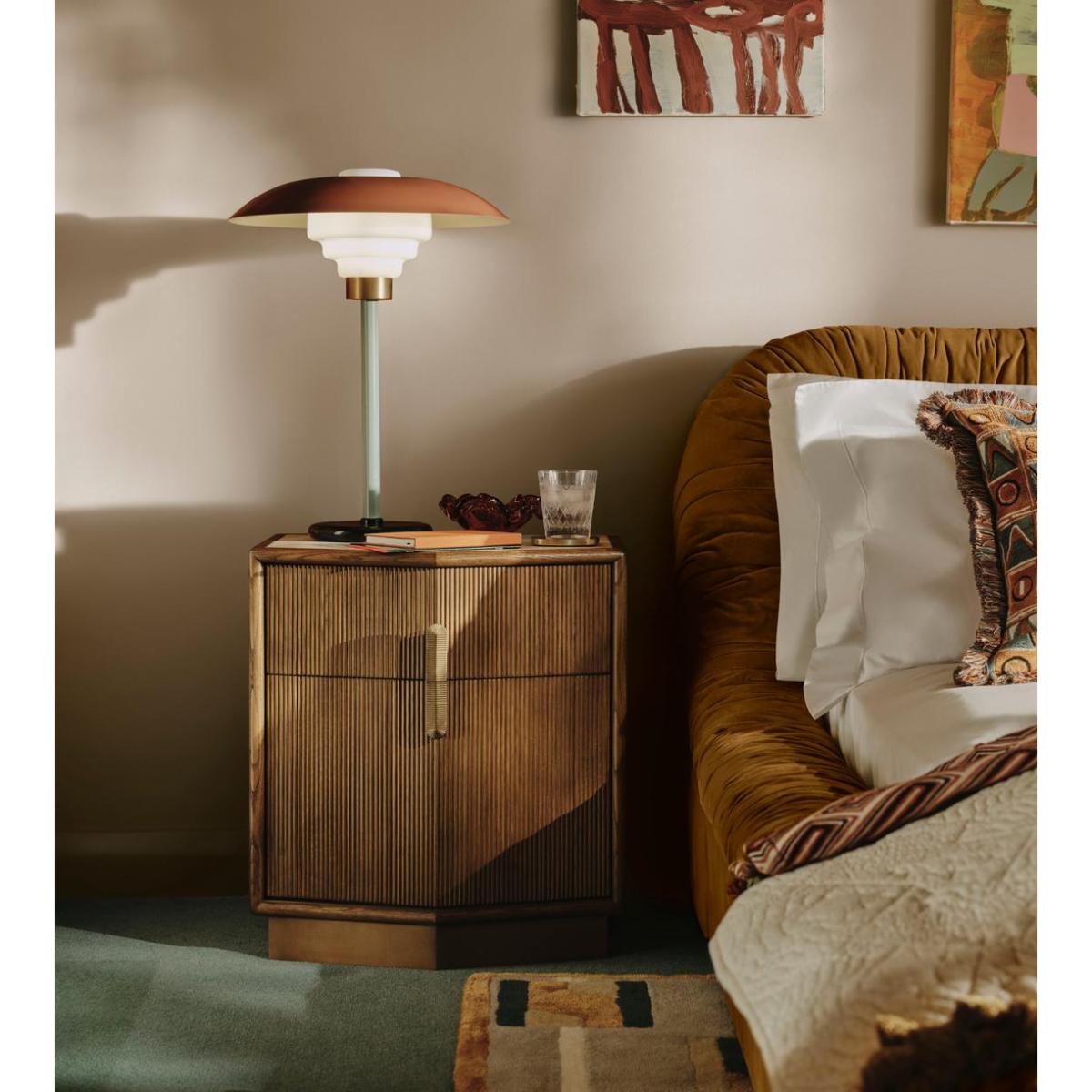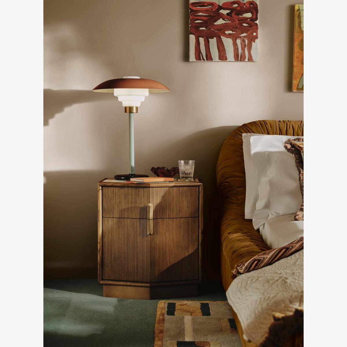 Dark-stained oak wood characterised by micro-reeded detailing creates an angular, prism-shaped silhouette finished with a marble top. Carved from brown oak timber, the Silvio bedside table takes inspiration from the interiors of Soho House Berlin with its angular silhouette. Elevated by a plinth at the base and finished with a marble top sourced from Brazil, it's fitted with two storage drawers characterised by their fluted front.