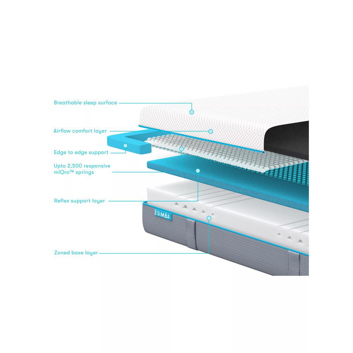 Made in the UK Engineered from innovative, cone-shaped micro pocket springs alongside layers of cushioning foam, Simba’s Hybrid® mattress provides cloud-like support for all sleeper types. Made in the UK, a total of five layers form the hybrid design, which is carefully constructed to enhance airflow for a cool and comfortable night’s sleep. The sleep surface is knitted from a breathable and hypoallergenic fabric and there are 2,500 springs in the king size model. Pocket spring system Manufactured in Leeds from 100% British steel, the patented mi Qro pocket springs are produced in a cone shape. Small and light, each spring is encased in a polyester pocket to provide structure and support across the mattress. They move with each user for an individual response. Open-cell foam layer Simbatex foam makes up the second layer. Developed by Simba, its open-cell structure uses graphite technology to aid air flow through the mattress, to enhance coolness and tackle overheating. Reflex layer and Zoned support base The Reflex support layer moulds to your body shape as you sink into the mattress. It also works to boost the pocket springs to ensure they respond to all sleeper types. The foam base is designed with seven individual zones that provide different levels of support. Supplied rolled in a space-saving box You’ll receive a straightforward manual to guide you through the set up. The mattress is designed with four handles for ease of movement. 200 night trial If you decide this mattress isn’t for you, Simba will arrange for a free collection and refund the cost of your mattress, not including delivery charges. Try before you buy This is an important purchase and it’s worthwhile to try your choice of mattress in store to make sure it's right for you. Our store Partners will be able to tell you more about its benefits, and recommend options based on your needs.