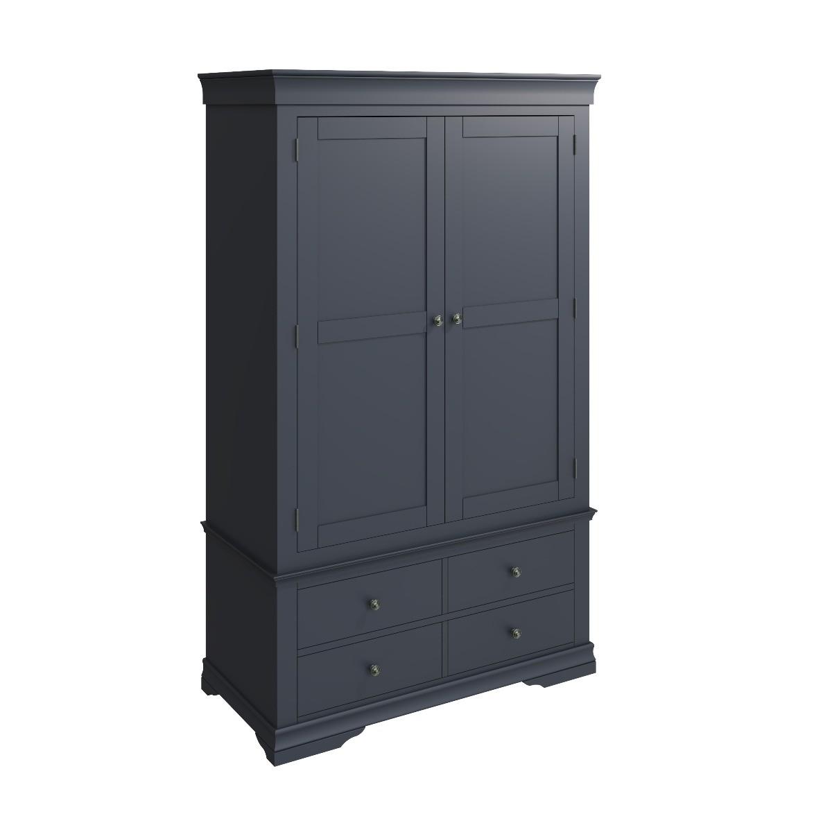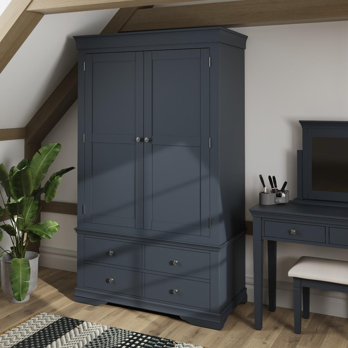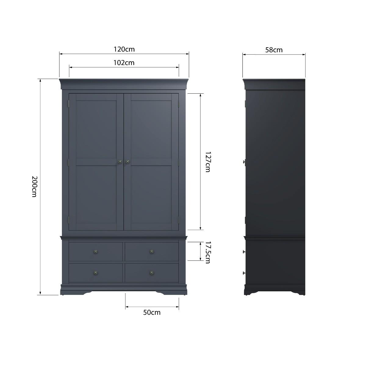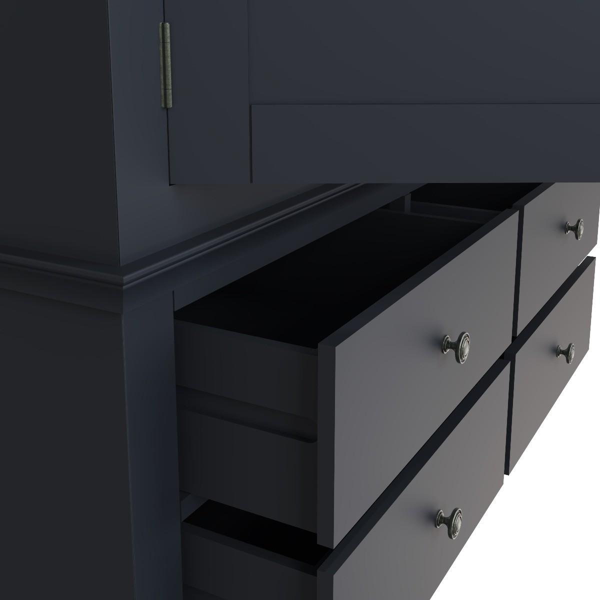 Decorative cornice and dark paint give the Simone collection a sophisticated feel. Solid pine and long-lasting MDF also mean the wardrobe is practical and easy to care for. A full-length hardwood hanging rail provides generous space for clothes whilst the closet adds personality to your bedroom. A robust combination of pine and MDF for prolonged life. Full length hanging rail for clothes. Detailed pewter effect knob handles on both drawers and doors. Finished in a contemporary midnight grey paint