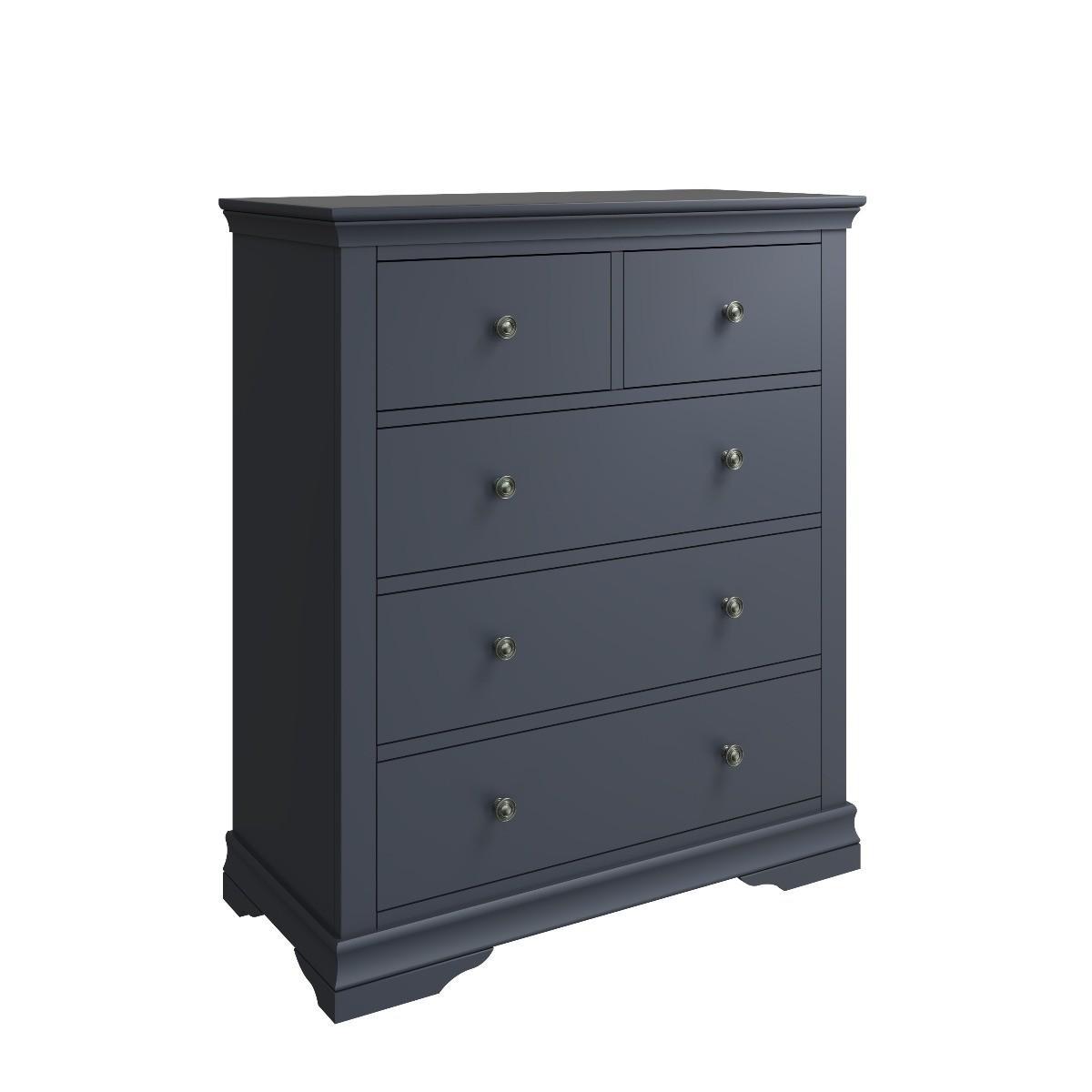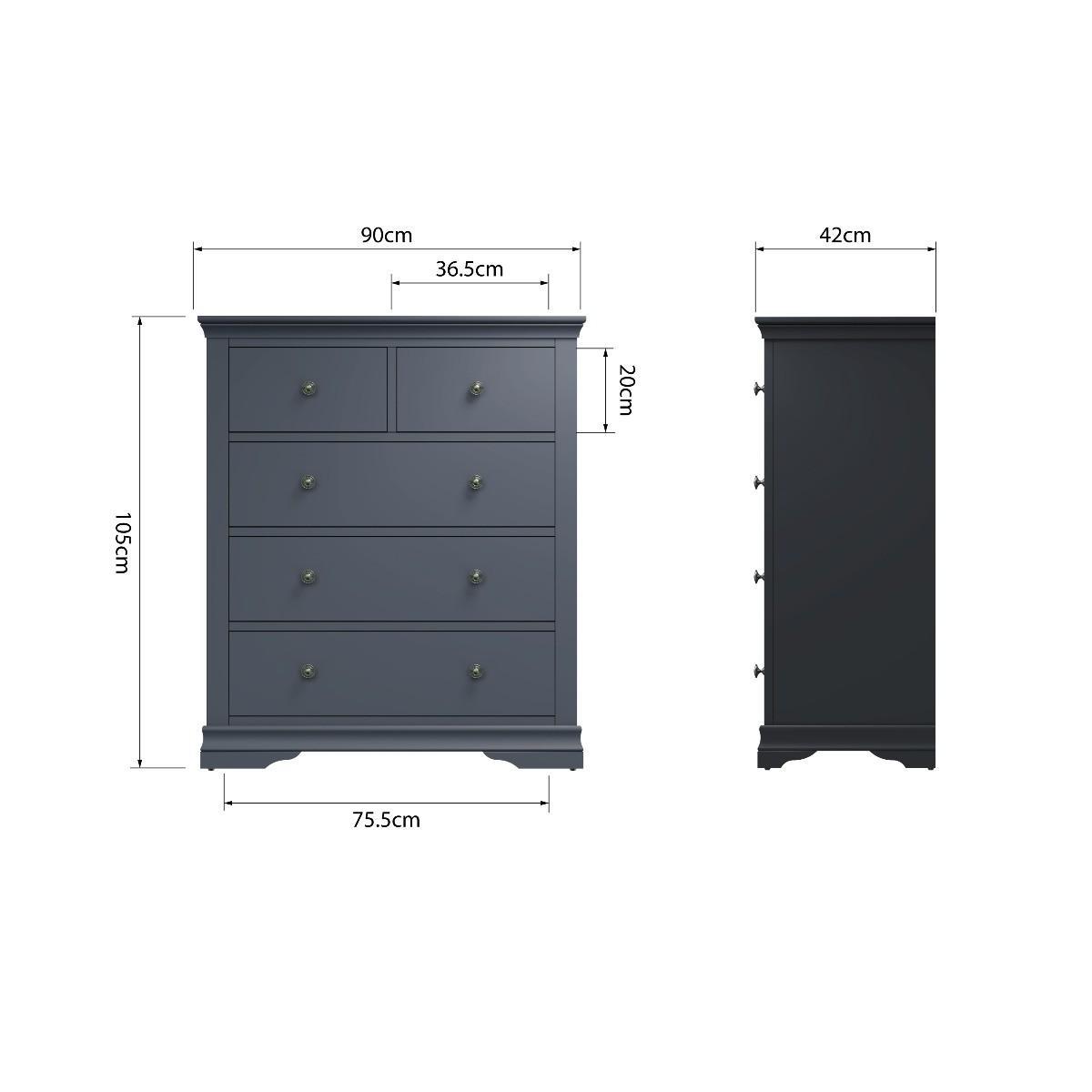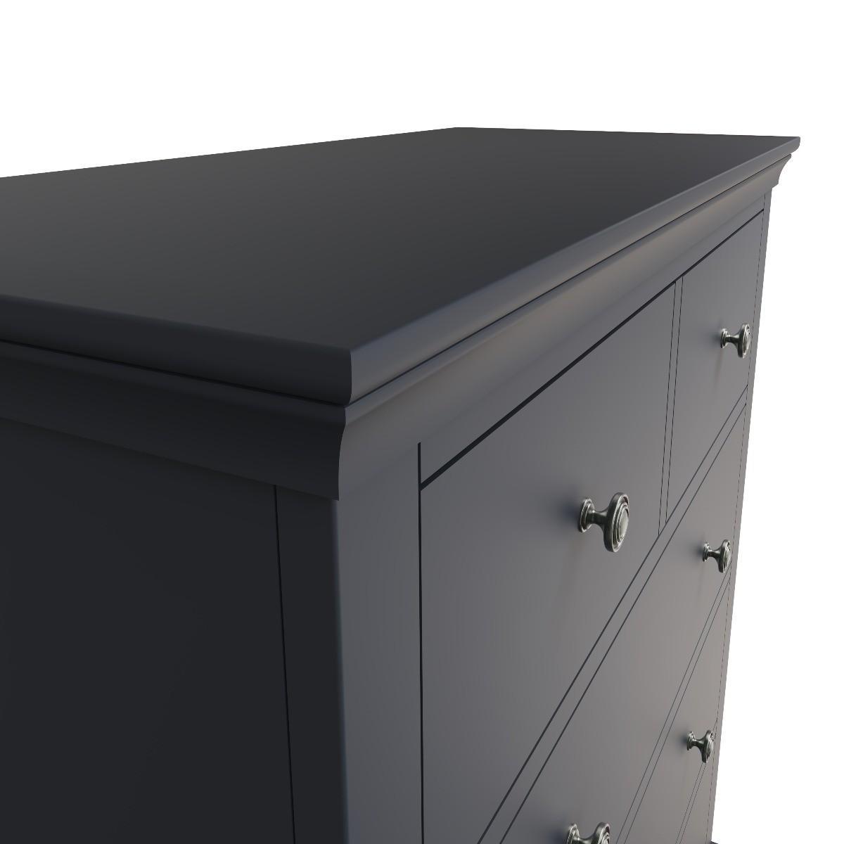 Decorative cornice and dark paint give the Simone collection a sophisticated feel. Solid pine and long-lasting MDF also mean the chests are both practical and easy to care for. Valuable storage for clothes whilst adding true personality to your main or guest bedroom. A robust combination of pine and MDF for prolonged life. Five drawers on wooden runners for easy opening. Detailed pewter effect knob handles. Finished in a contemporary midnight grey pain