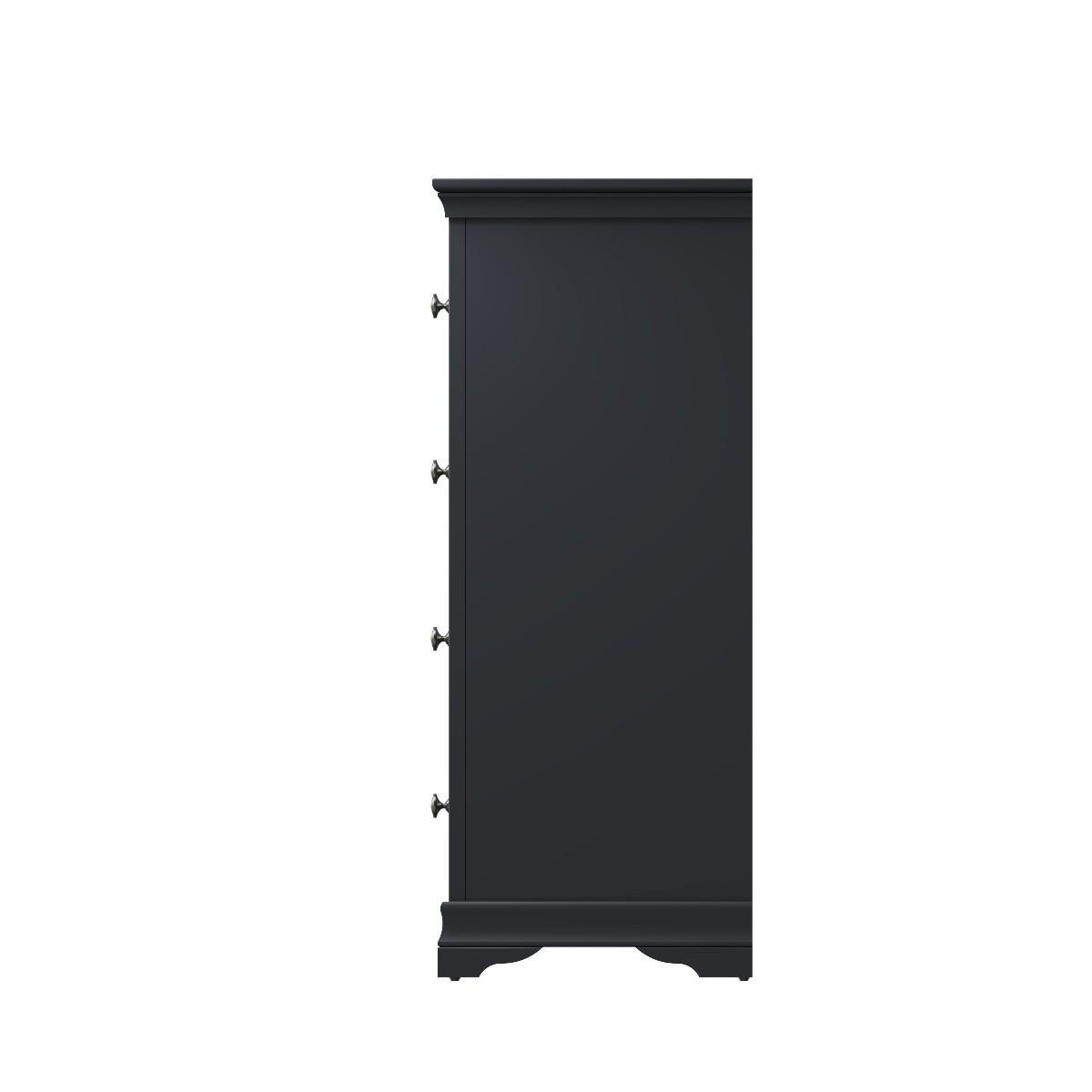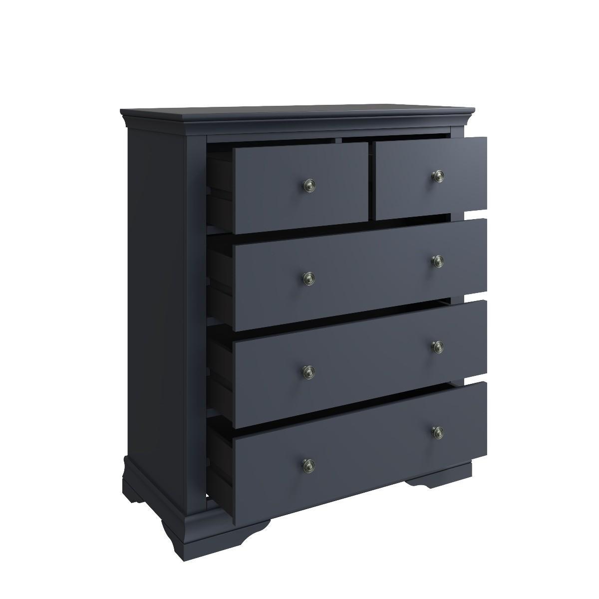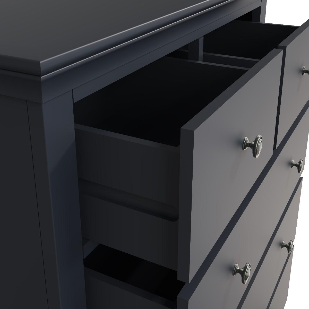 Decorative cornice and dark paint give the Simone collection a sophisticated feel. Solid pine and long-lasting MDF also mean the chests are both practical and easy to care for. Valuable storage for clothes whilst adding true personality to your main or guest bedroom. A robust combination of pine and MDF for prolonged life. Five drawers on wooden runners for easy opening. Detailed pewter effect knob handles. Finished in a contemporary midnight grey pain