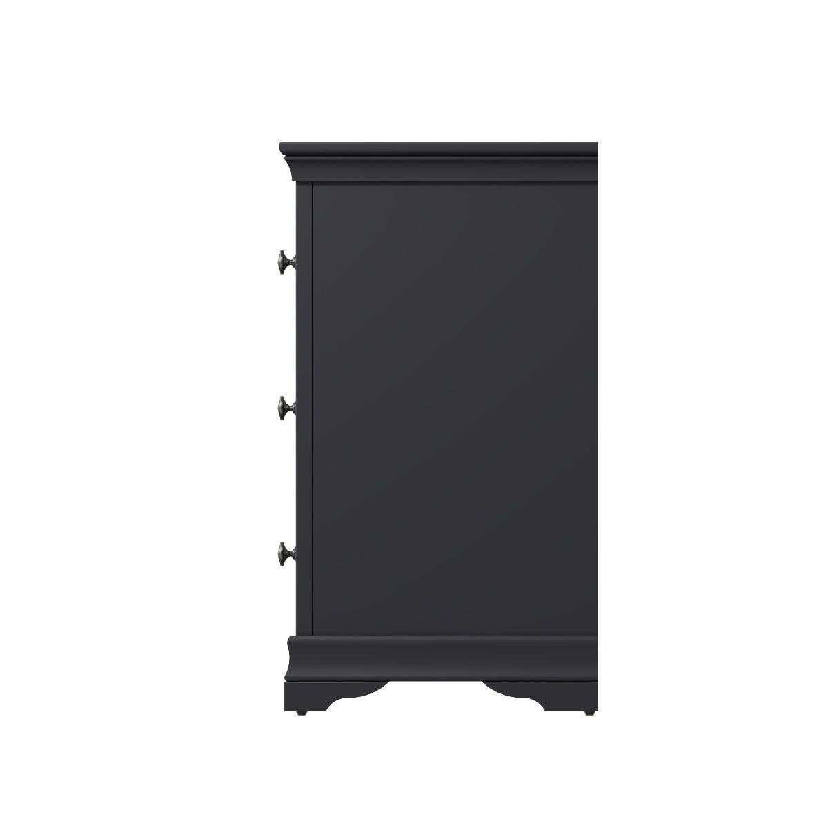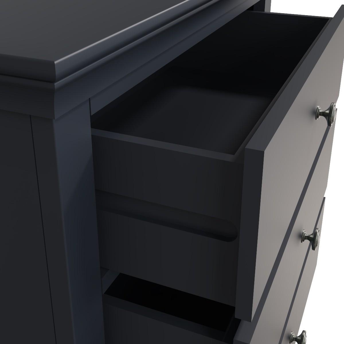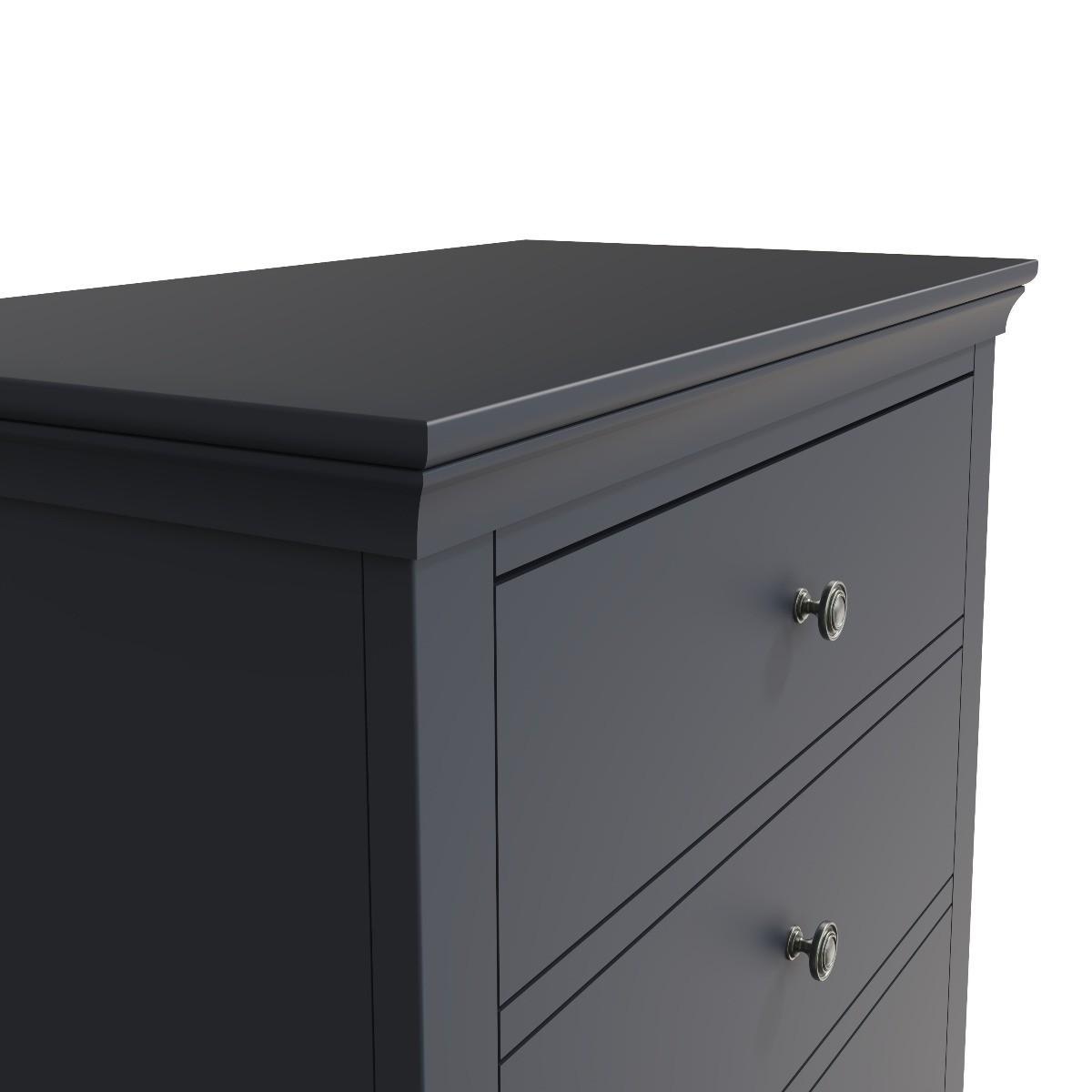 Decorative cornice and dark paint give the Simone collection a sophisticated feel. Solid pine and long-lasting MDF also mean the chests are both practical and easy to care for. Valuable storage for clothes whilst adding true personality to your main or guest bedroom. A robust combination of pine and MDF for prolonged life. Five drawers on wooden runners for easy opening. Detailed pewter effect knob handles. Finished in a contemporary midnight grey paint