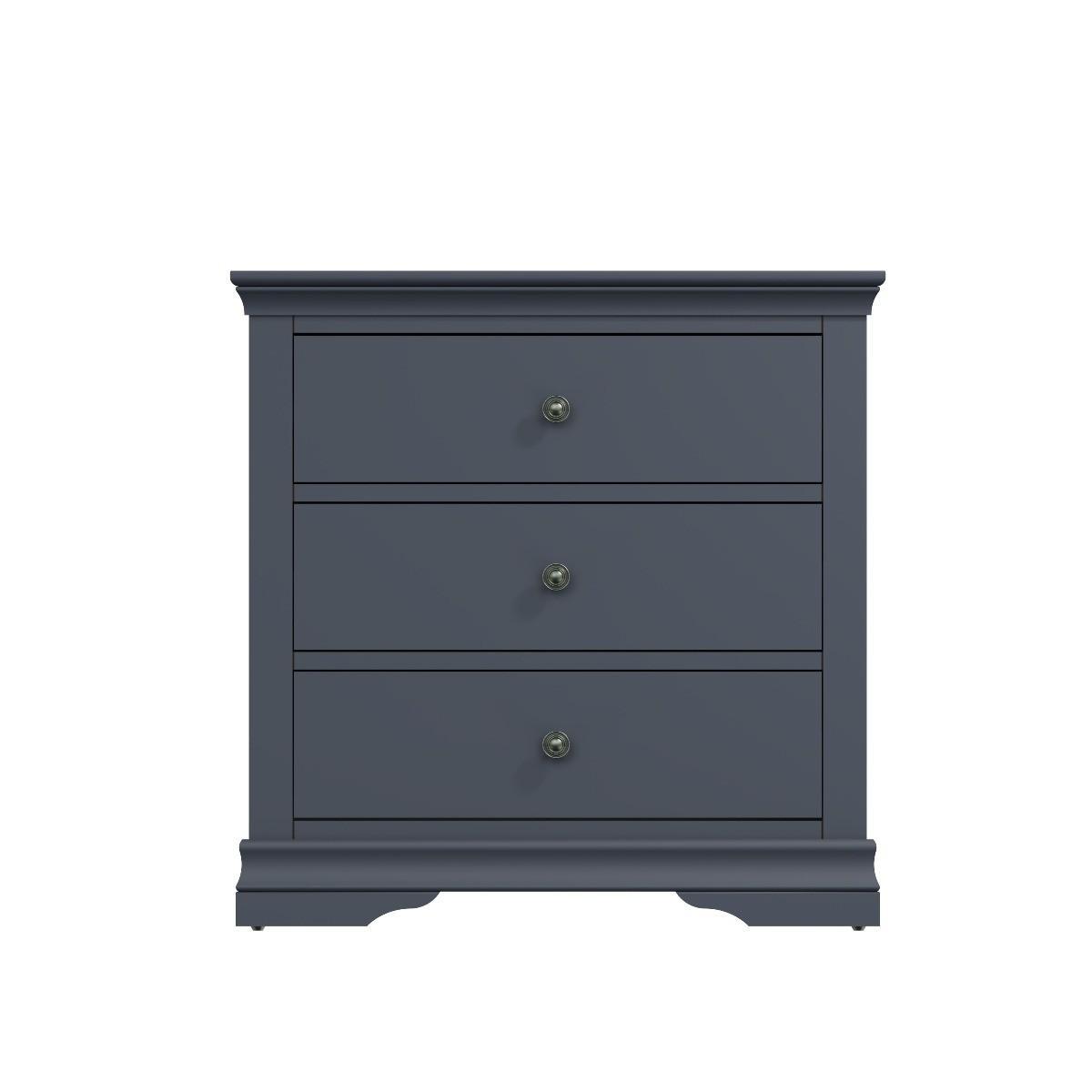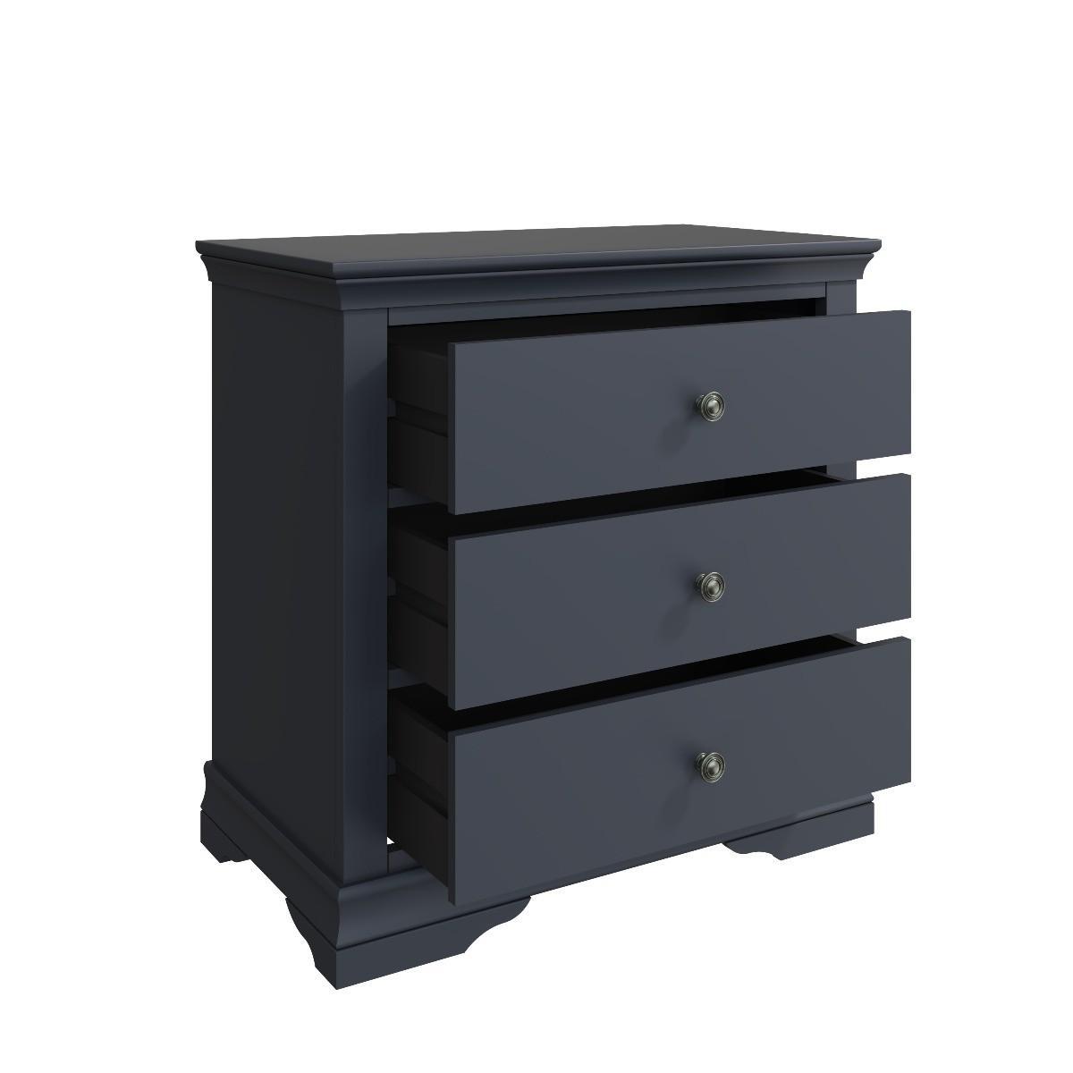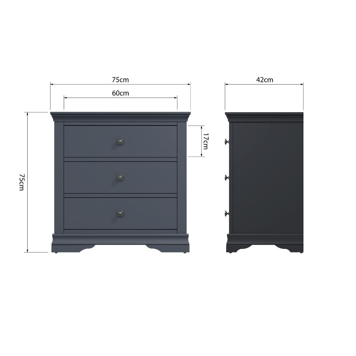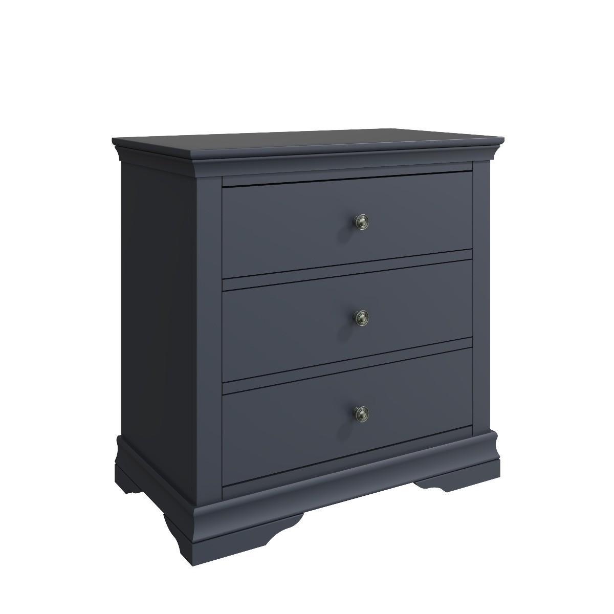 Decorative cornice and dark paint give the Simone collection a sophisticated feel. Solid pine and long-lasting MDF also mean the chests are both practical and easy to care for. Valuable storage for clothes whilst adding true personality to your main or guest bedroom. A robust combination of pine and MDF for prolonged life. Five drawers on wooden runners for easy opening. Detailed pewter effect knob handles. Finished in a contemporary midnight grey paint