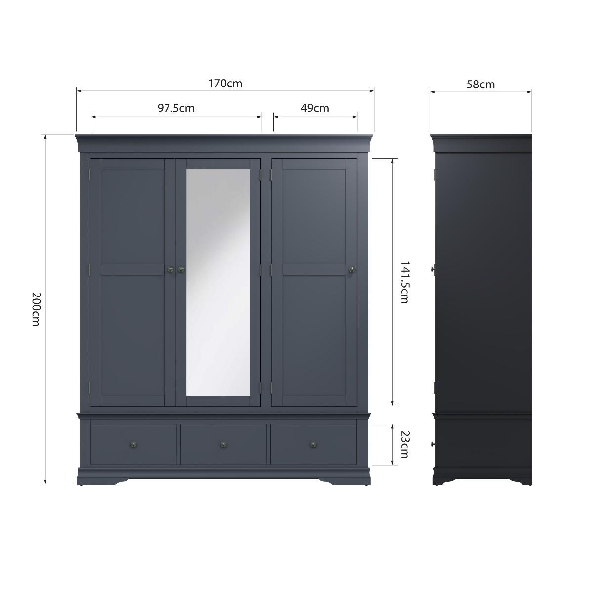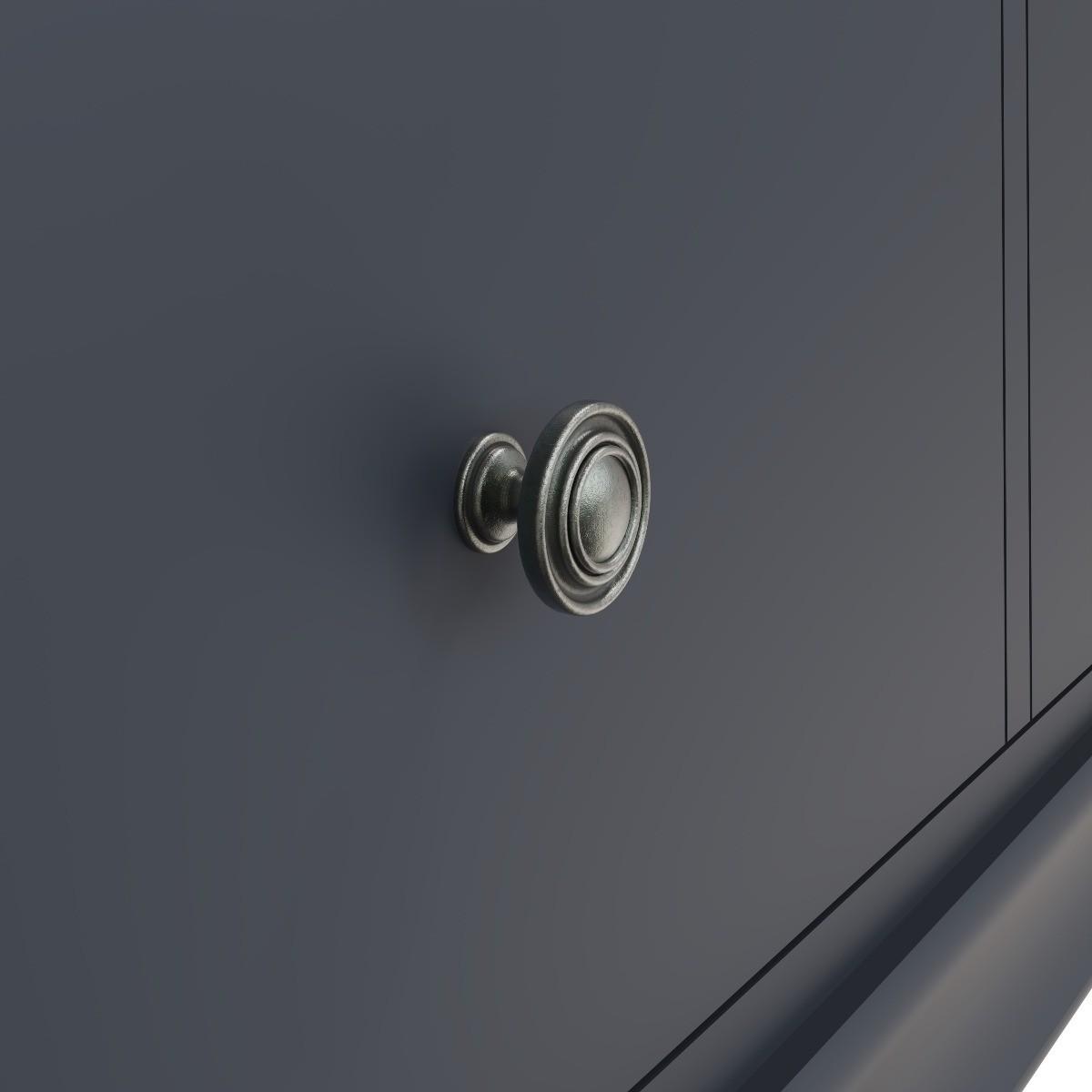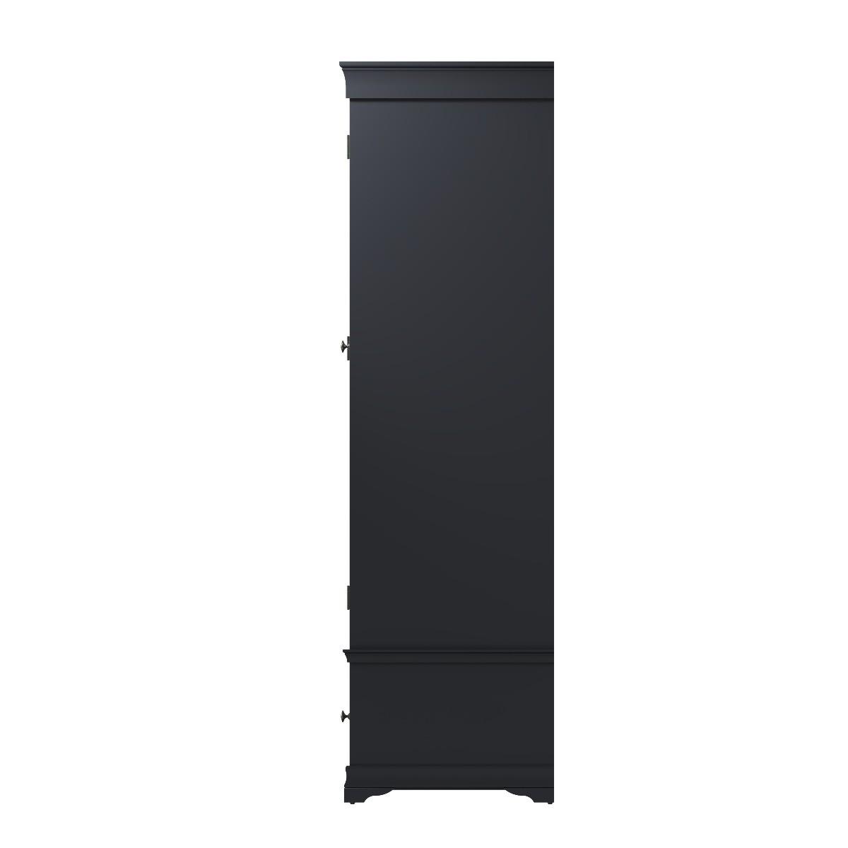 Decorative cornice and dark paint give the Simone collection a sophisticated feel. Solid pine and long-lasting MDF also mean the wardrobe is practical and easy to care for. A full-length hardwood hanging rail provides generous space for clothes whilst the closet adds personality to your bedroom. A robust combination of pine and MDF for prolonged life. Full length hanging rail for clothes. Detailed pewter effect knob handles on three drawers and doors. Finished in a contemporary midnight grey paint
