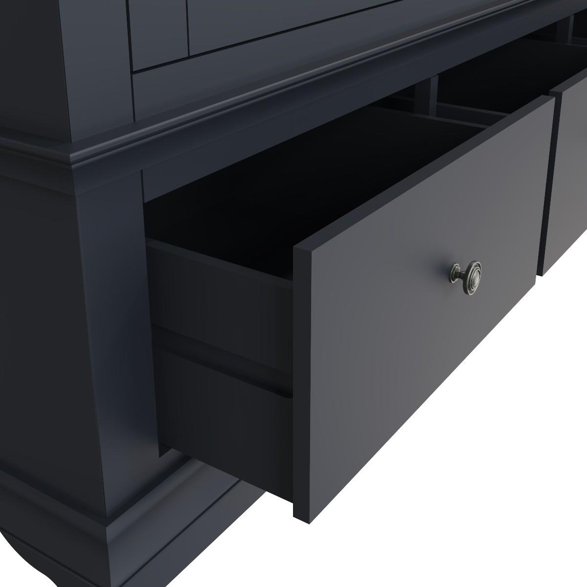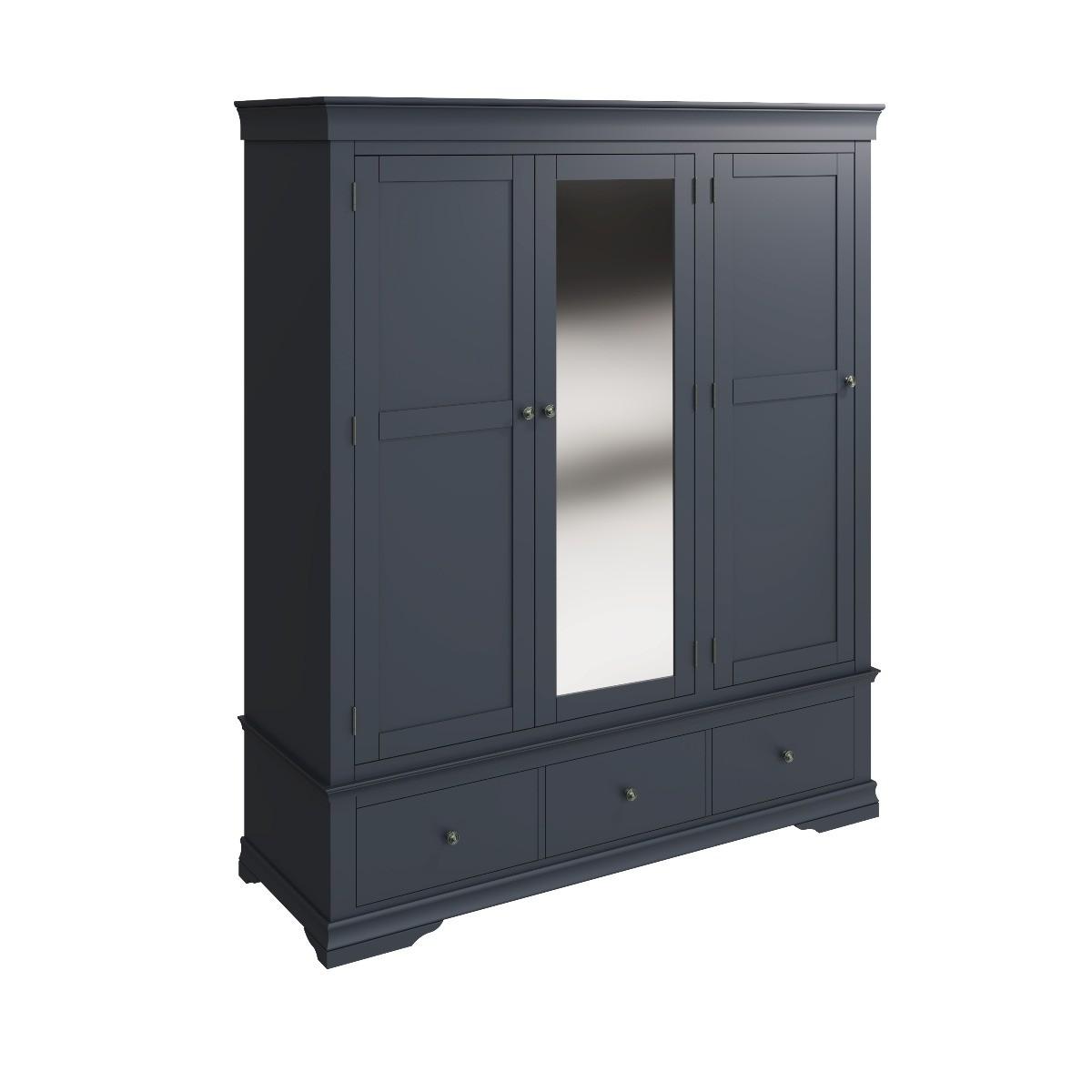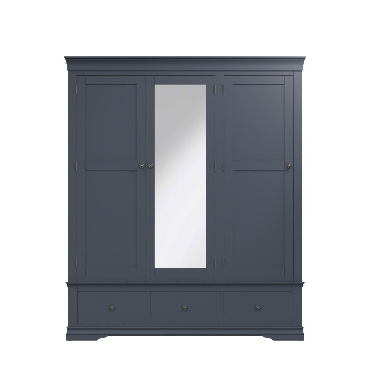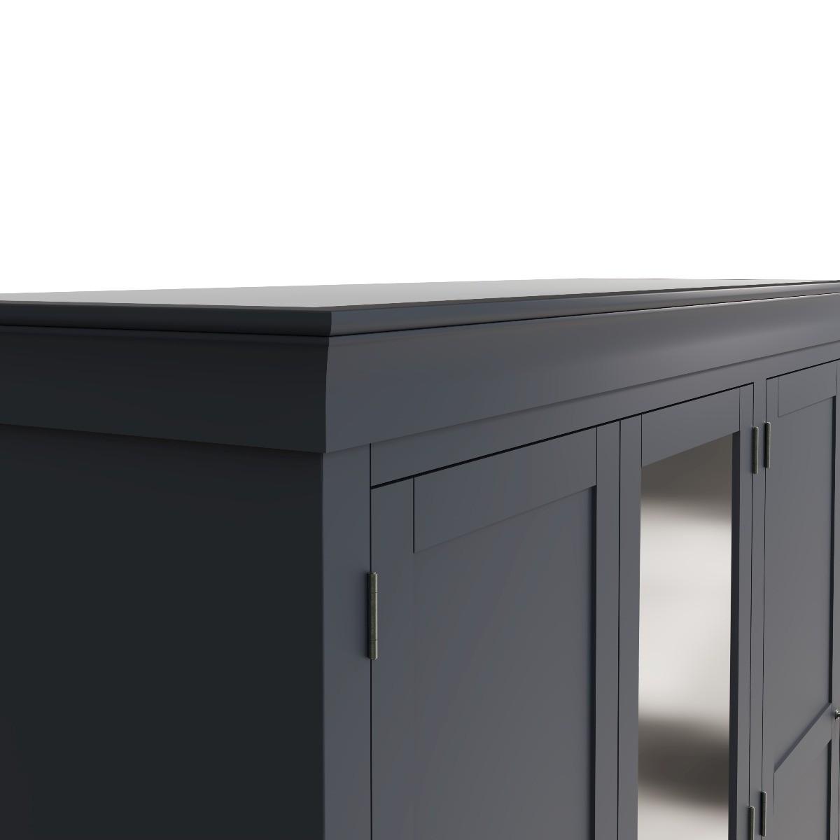 Decorative cornice and dark paint give the Simone collection a sophisticated feel. Solid pine and long-lasting MDF also mean the wardrobe is practical and easy to care for. A full-length hardwood hanging rail provides generous space for clothes whilst the closet adds personality to your bedroom. A robust combination of pine and MDF for prolonged life. Full length hanging rail for clothes. Detailed pewter effect knob handles on three drawers and doors. Finished in a contemporary midnight grey paint