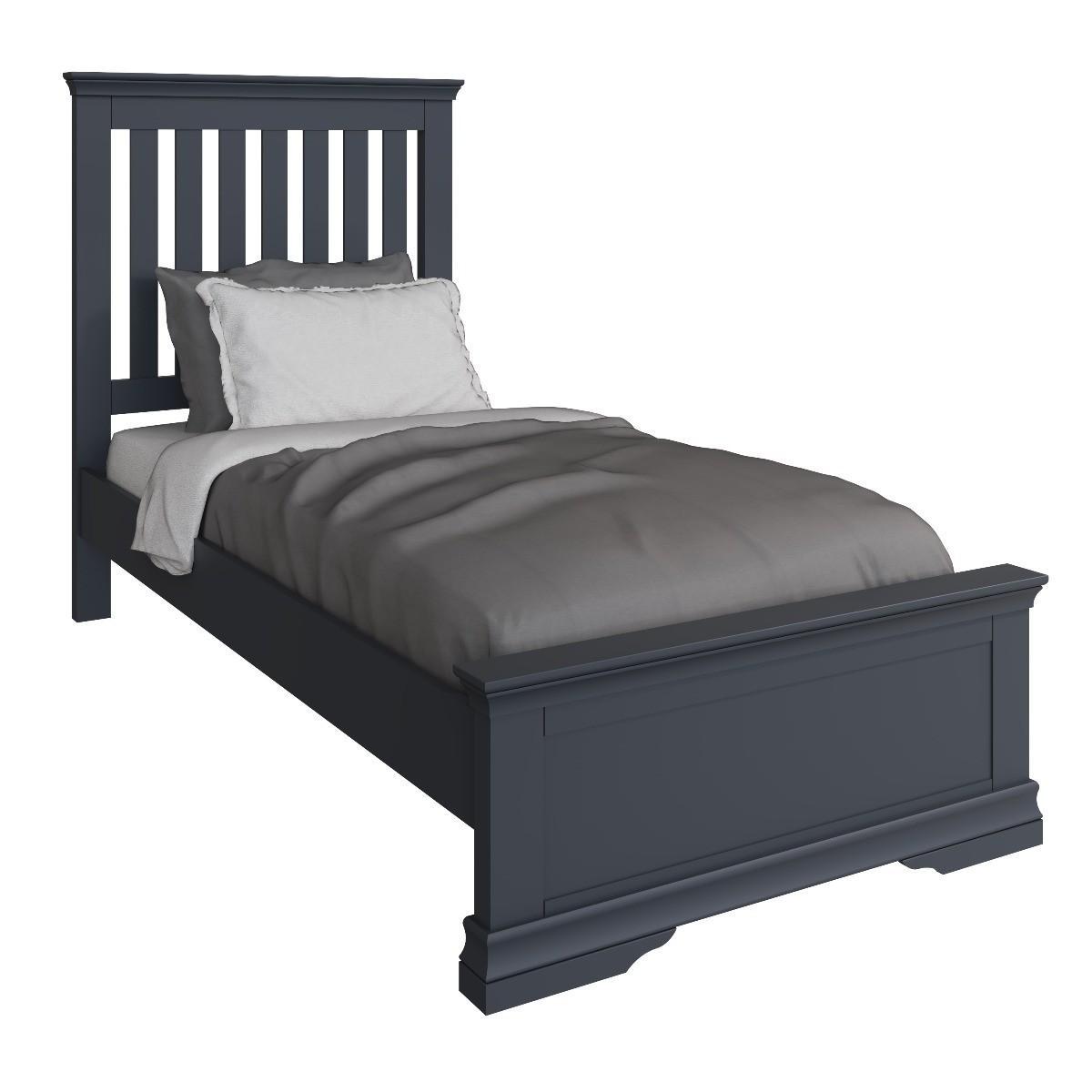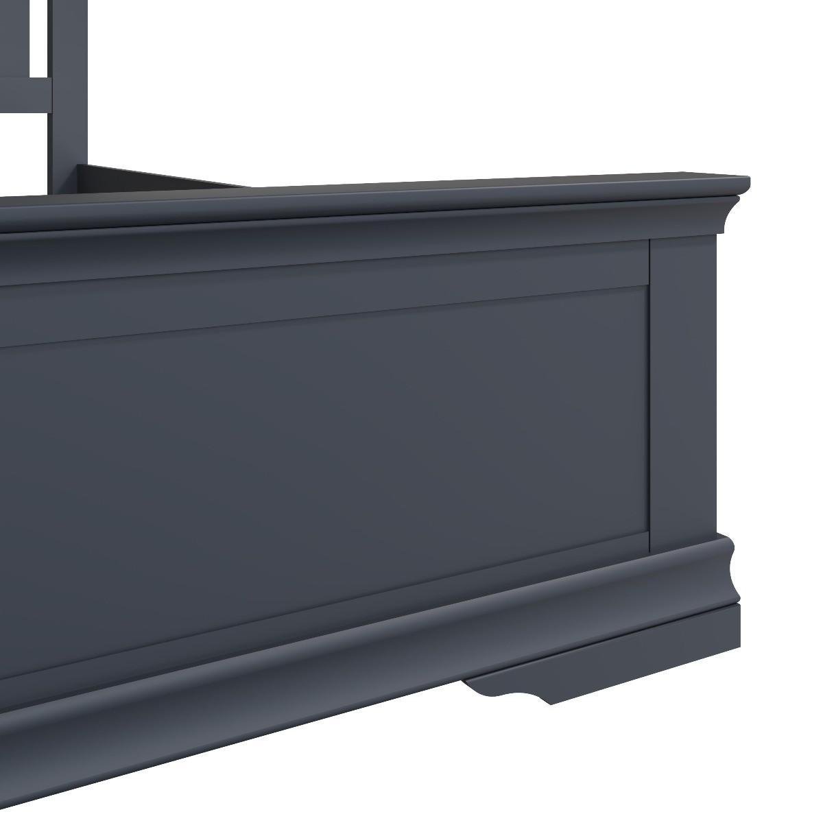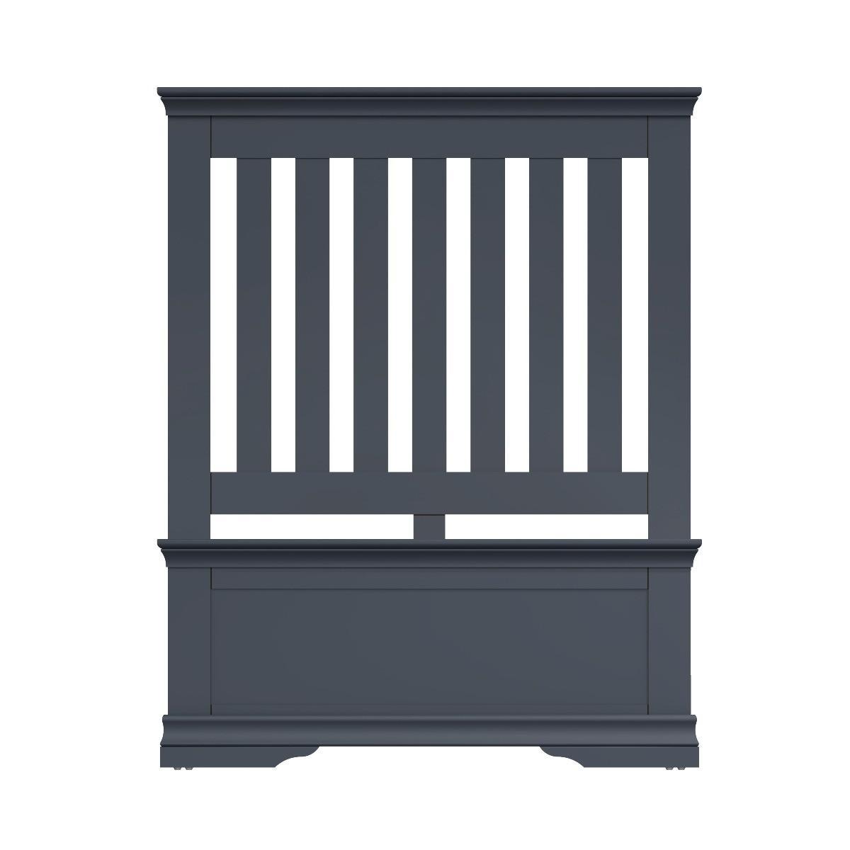 Decorative cornice and dark paint give the Simone collection a sophisticated feel. Solid pine and long-lasting MDF also mean the beds are both practical and easy to care for. A sturdy wooden slatted headboard provides support and style whilst adding true personality to your main or guest bedroom. A robust combination of pine and MDFHigh headboard with wooden slats. Available in single, double and king size. Finished in a contemporary midnight grey paint