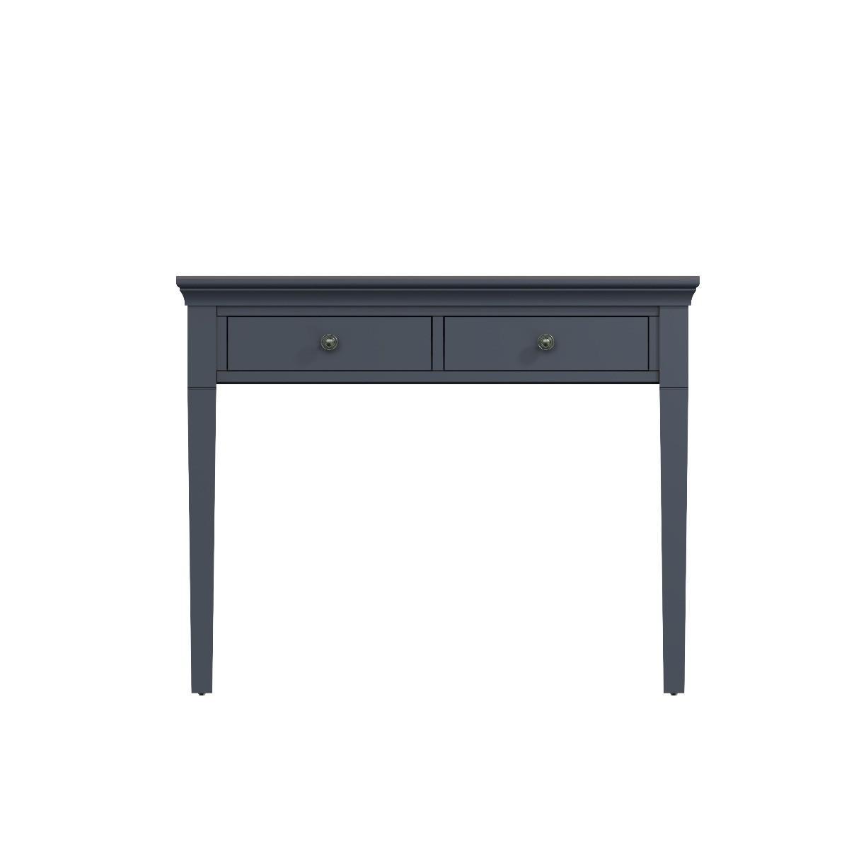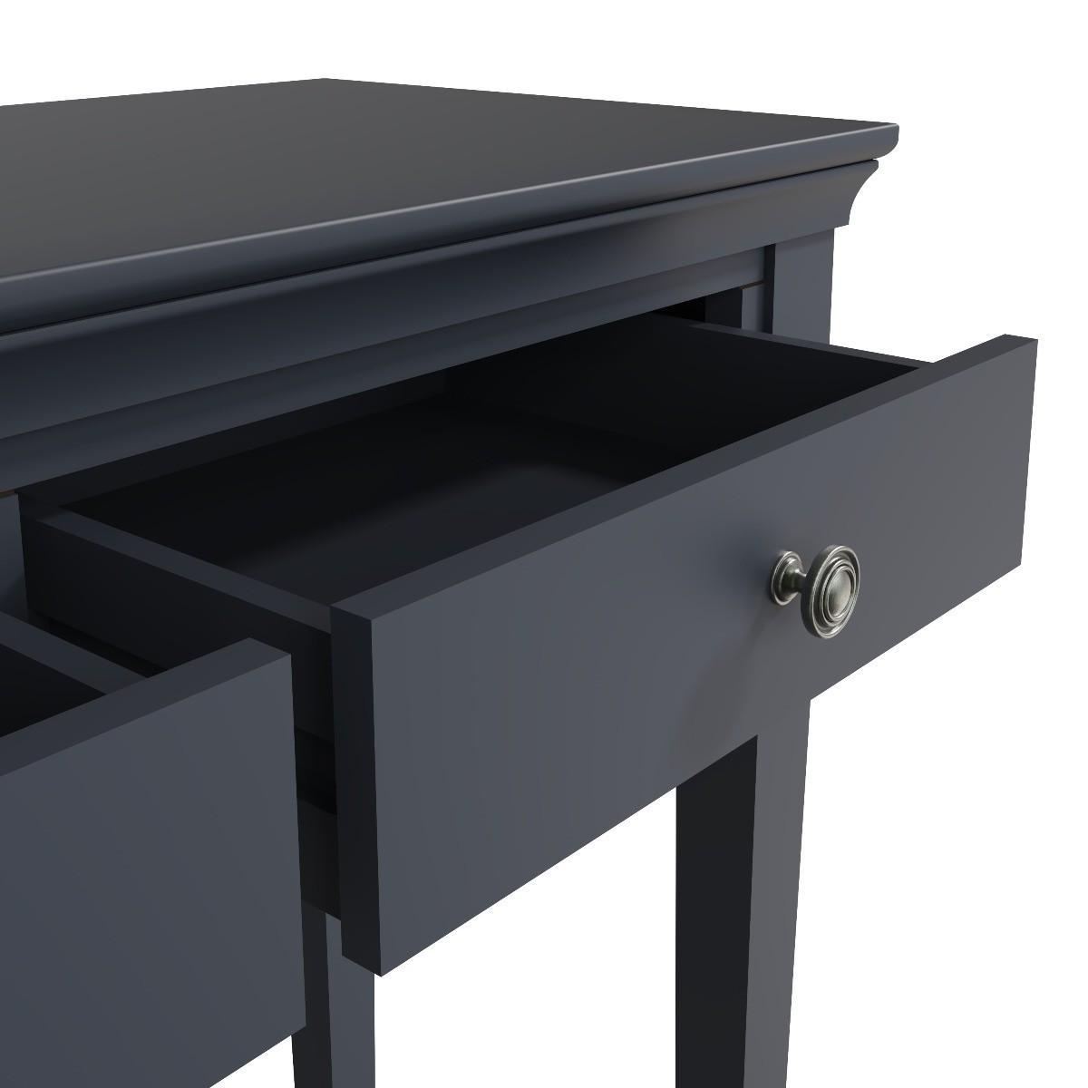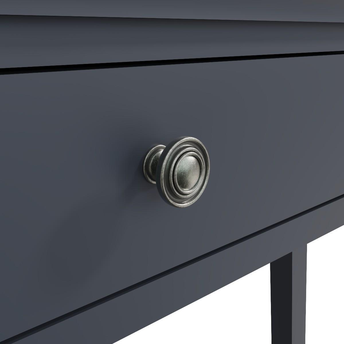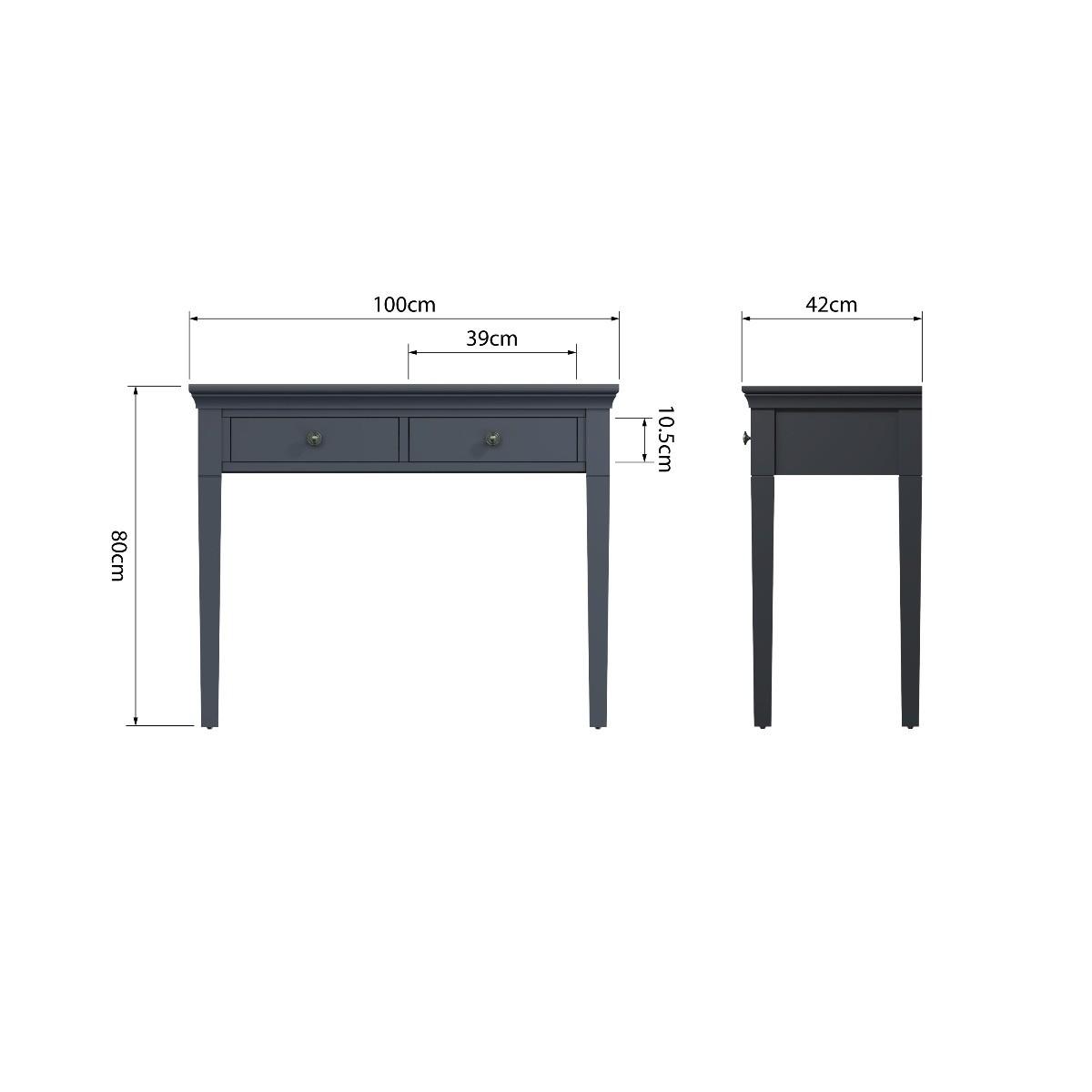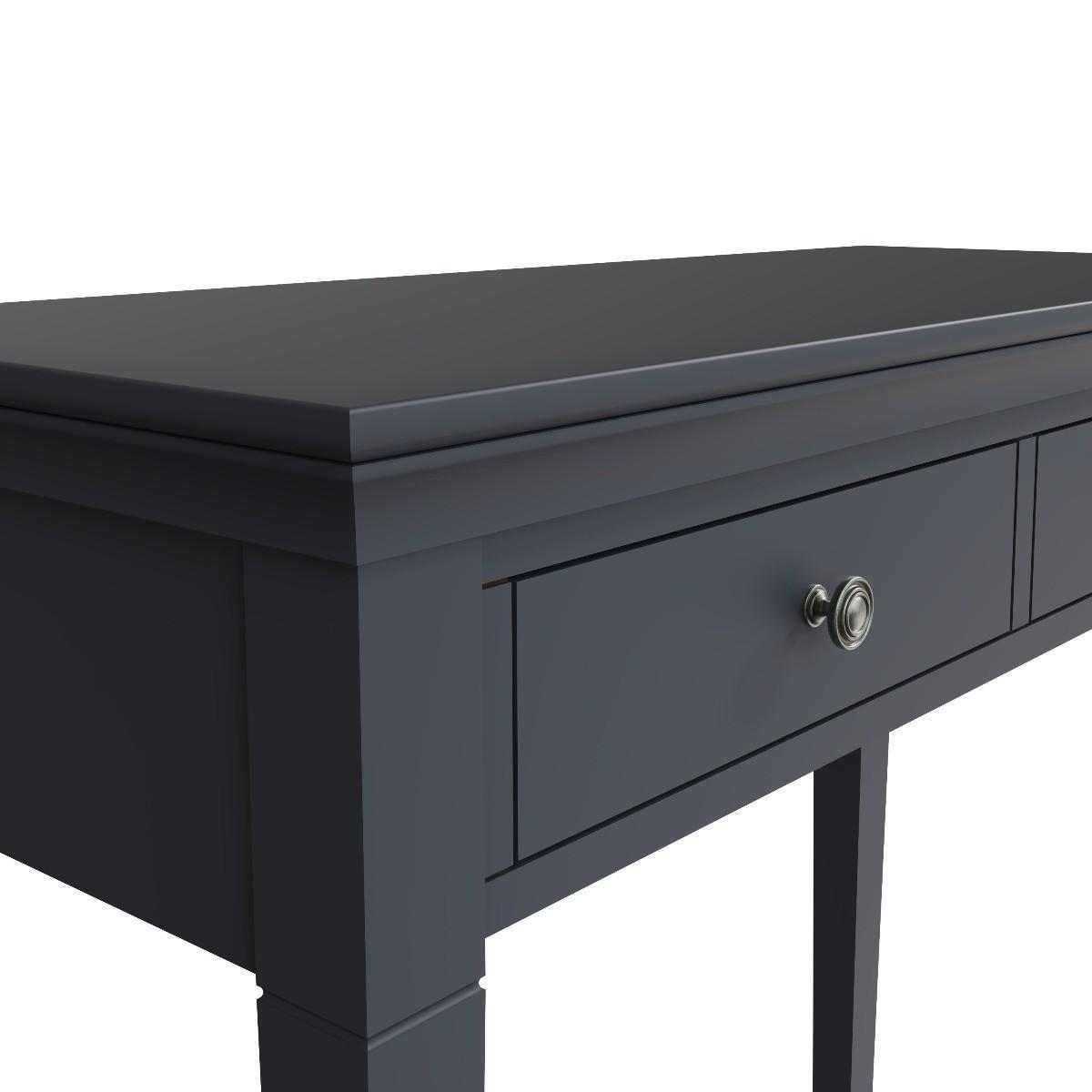 Decorative cornice and dark paint give the Simone collection a sophisticated feel. Solid pine and long-lasting MDF also mean the dressing table is practical and easy to care for. Two drawers provide valuable storage for hairbrushes and makeup whilst adding personality to your bedroom. Look out for the Simone stool and mirror to create a beautiful dressing set. A robust combination of pine and MDF for prolonged life. Two drawers on wooden runners for easy opening. Detailed pewter effect knob handles. Finished in a contemporary midnight grey paint