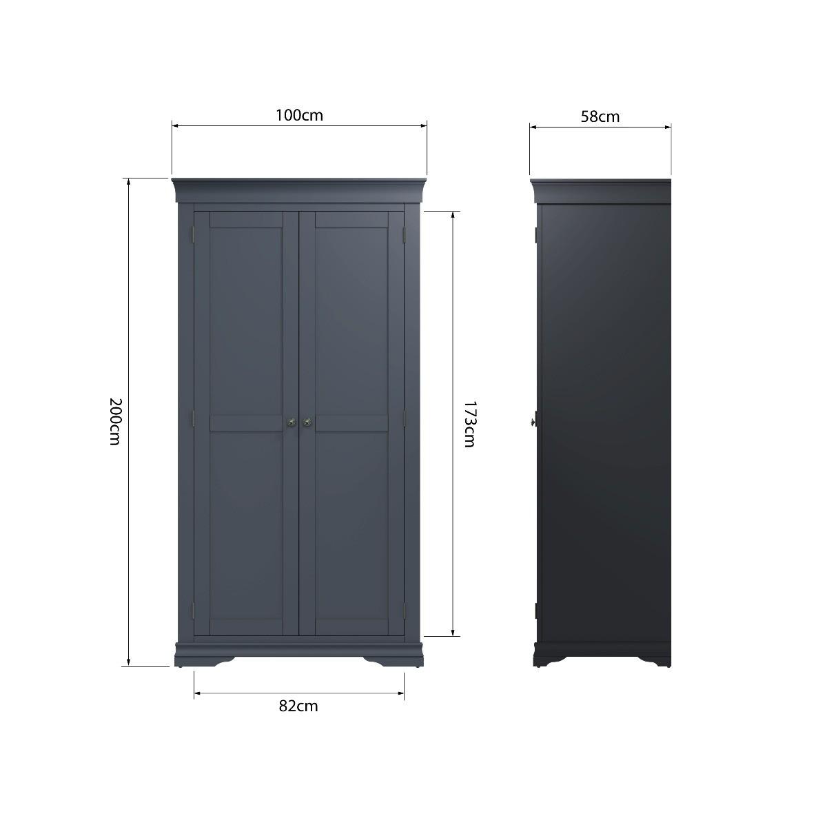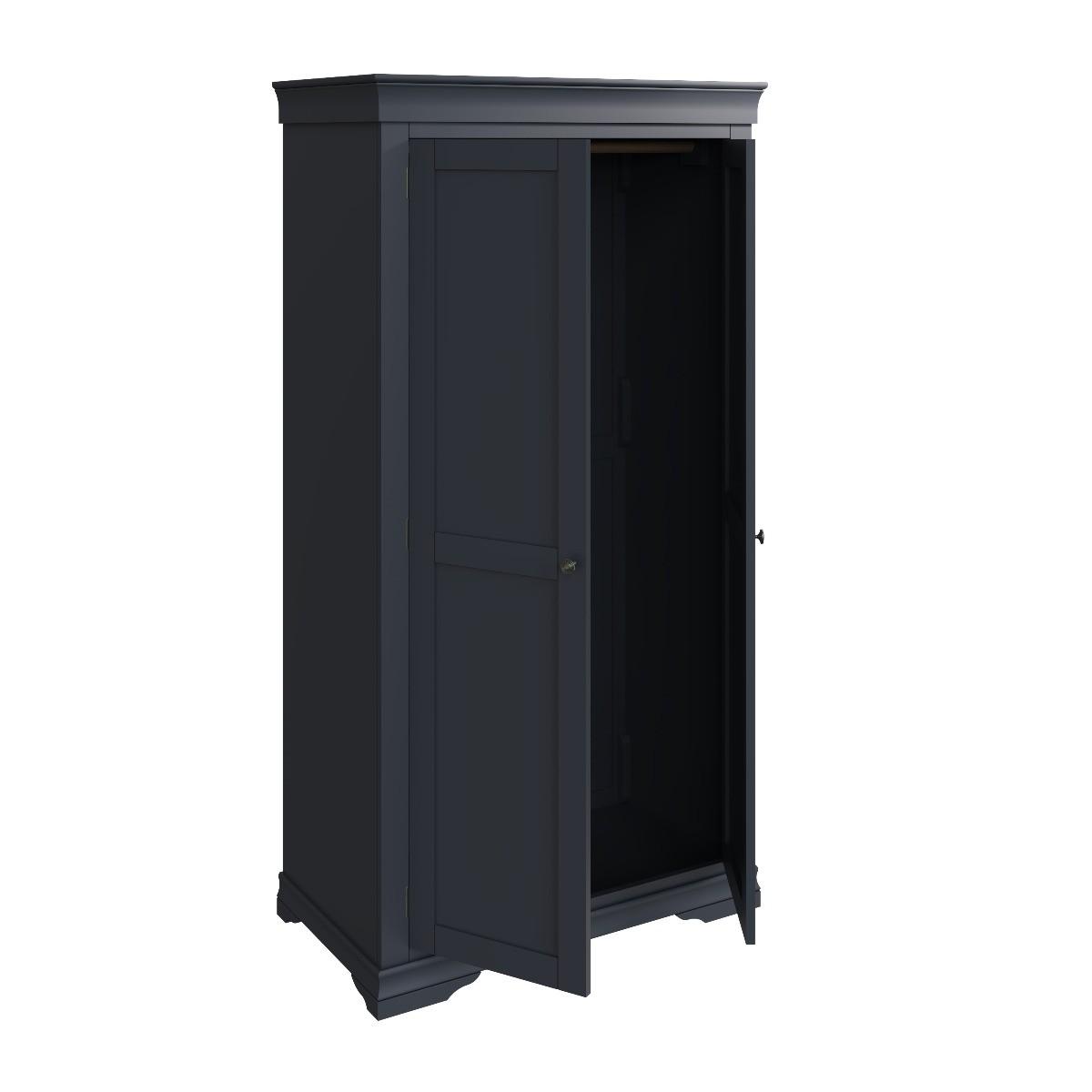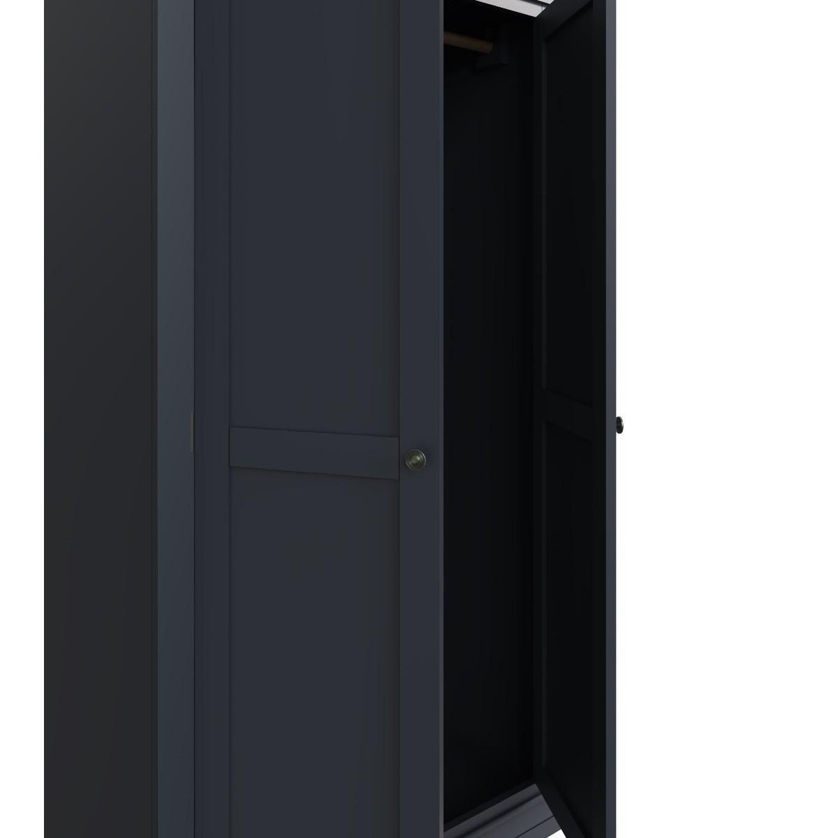 Decorative cornice and dark paint give the Simone collection a sophisticated feel. Solid pine and long-lasting MDF also mean the wardrobe is practical and easy to care for. A full-length hardwood rail provides full height hanging space for clothes whilst the closet adds personality to your bedroom. A robust combination of pine and MDF for prolonged life. Two doors with sleek panelling. Detailed pewter effect knob handles. Finished in a contemporary midnight grey paint