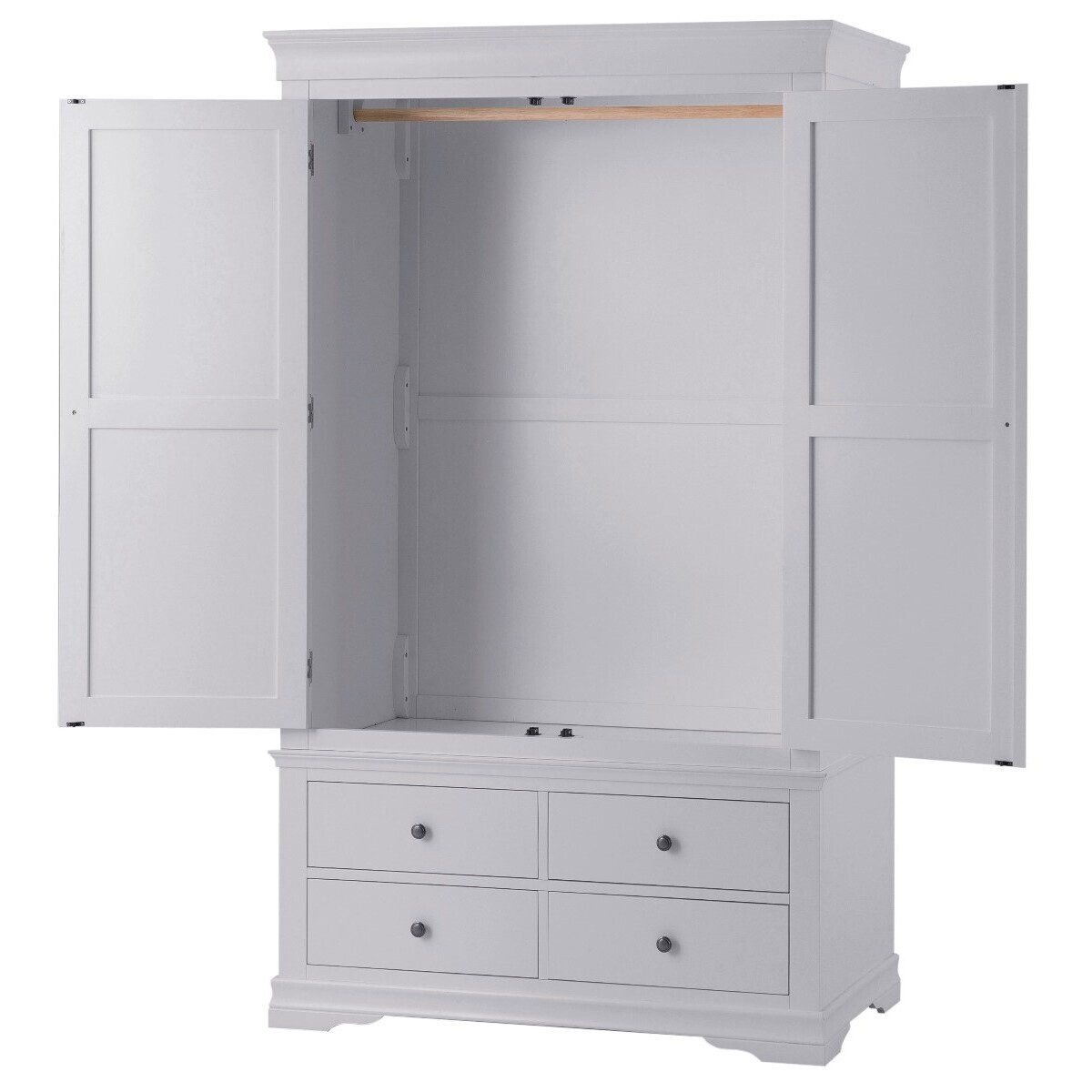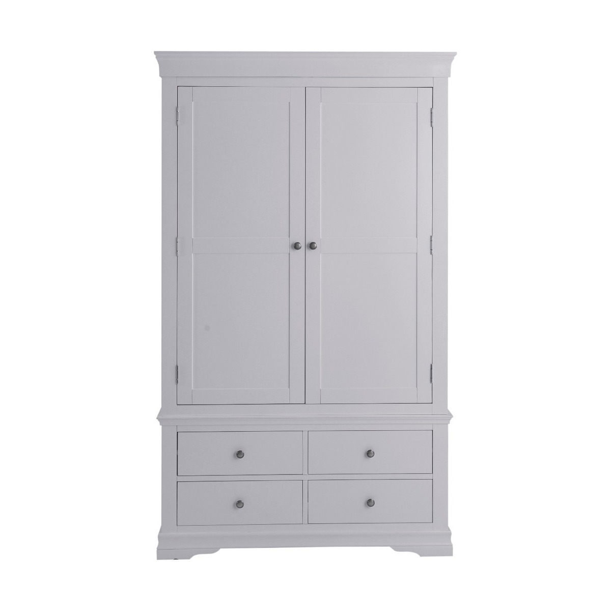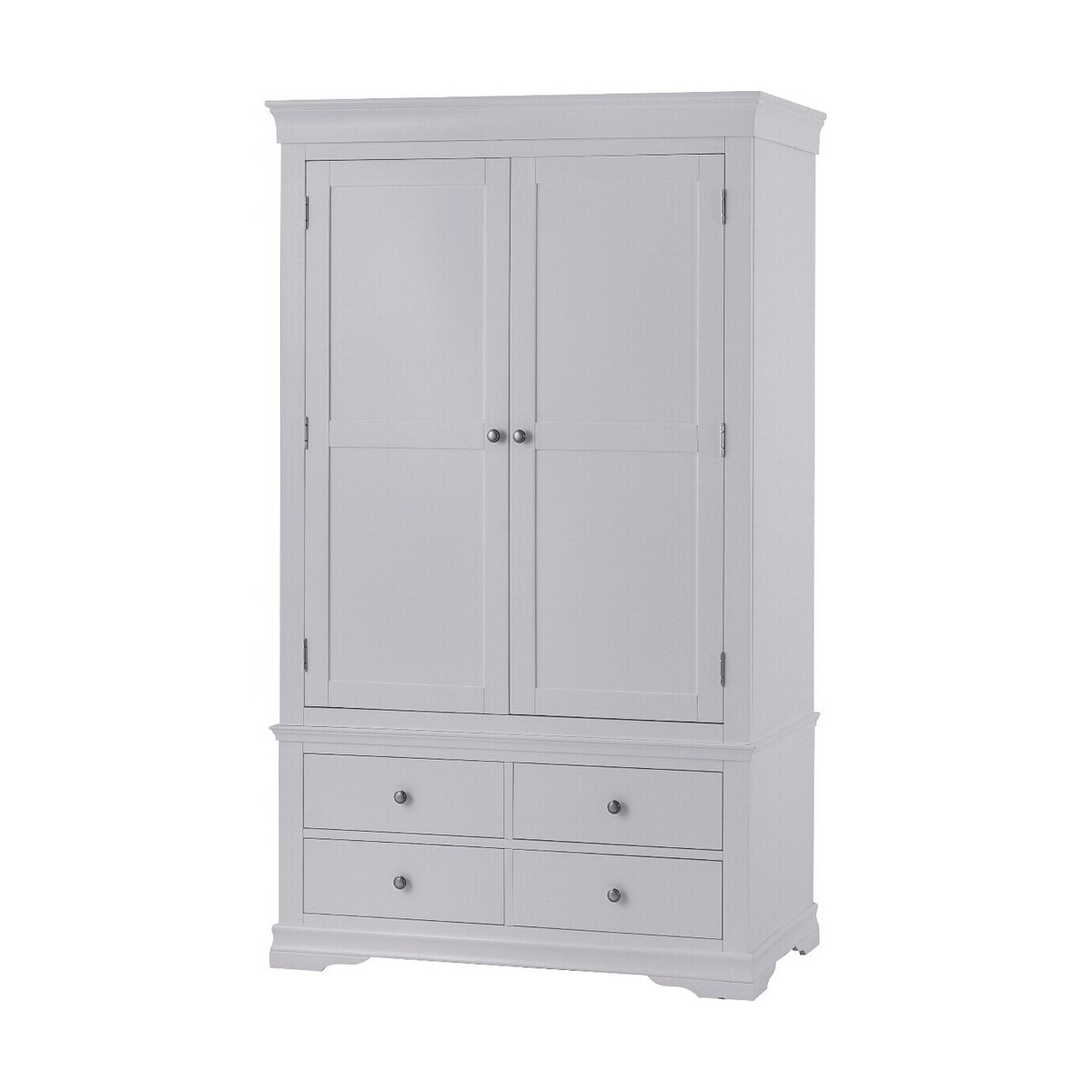 The Simone Grey 2 Door 4 Drawer Wardrobe is a stylish and practical storage option for your bedroom. The large two-door wardrobe features a grey painted finish and is complete with a hardwood hanging rail and 4 lower drawers. The grey painted wardrobe is complete with pewter effect knobs. Large 2 door painted wardrobe. Moonlight grey painted finish complements any interior. Hardwood hanging rail for optimal support. 4 lower drawers with wooden guides offer additional storage. Complete with pewter effect knobs. Complete the look with other items in the Simone Grey Bedroom Collection.