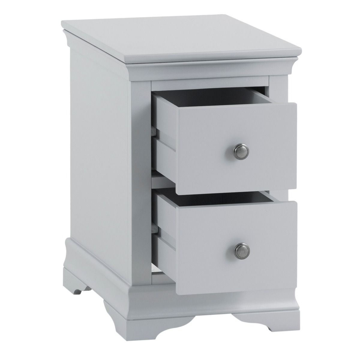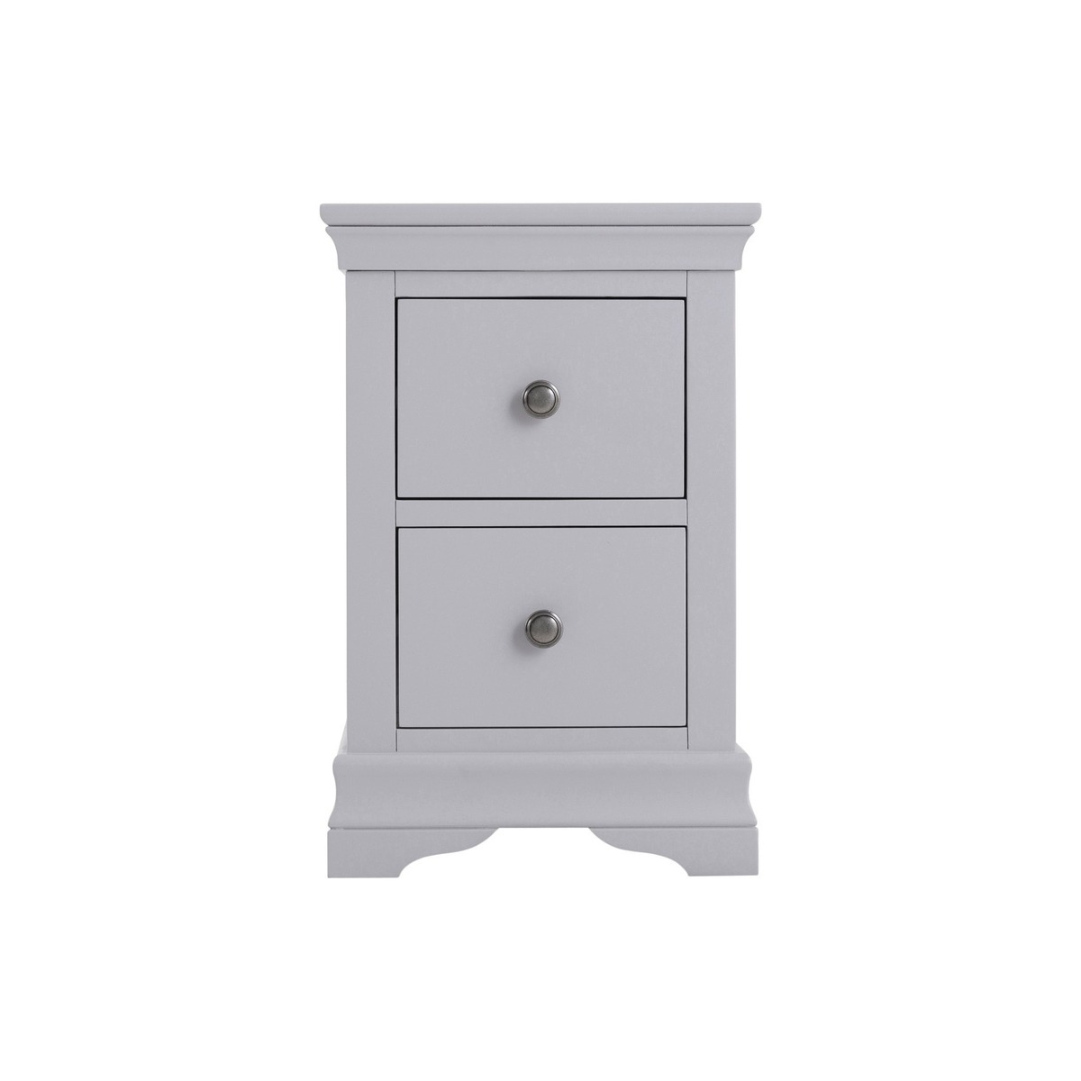 Small and practical, the Simone Grey 2 Drawer Bedside Table is a stylish asset for your bedroom. Timelessly stylish with a moonlight-grey painted finish, the space saving bedside table is complete with 2 handy drawers. Stylish bedside table with storage Smooth moonlight-grey painted finish for a clean minimalist look. Two handy drawers on wooden guides. Pewter effect knobs complete the look. Complements other items in the Simone Grey Bedroom Collection