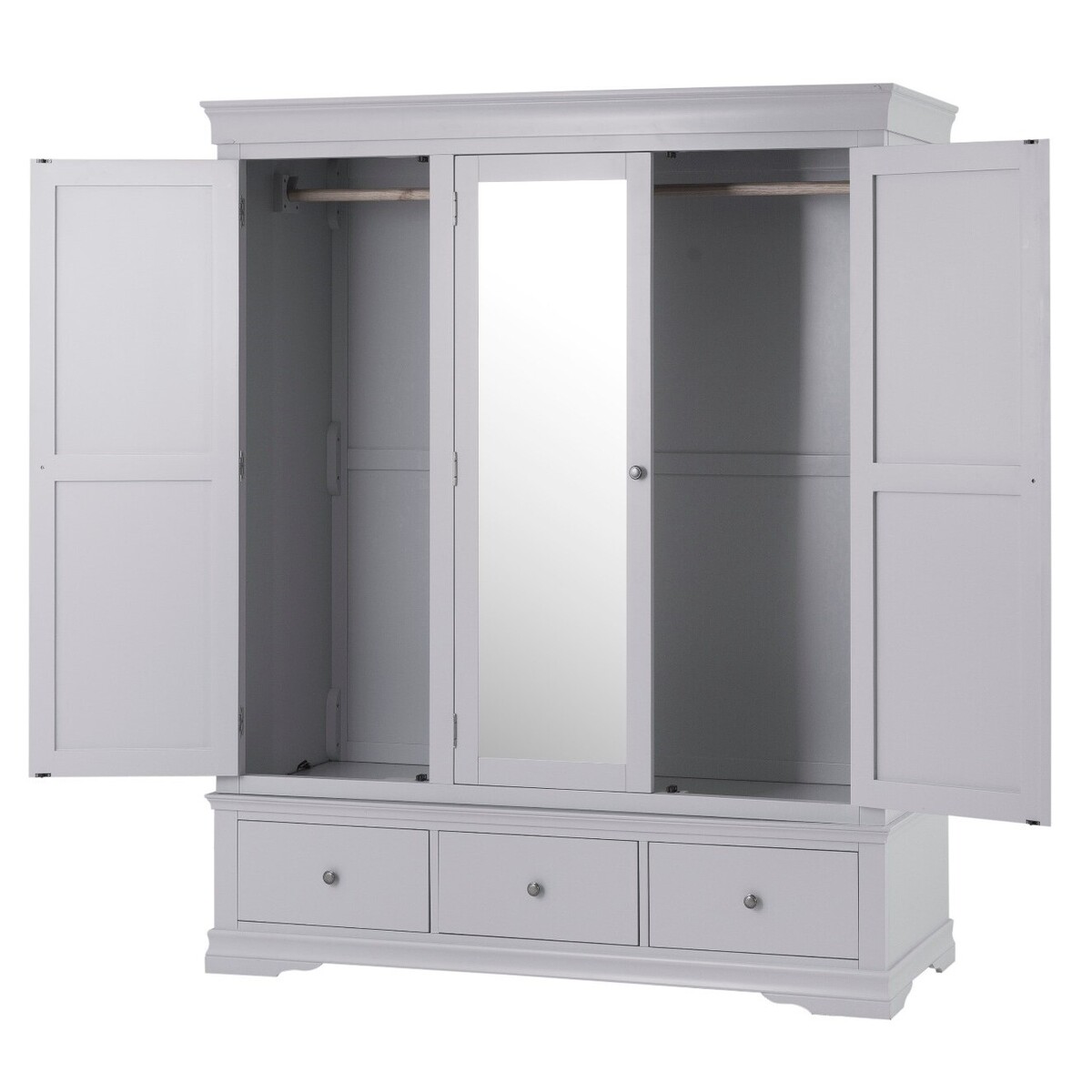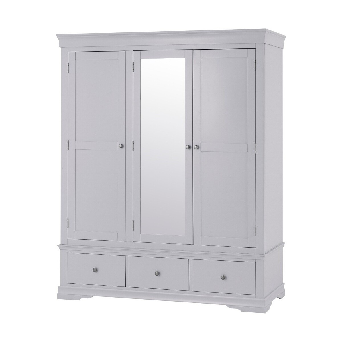 Add a touch of style and practicality to your bedroom with the Simone Grey 3 Door Wardrobe. Featuring a classic look to suit any bedroom setting, the large wardrobe is complete with a grey painted finish, hardwood hanging rail, a full-length mirror and 3 lower drawers for handy storage. Stylish large 3 door wardrobe. Stunning moonlight grey painted finish. Convenient full-length mirror in the centre. Hardwood hanging rail for optimal support. 3 handy lower drawers with wooden guides provide additional storage. Pewter effect knobs complete the look. Complements other items in the Simone Grey Bedroom Collection.