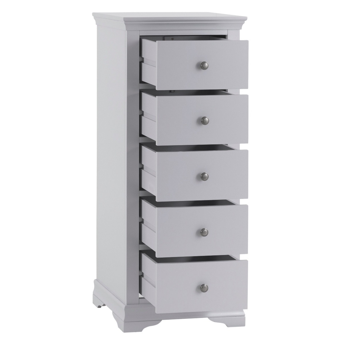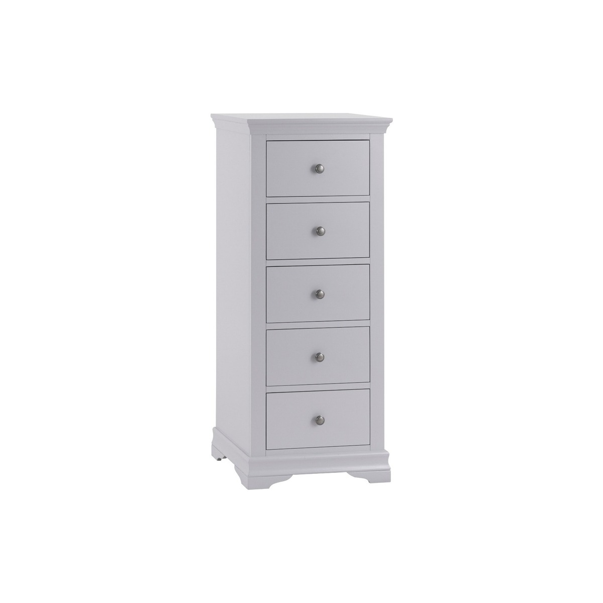 Classically stylish, the Simone Grey 5 Drawer Wellington Chest of Drawers complements any bedroom setting. The chest of drawers features a smooth moonlight-grey painted finish and is complete with 5 drawers on wooden guides with pewter effect knobs. Classically stylish 5 drawer chest of drawers. Moonlight grey painted finish. Slimline space saving design. Five drawers on wooden guides. Complete with pewter effect knobs. Complements other items in the Simone Grey Bedroom Furniture Collection.