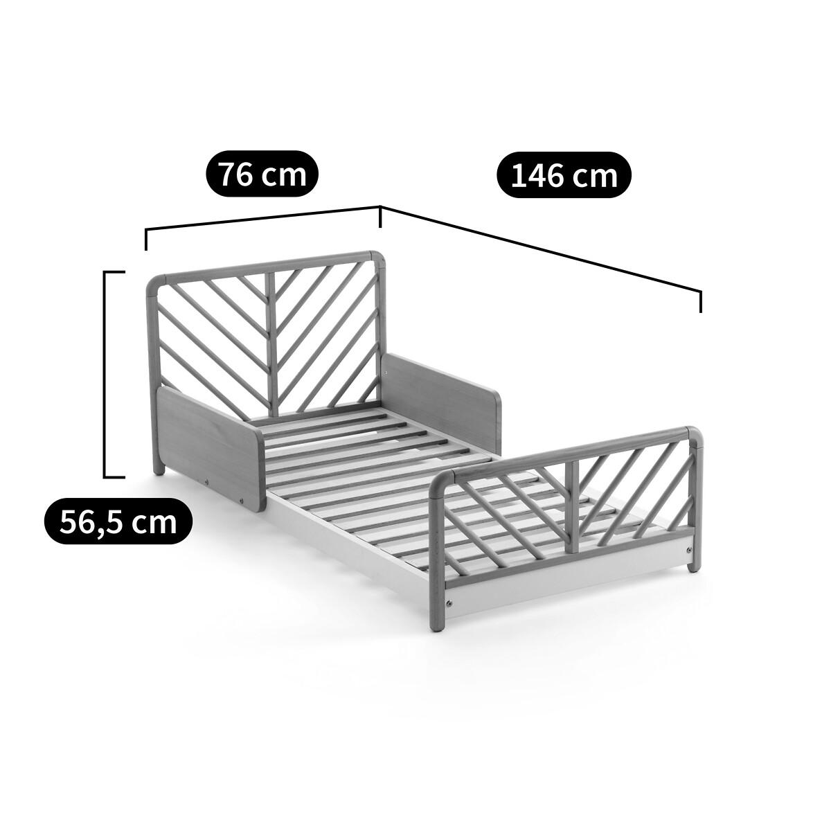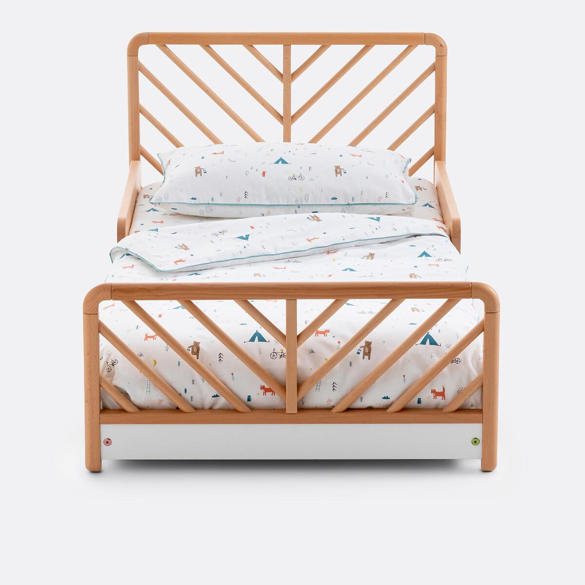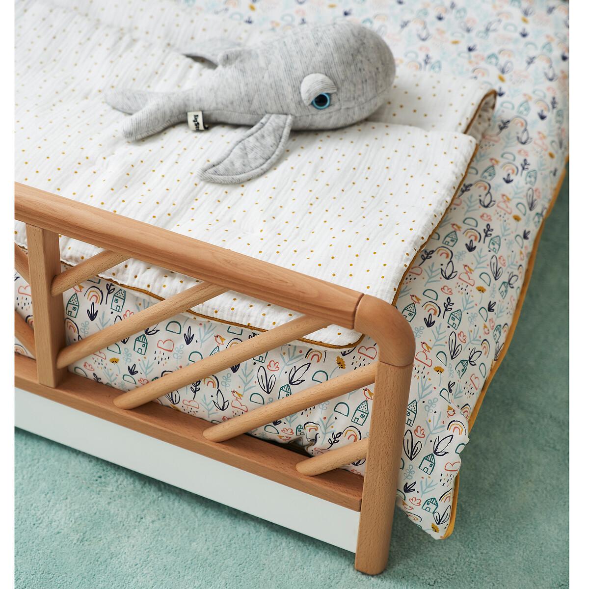 Get excited for bedtime!. Sensitive to beauty and comfort, children will be attracted by the sleek design of this low wooden bed. Ideally installed in the corner against the wall and voluntarily openwork at the level of the headboard and the footboard, it offers an unobstructed view of the bedroom - dear to Maria Montessori.. Made in Europe. Oriane Peillon, creator of "my little Montessori school" and La Redoute Interiors have worked together to design a collection that promotes the autonomy and spontaneity of children in their various activities. The result: 10 pieces of furniture intended for the 4 zones of the Montessori room: sleep, activity, care and clothing. Exclusive and accessible creations, at child height. Product Details • In solid beech and lacquered MDF with polyurethane finish • Removable safety barriers in beech • Pine slatted base • Sleeping area 70 x 140cm • Dimensions • Width: 76cm • Height: 56.5cm • Length: 146cm • Weight: 21kg Delivery:Assembly required. Available for home delivery. Note! Please check that all access points are large enough to accommodate your delivery (doors, stairs, lifts). • Made in Europe. Dimensions and weight of parcel::1 parcel • L146.5 x D76.5 x H9cm. 25kg