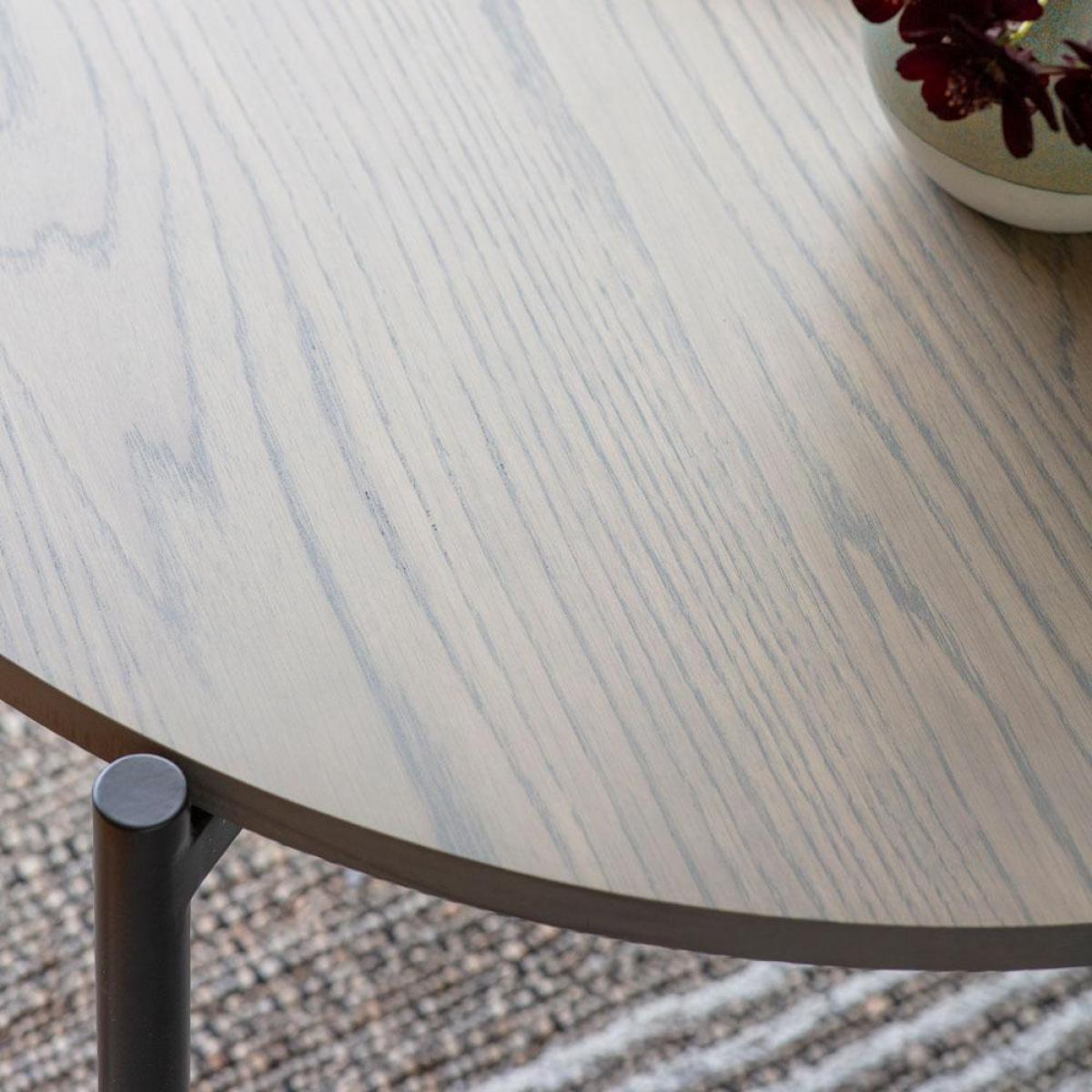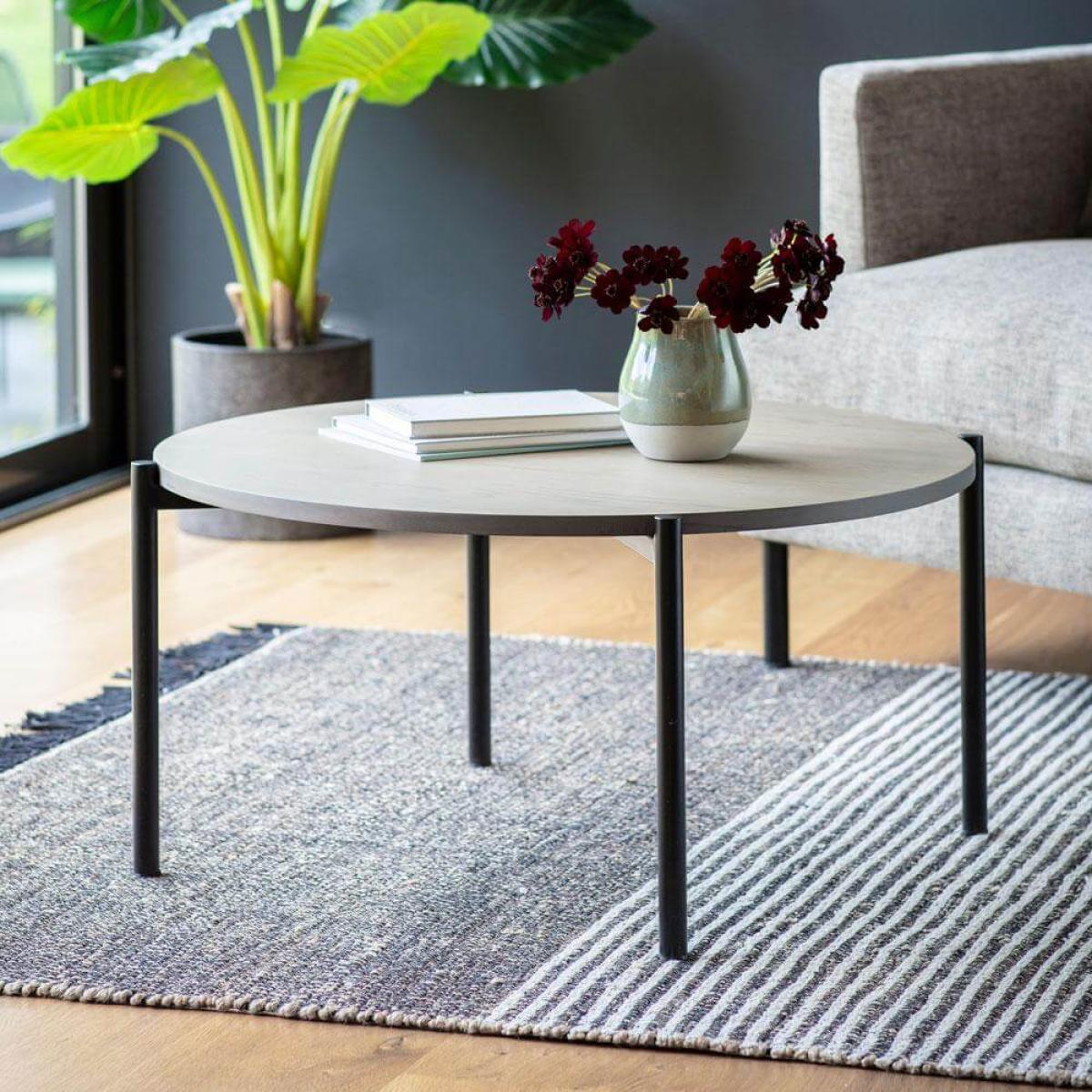Two tone makes a stark and convincing comeback with the Simple Noir Oak Coffee Table in Grey Grain. Contrasting wood shades of muted grey grain come through the oak veneer and threaten to steal the show with this design focused coffee table. The sleek and clean lines nicely compliment the table, ensuring it remains at heart – all modern. Slimline black brushed metal legs elevate this piece of oak furniture to 40cm, but also adjoin to the 85cm diameter table-top with a stylistic four point overlap. The wood shade allows the grey grain to tastefully emerge through the wood coat of this oak veneer table. The pleasing lighter colours will pair very easily with light and bright soft furniture or similarly a neutral decor palette.