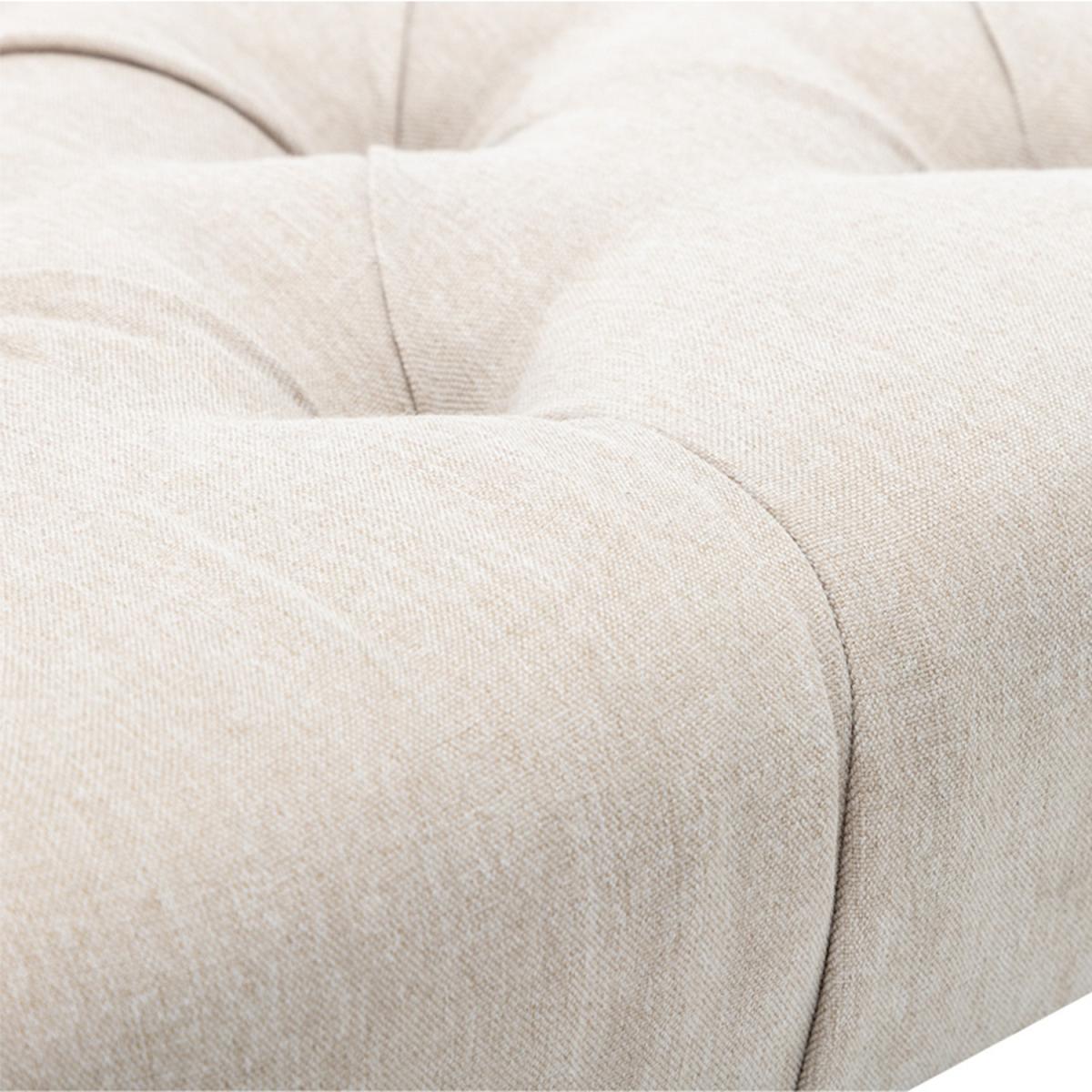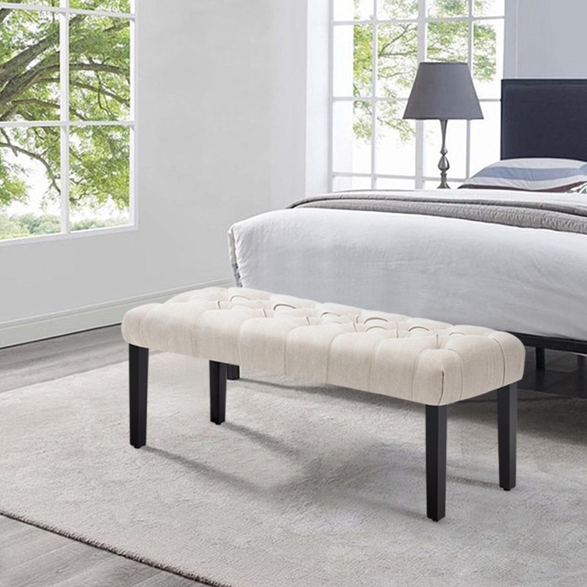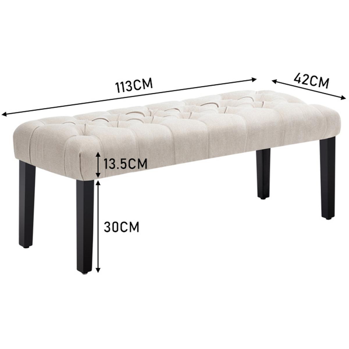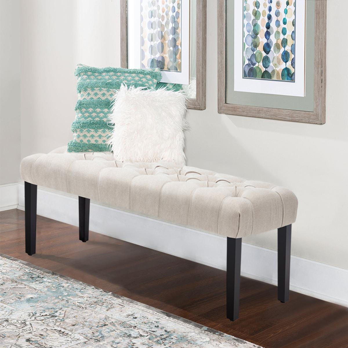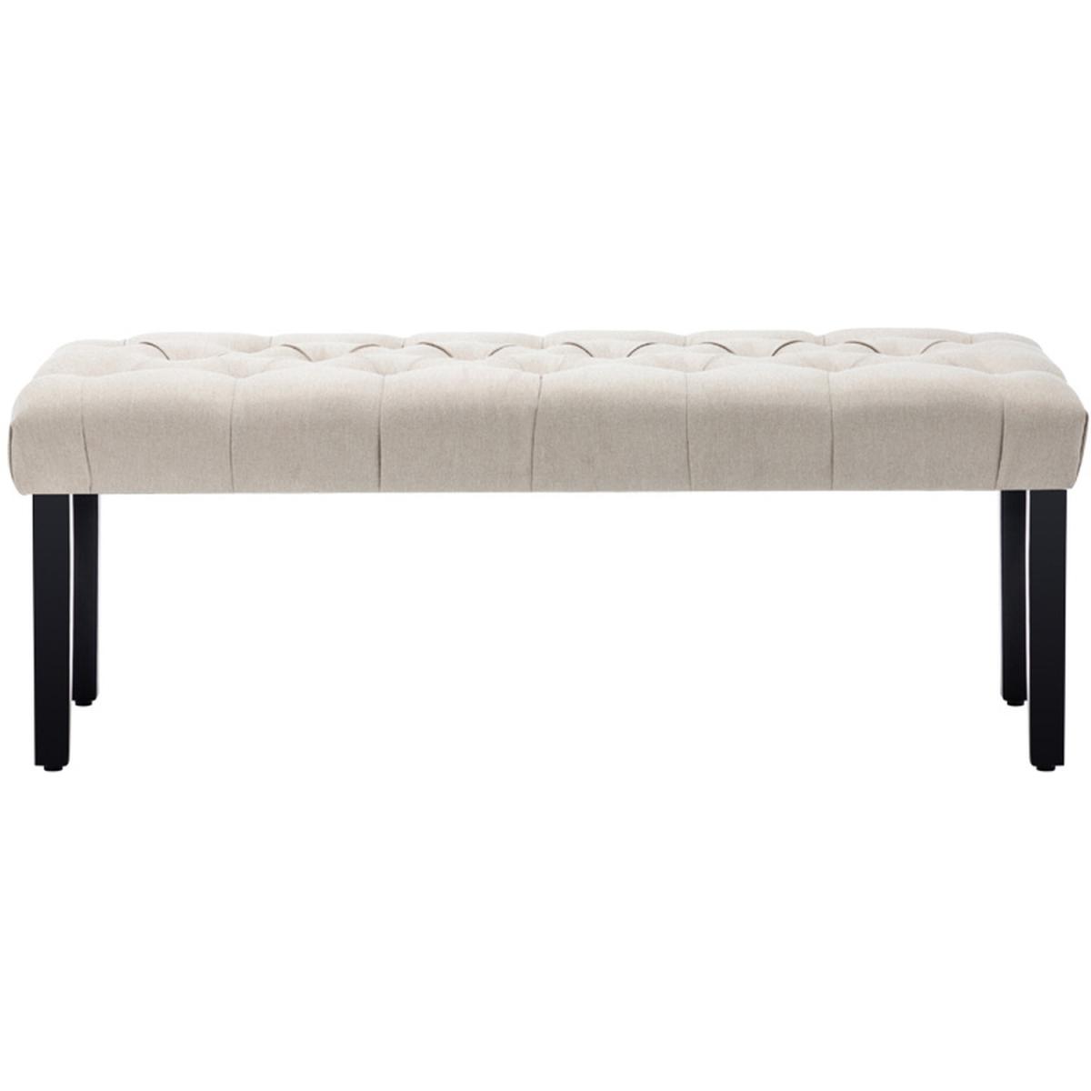 Enjoy sophisticated dining with the inclusion of this transitional style Bench which comes with a rectangular button-tufted seat. Constructed from the solid wood frame, it is upholstered with linen-like fabric.