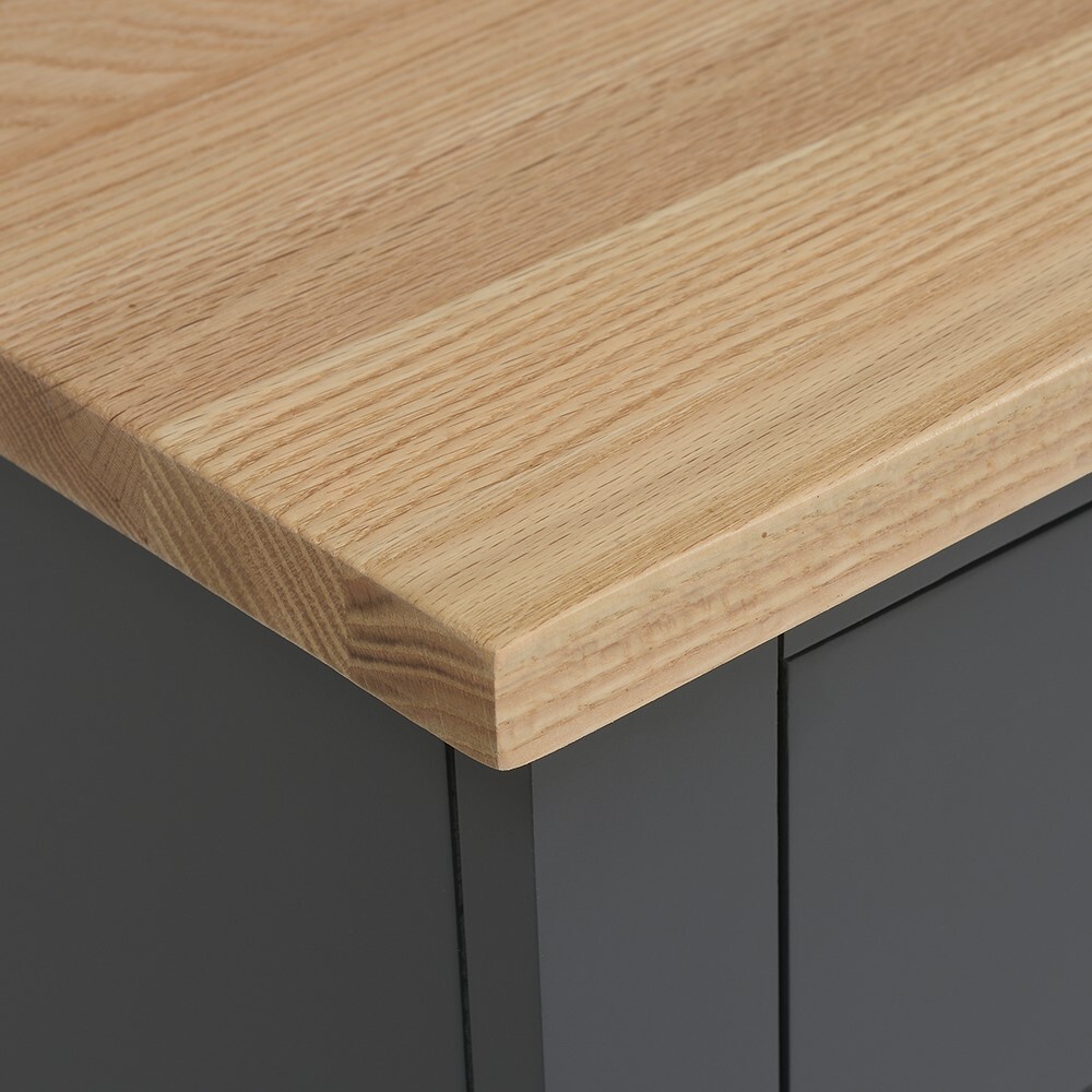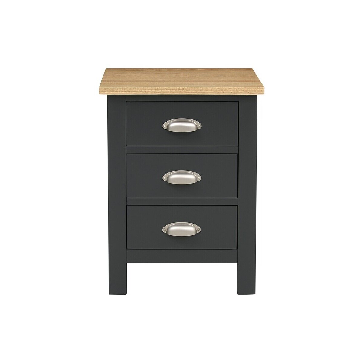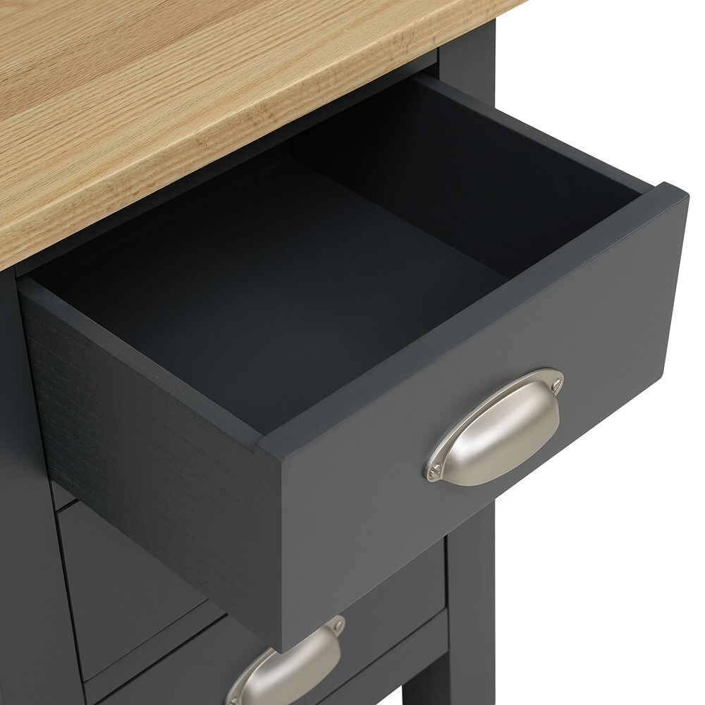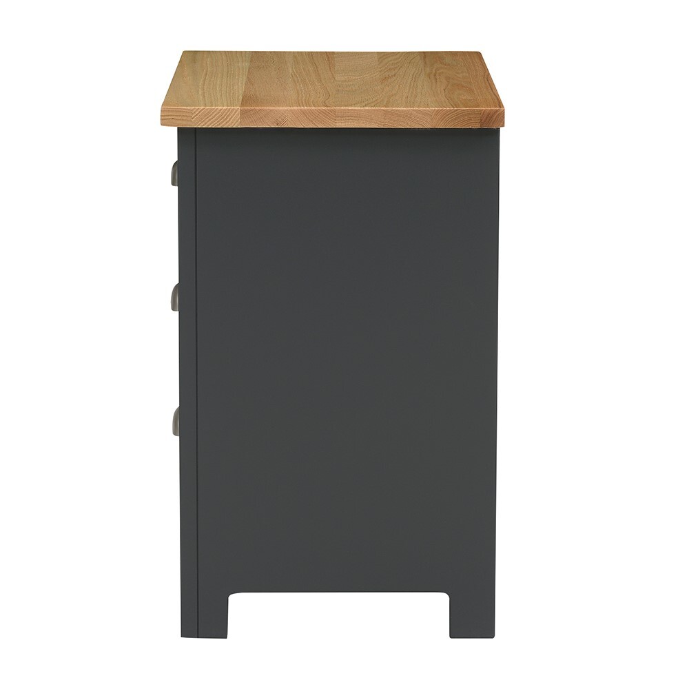The charming modern country style of our Simply Cotswold 3 Drawer Bedside will make bedtime an altogether more stylish affair. The contrast of the striking charcoal paint and solid oak top makes for a lovely effect, and topped with an elegant lamp, it will look very special indeed. The three drawers have stoppers at the back, and the oak top has a coating of light lacquer for protection and durability.