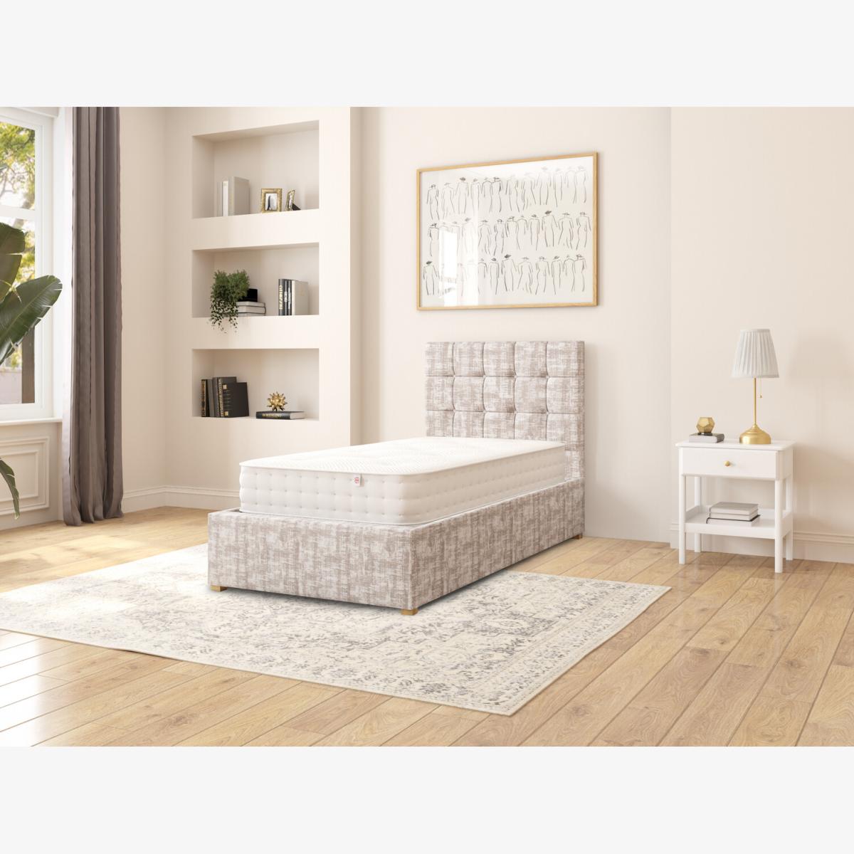 Quality upholstered ottoman storage bed, hand crafted in the UK. Each headboard is constructed with deep foam padding perfect for sitting up in bed and reading. We believe quality has no short cuts, meaning all our designs are hand upholstered by our skilled craftsmen. Our UK ottoman design features chunky upholstered panels, which means it is built to last. Quality sprung slats improve comfort and mattress lifespan. The easy lift ottoman mechanism is supported with quality gas pistons, enabling the storage to be accessed with minimal effort. Once the ottoman is elevated it will hold position, allowing hands free access to storage. Our ottomans offer the perfect storage solutions for rooms with no or limited space with a spacious storage area of approximately 28cm. The fabric base attaches to the underside of the bed, protecting your stored items. Each ottoman is finished with hardwood feet which have been hand turned and varnished.
