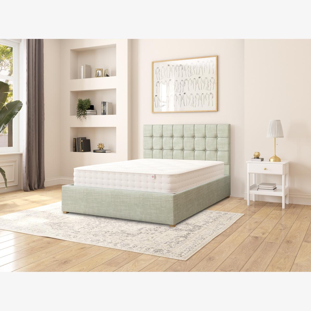 Quality upholstered ottoman storage bed, hand crafted in the UK. Each headboard is constructed with deep foam padding perfect for sitting up in bed and reading. We believe quality has no short cuts, meaning all our designs are hand upholstered by our skilled craftsmen. Our UK ottoman design features chunky upholstered panels, which means it is built to last. Quality sprung slats improve comfort and mattress lifespan. The easy lift ottoman mechanism is supported with quality gas pistons, enabling the storage to be accessed with minimal effort. Once the ottoman is elevated it will hold position, allowing hands free access to storage. Our ottomans offer the perfect storage solutions for rooms with no or limited space with a spacious storage area of approximately 28cm. The fabric base attaches to the underside of the bed, protecting your stored items. Each ottoman is finished with hardwood feet which have been hand turned and varnished.