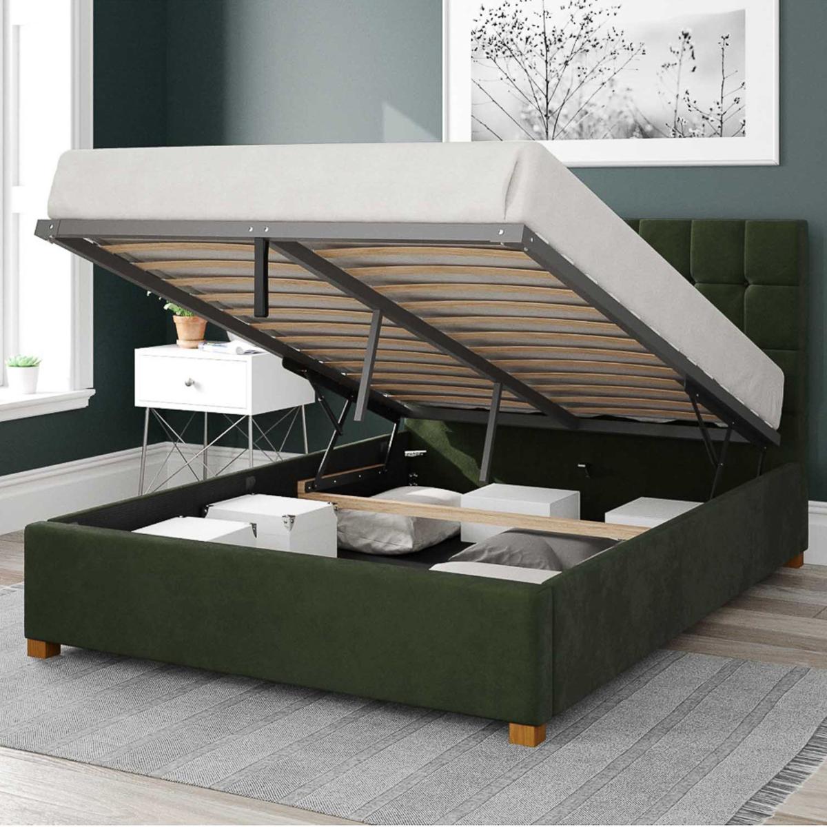 * Plush velvet fabric ottoman bed* Square buttoned headboard design* Contemporary Sinatra range* Hand upholstered with deep padding* Large storage area with fabric dust protection sheet* Hands free access to storage (mattresses up to 60kg) - mattress not included* Solid hardwood feet* Manufactured in the UK Designed with a contemporary style and plush textures, this stylish ottoman bed from the Sinatra range will allow you to rest with a clear mind and space, as it offers an effective storage and sleeping solution. Manufactured in the UK, this plush velvet fabric bed is hand upholstered in a range of gorgeously bold colours with a classic button detailed headboard made with deep padding and a contemporary square design. Perfect for creating a statement look in your bedroom with style and functionality, it features quality spring slats that provide added support for a peaceful night's sleep and the large storage area is designed to provide ample space for all your bedding and accessories. The ottoman design can be easily accessed with gas lift pistons, so once the mechanism is open it will hold in place and a fabric dust protection sheet is there to keep your belongings clean and tidy. Complete with solid hard wood feet to provide a stable foundation and ensure the bed remains sturdy and secure, they also add a stylish touch to the overall design.