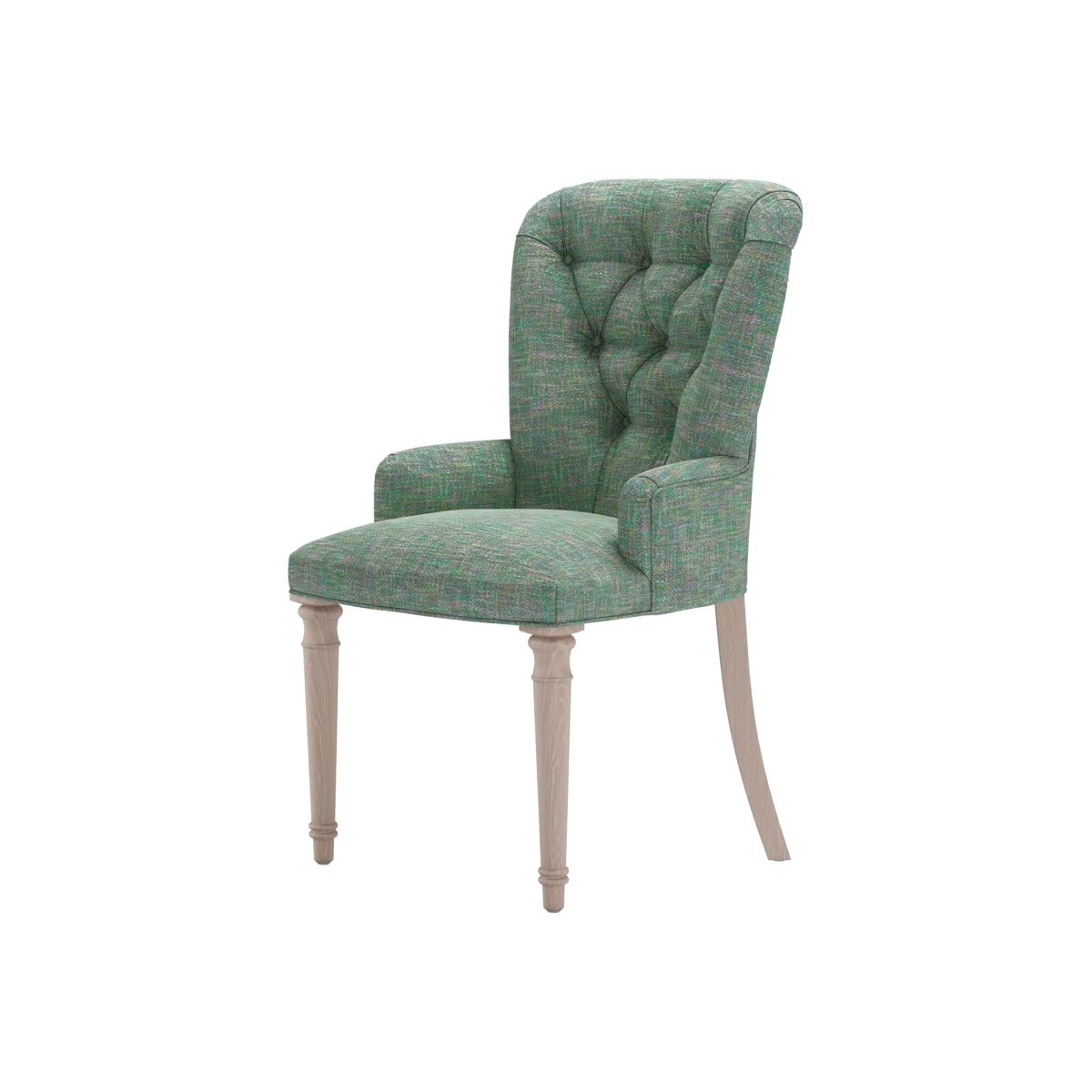 I love this chair for its elegant yet cosy appeal, thanks to the Waterlily Impressionist Tweed fabric and its tufted back design. It works particularly well in eclectic or vintage-inspired interiors where a pop of colour and texture is welcomed. The soft green hue offers flexibility-pair it with natural woods for a relaxed look or contrast it with bold, modern finishes for a more contemporary feel. Practical styling tips include using it as an accent piece around a dining table-its inviting comfort makes it perfect for both everyday family meals and occasional entertaining. To keep the look fresh, combine it with neutral or muted tones and add complementary accessories like soft cushions or throws that echo the fabric’s subtle pattern.