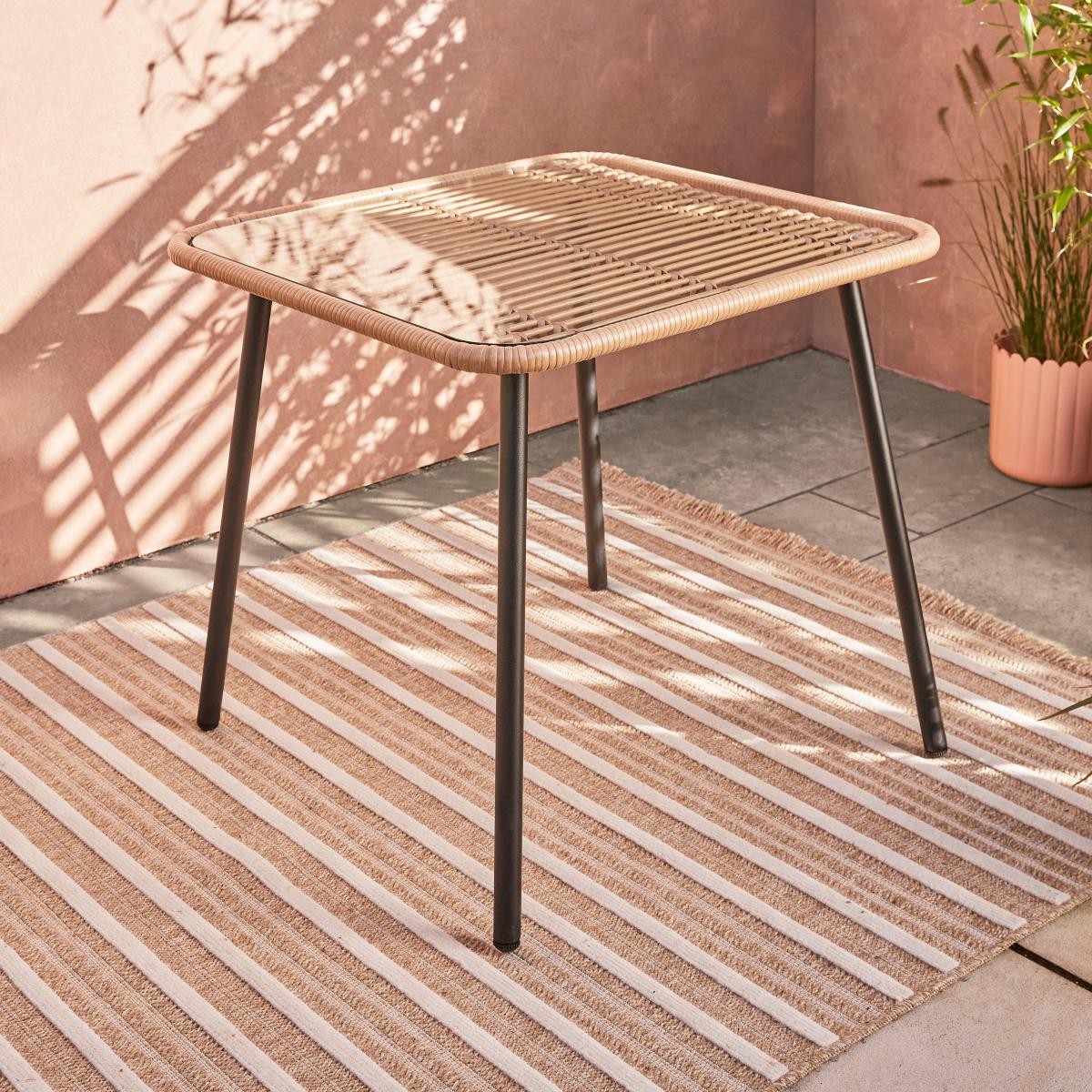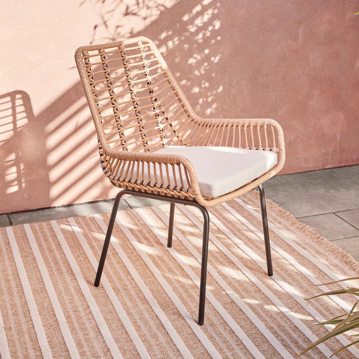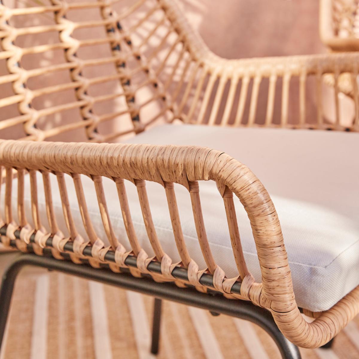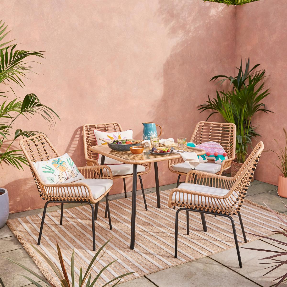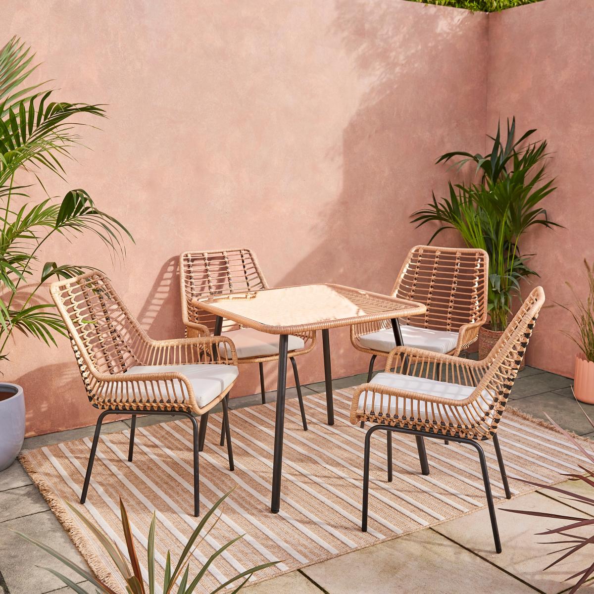 I love this stubby little set for its versatile, breezy style that works equally well in modern or more bohemian gardens. Its natural rattan-look weave adds warmth and texture, making it a great choice to soften contemporary outdoor spaces or add a touch of cosy charm to more eclectic gardens. For styling tips, pair it with colourful cushions or throws to add personality, and keep the table styled with simple tableware for gatherings. It’s equally suited to patio corners, small courtyards or even a spacious balcony, thanks to its inviting form and manageable size. Just remember to add a protective cover or bring it indoors during harsh weather to keep it looking its best year-round.