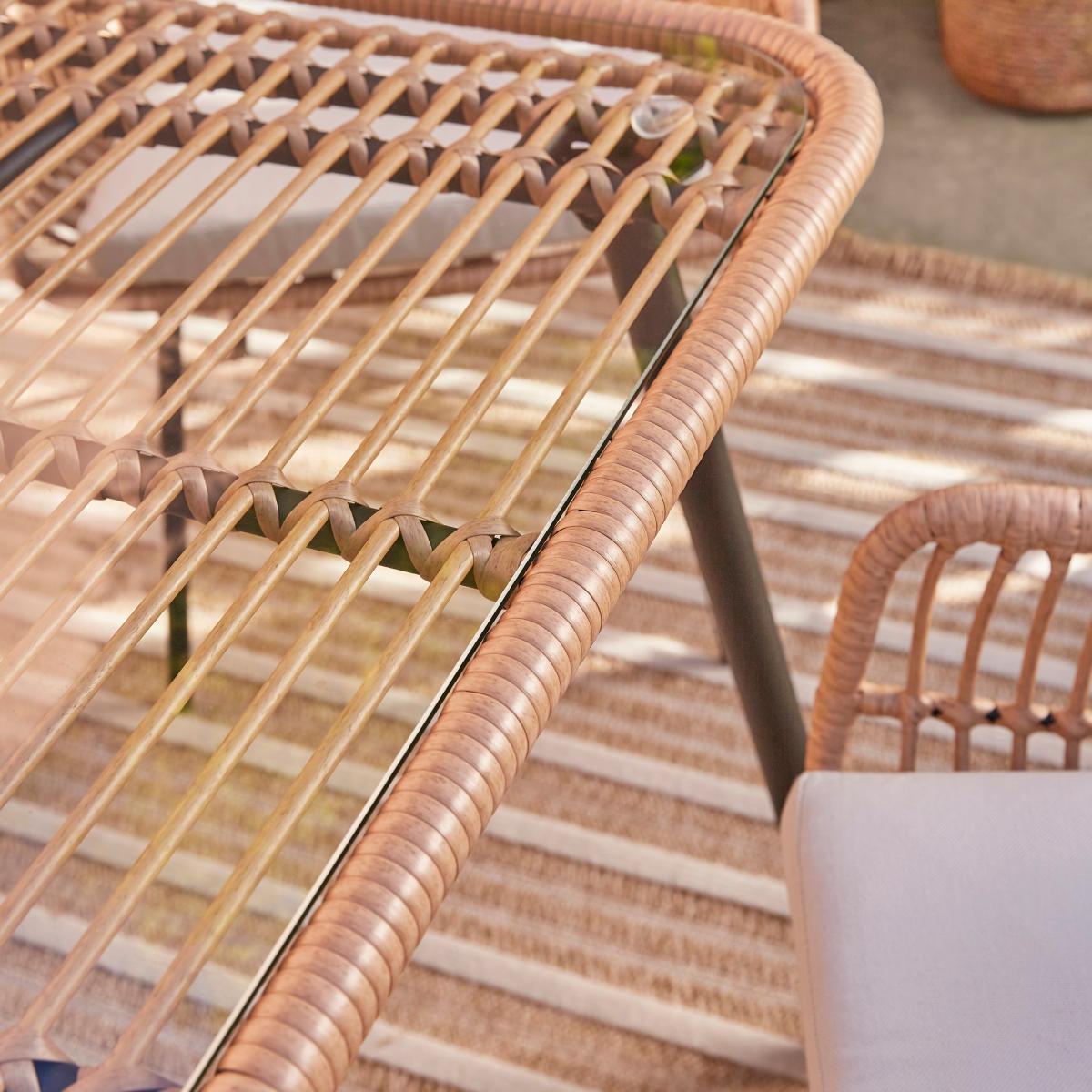 * 4 Seater Outdoor Dining Set * 1 glass top table * Made from All-Weather Rattan and Metal * Seat pads included Transform your outdoor space with the Singapore 4-Seater Outdoor Dining Set, blending timeless elegance with modern flair. Featuring a sleek glass-top table and four comfortable dining chairs, each with soft seat pads, this set is perfect for al fresco dining or relaxing with friends. Crafted from all-weather rattan and durable metal, it’s built to withstand the elements while maintaining its stylish appeal. Whether hosting a garden party or enjoying a quiet morning coffee, this versatile set adds a touch of sophistication to any patio or outdoor area. Complete your look with other matching pieces from the Singapore collection.