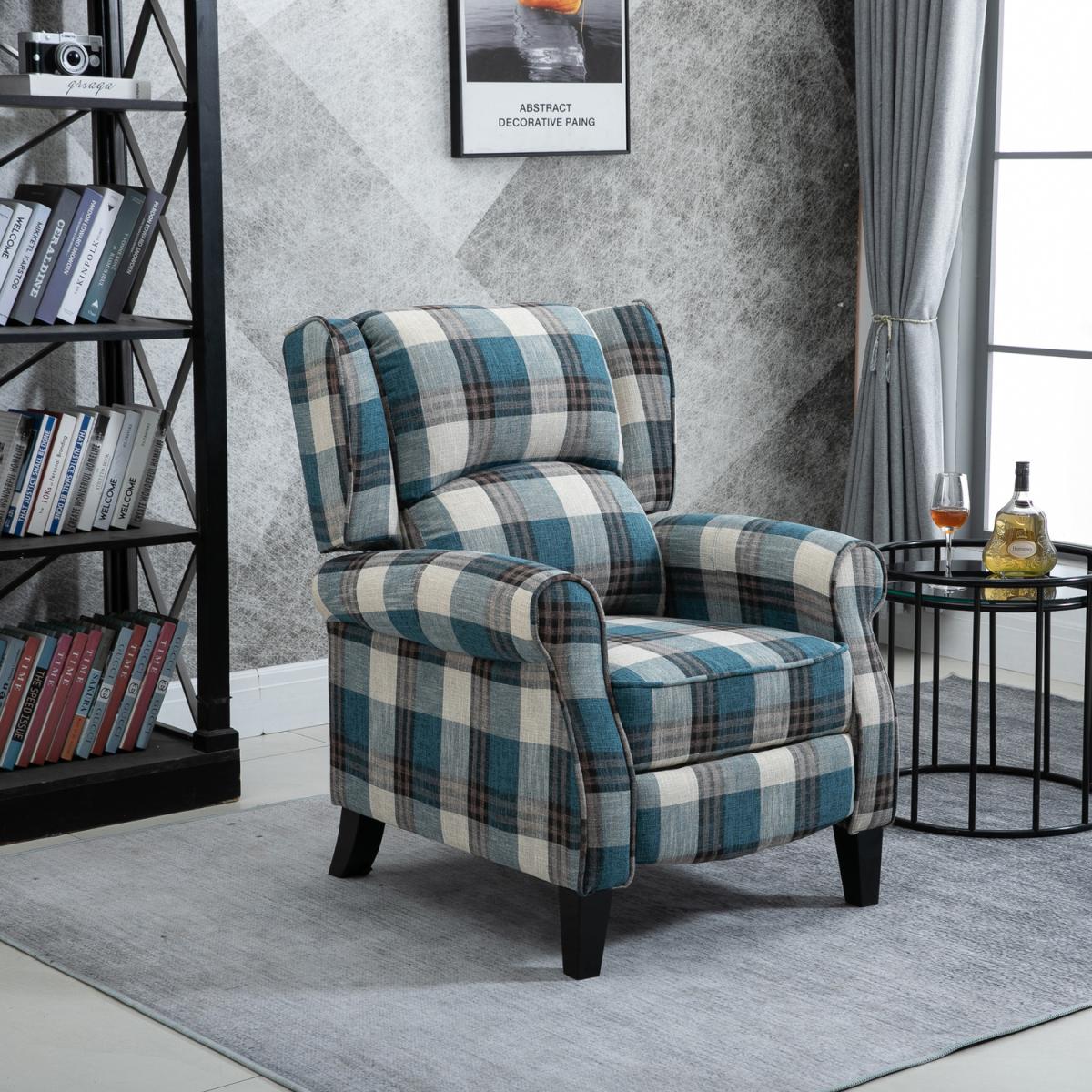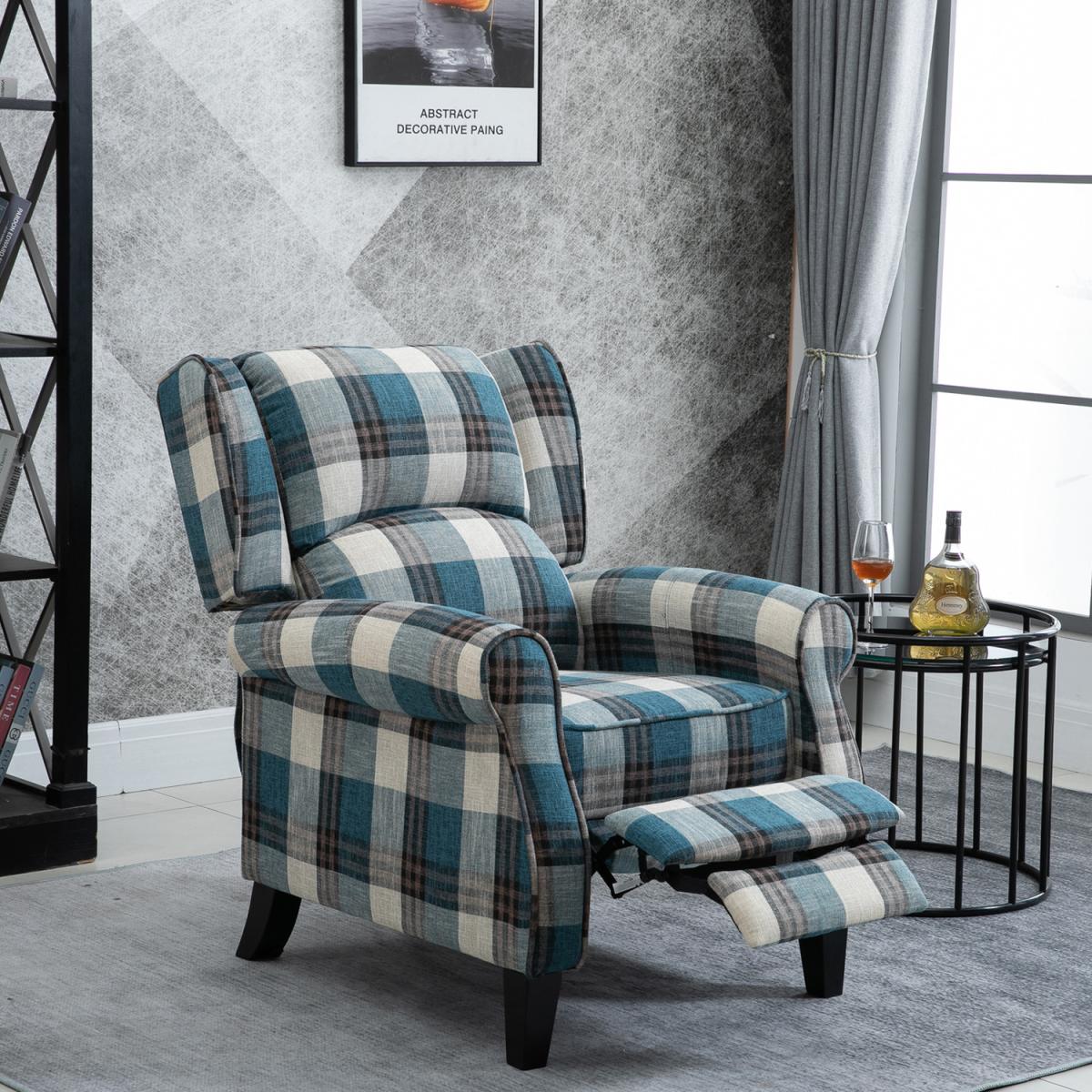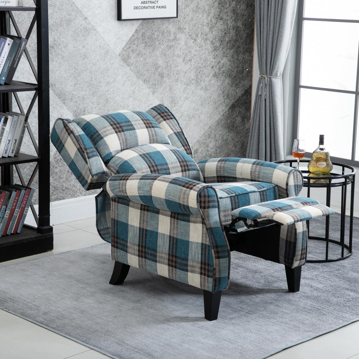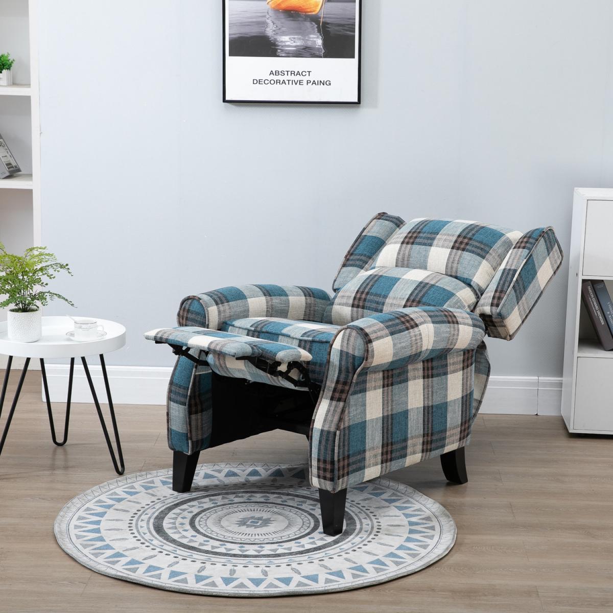 Smart, stylish and oh so comfortable - invite this recliner chair from HOMCOM into your home, and it will soon become a sure-fire winner everyone will be fighting to sit on. Upholstered in linen for easy maintenance, it is covered in a blue, grey and faded white check design which makes it an eye-catching addition to your home. The frame, made from a blend of wood and metal, ensures the chair can support a weight up to 150kg, with the back reclining up to 160 degrees alongside the retractable footrest to allow you to be in control of your comfort. With thick padding all over that, you will love sinking in it, it is finished with four wooden feet with anti-slip pads to prevent any damage to the floor beneath.