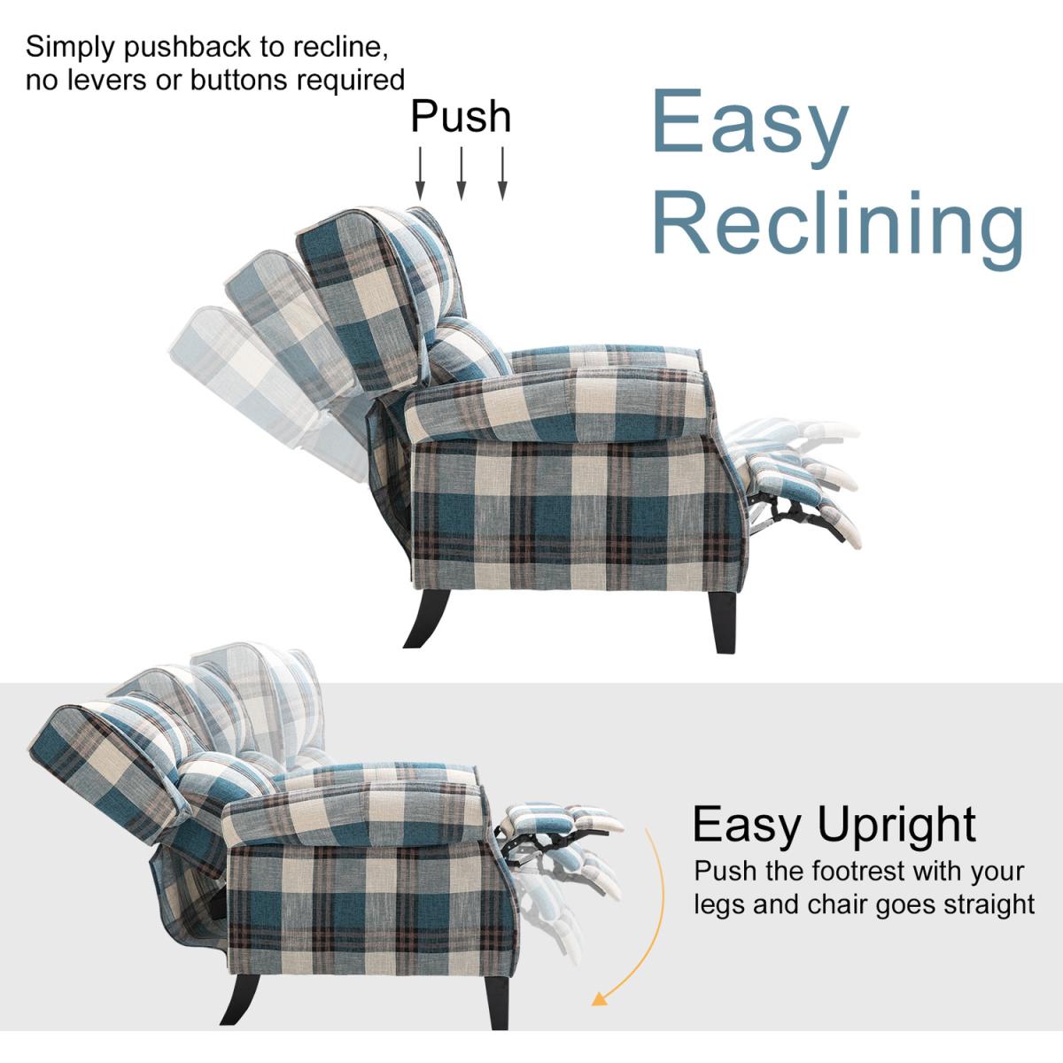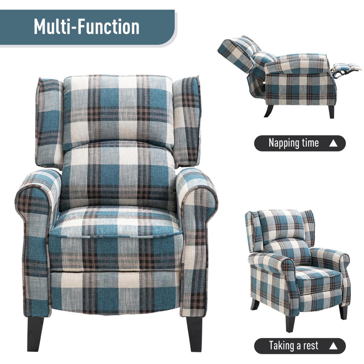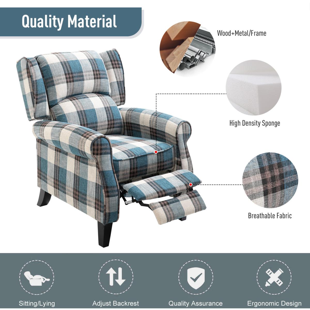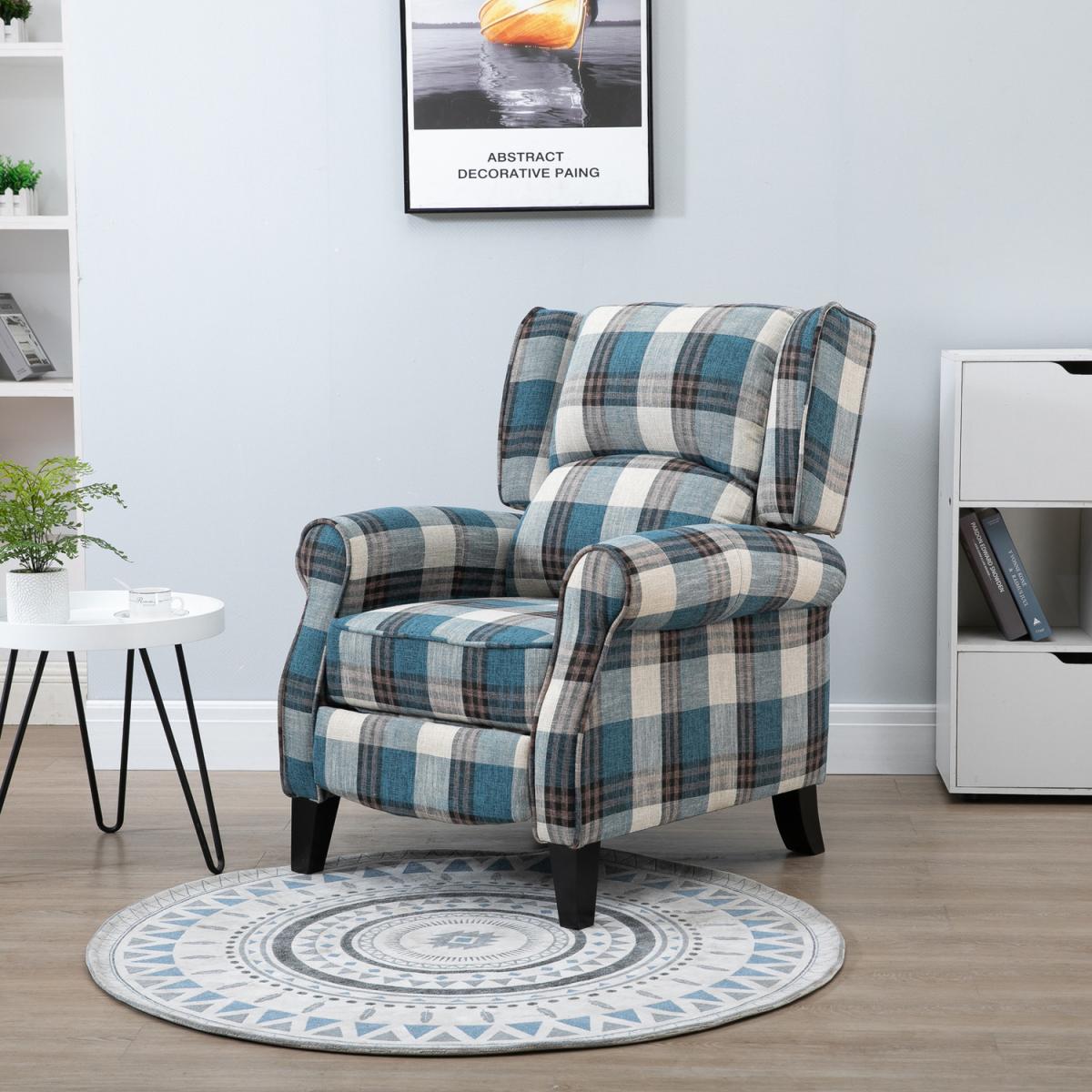 Smart, stylish and oh so comfortable - invite this recliner chair from HOMCOM into your home, and it will soon become a sure-fire winner everyone will be fighting to sit on. Upholstered in linen for easy maintenance, it is covered in a blue, grey and faded white check design which makes it an eye-catching addition to your home. The frame, made from a blend of wood and metal, ensures the chair can support a weight up to 150kg, with the back reclining up to 160 degrees alongside the retractable footrest to allow you to be in control of your comfort. With thick padding all over that, you will love sinking in it, it is finished with four wooden feet with anti-slip pads to prevent any damage to the floor beneath.