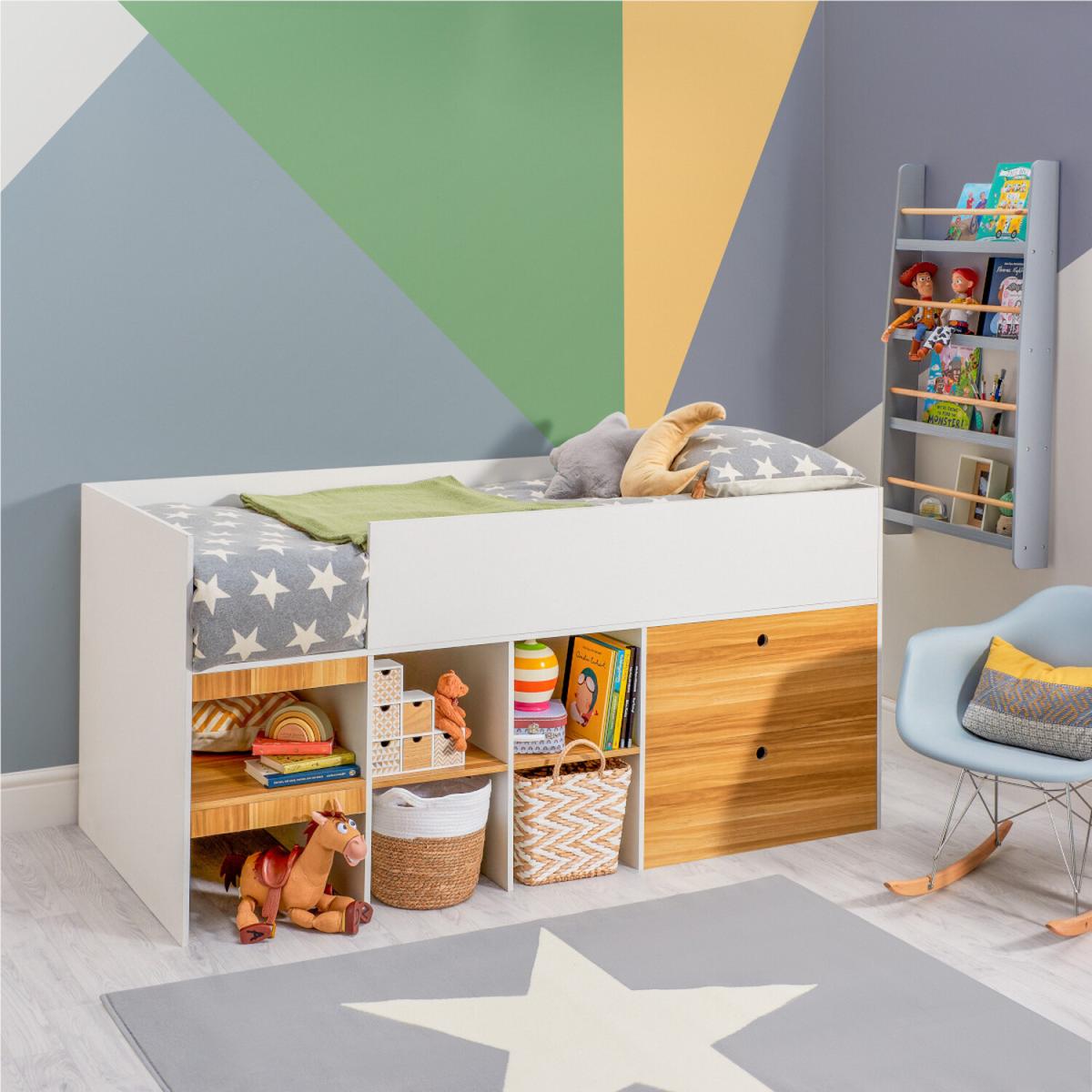Crisp white wood: Elegant comfortable bed frame with headboard, clean simple lines & neutral colour will compliment any bedroom interior. Finished in a smooth bright white non-toxic paint & features pine highlights. Tidy Bedroom: Bed With 2 large storage drawers & 4 shelves ideal for all clothes, toys, shoes, books & more. Perfect bed to encourage children to keep the room organised & clean. Easy glide drawers with smooth metal runners. Safe Bed For Children: Solid steps for easy access onto the bed for younger kids, this can double up as a storage or bookshelf when the child grows. Soft edges and recessed handles make the bed safe for all users of all ages. Durable: Made from strong thick solid pine wood with strong metal fixings. Multiple support sections to strengthen the bed. Solid full baseboard to support the mattress & separate the drawers from the bed. Supplied flat packed easy home assemble, all tools included. To fit a single mattress 190 x 90cm