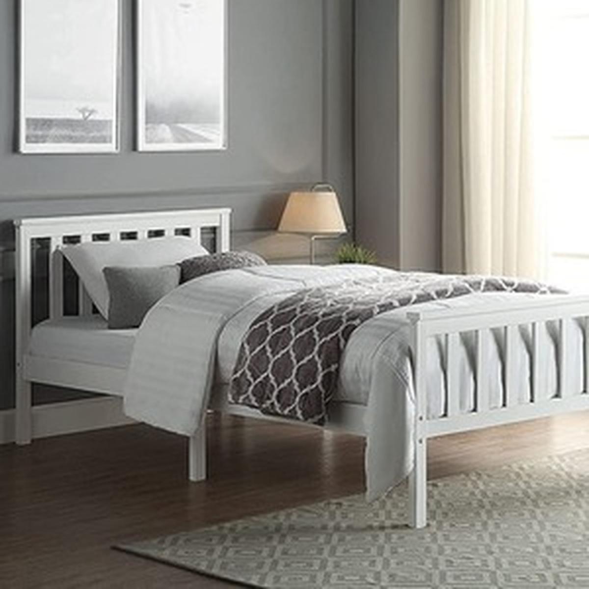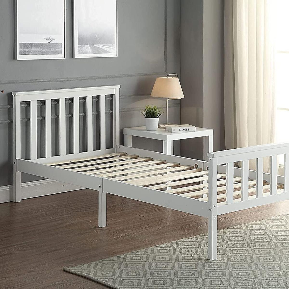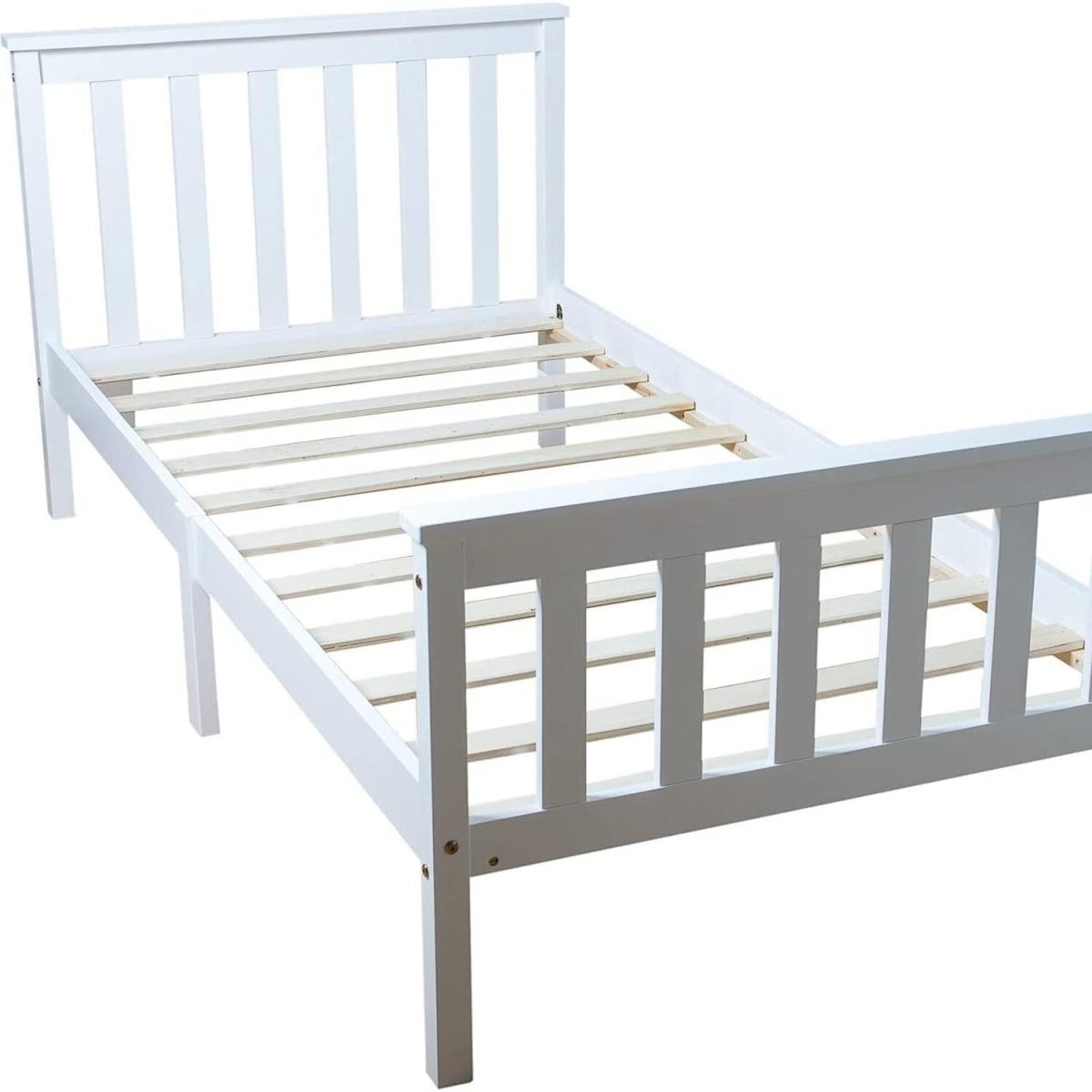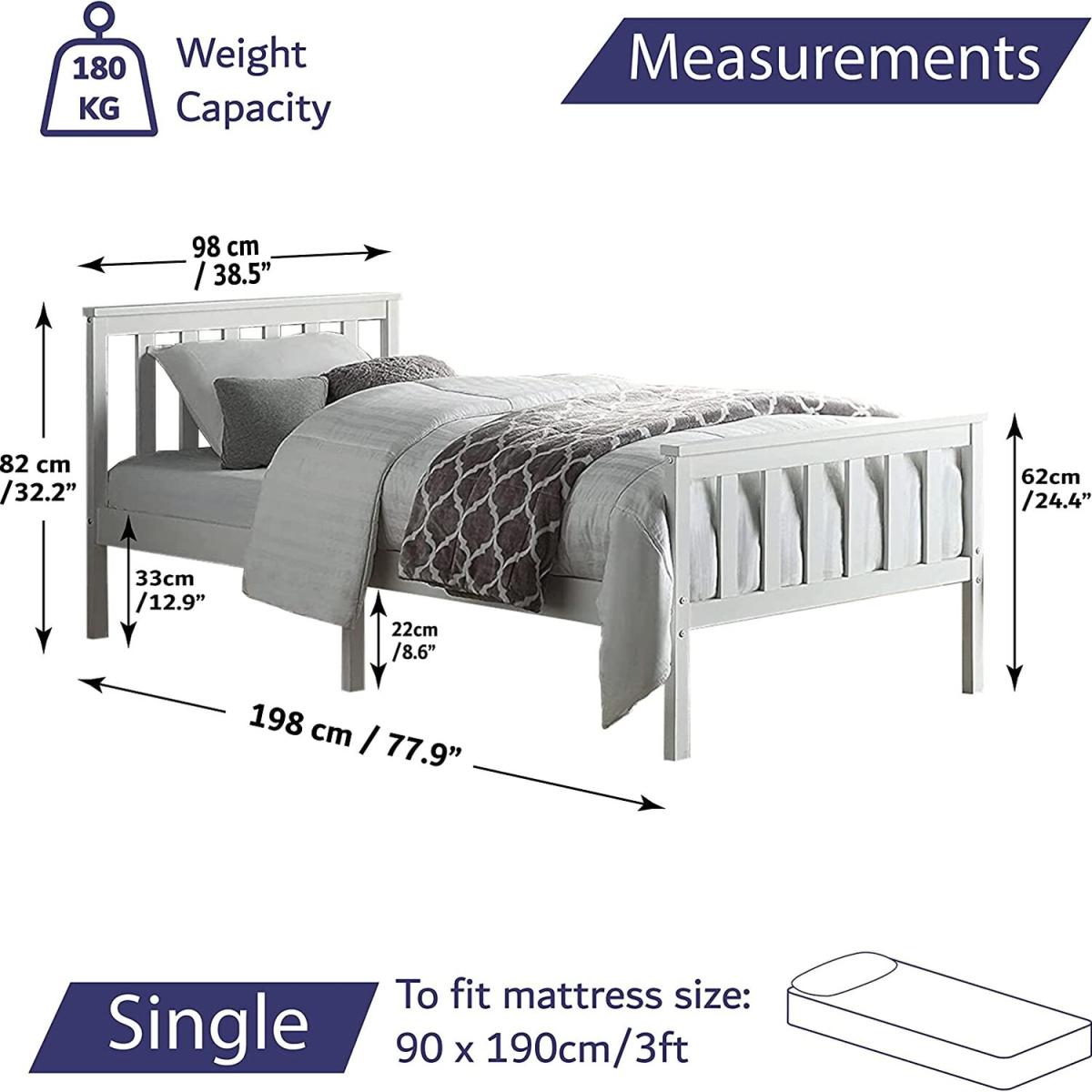 Single wooden bed frame with smooth white finish. Ideal bed for adults kids and teenagers alike. The stylish design will compliment any interior, with an eco-friendly soft mat-painted finish. High-quality solid pine construction for stability and durability. Bed frame takes any standard 3ft single mattress 190cm x 90cm. Slatted mattress base with webbed slats for spacing. Extra centre support legs ensure the bed is sturdy and squeak-proof. Frame Size H 82cm L 198cm W 98cm, Floor Clearance 22cm. Delivered flat packed for ease of transportation to room. Easy Home assembly.