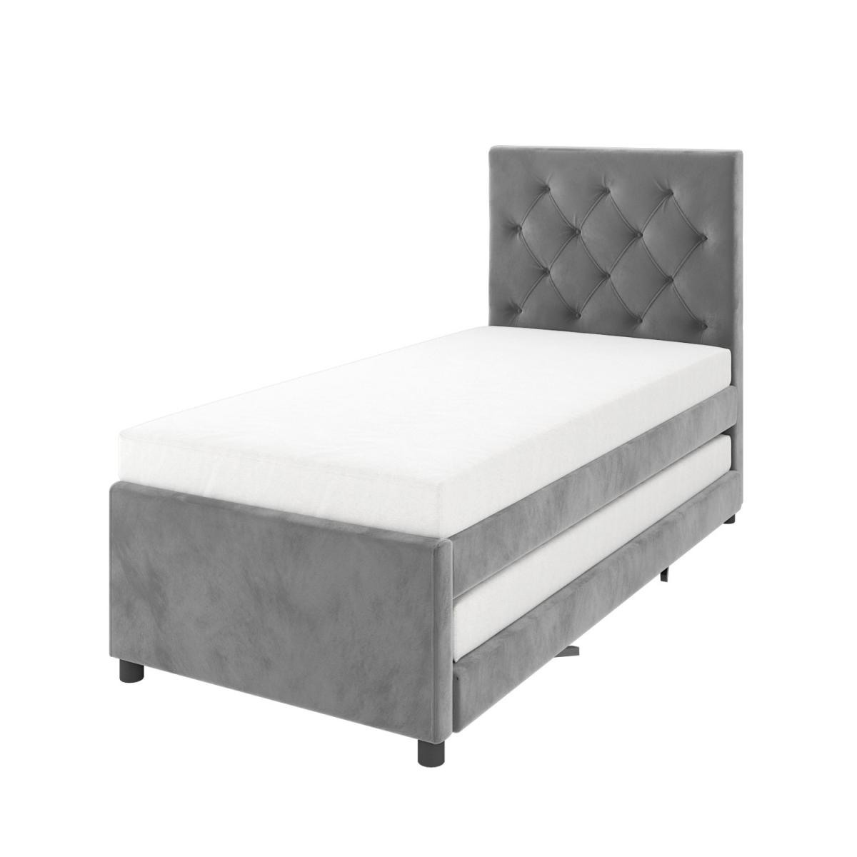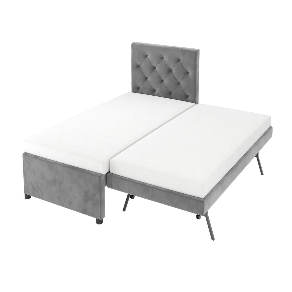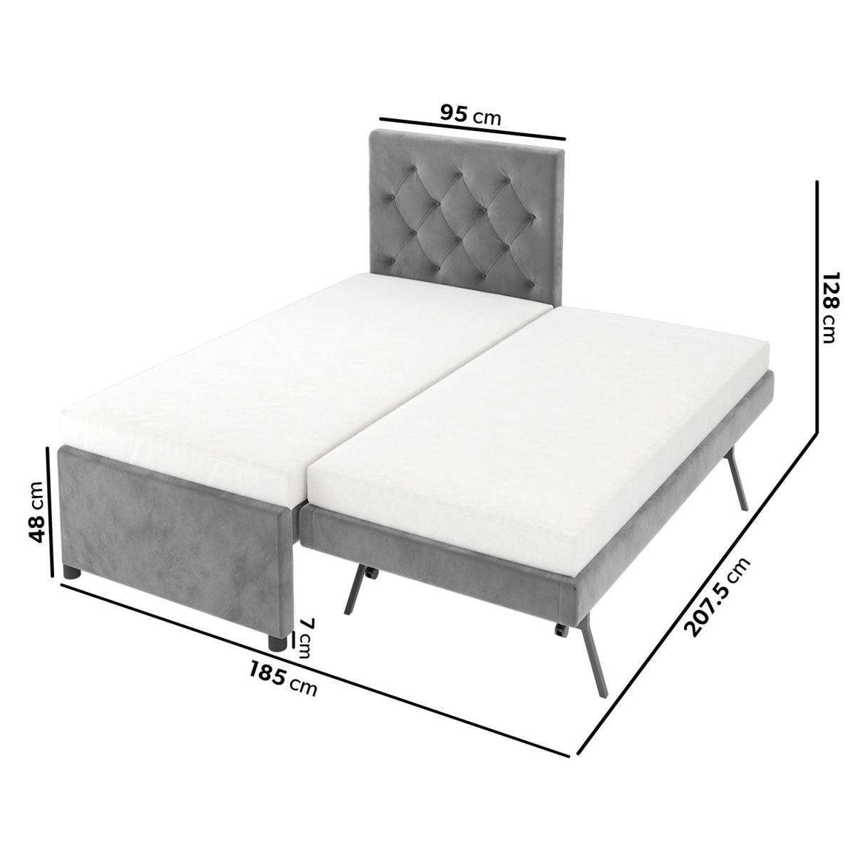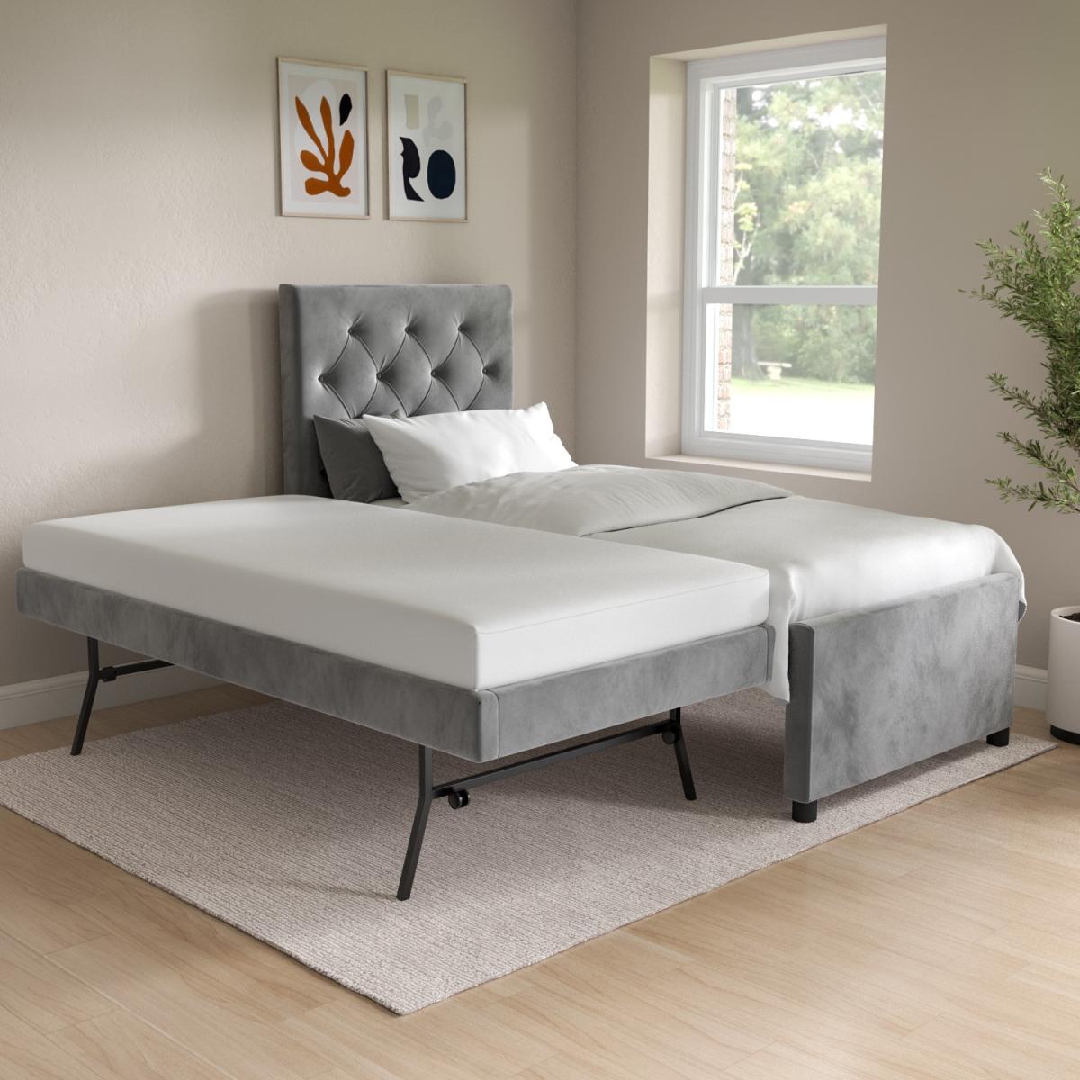 All about me Upgrade your guest bedroom with our gorgeous Isabel guest bed with a Chesterfield headboard. It makes a perfect solution for those last-minute guests thanks to the easy access trundle bed, which seamlessly fits within the bed frame. Once popped up, the single bed turns into a double that can accommodate multiple guests. Both beds have wooden sprung-slatted bases and fit standard UK single mattresses which aren't included. Need to know Product dimensions: W95 x D207.5 x H128 cm Dimensions with trundle popped up: W185 x D207.5 x H128 cm Inner storage dimensions:W137 x D192 x H20 cm Product weight: 42kg Bed mattress size: Standard UK Single (3ft / 90 x 190cm) Colour: Grey Finish: Upholstered Material: Wood, metal, sponge and velvet Bed base: Sprung-slatted Assembly required: Yes Mattress included: No Packaging dimensions: Box 1: W122 x D98 x H15 cm / Box 2: W32 x D197 x H12.5 cm Packaging weights: Box 1: 24.15kg / Box 2: 21.9kg