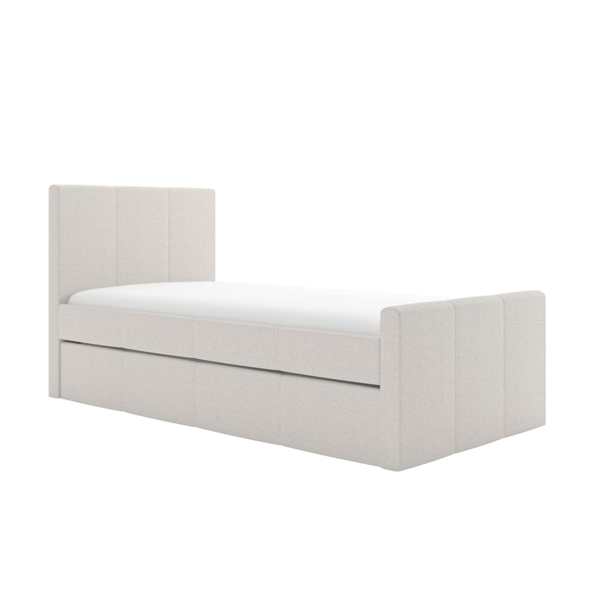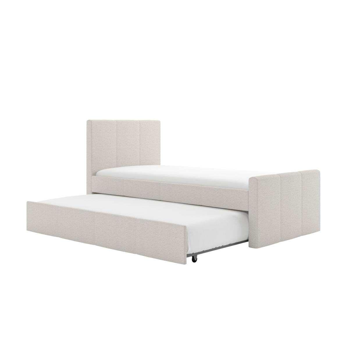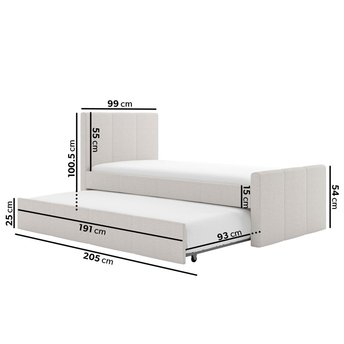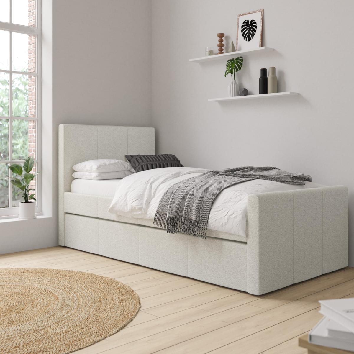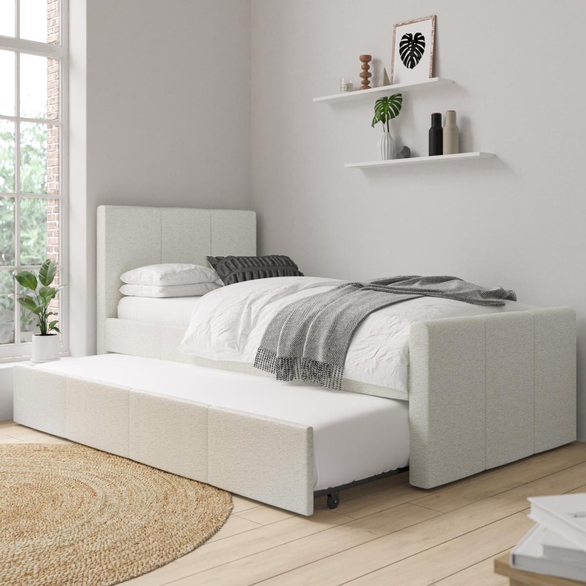 Upholstered in a luxury cream woven fabric, the Layla guest bed's minimalist contemporary design easily coordinates with any decor. With a pull-out trundle bed included, it's perfect for those last minute sleepovers and you'll always be ready when guests call and stay over at a moment's notice! This versatile and practical single bed is the ideal space-saving solution as the pull-out trundle bed is hidden discreetly behind its neutral exterior. The trundle easily glides out from either side of the bed as it's fitted with castors, so you can place it anywhere in the room. Both beds have wooden sprung-slatted bases for comfortable mattress support. Both beds fit a standard UK single mattress, which can be purchased with the bed in our popular package deals. This product is delivered to your home flat-packed, for your convenience.