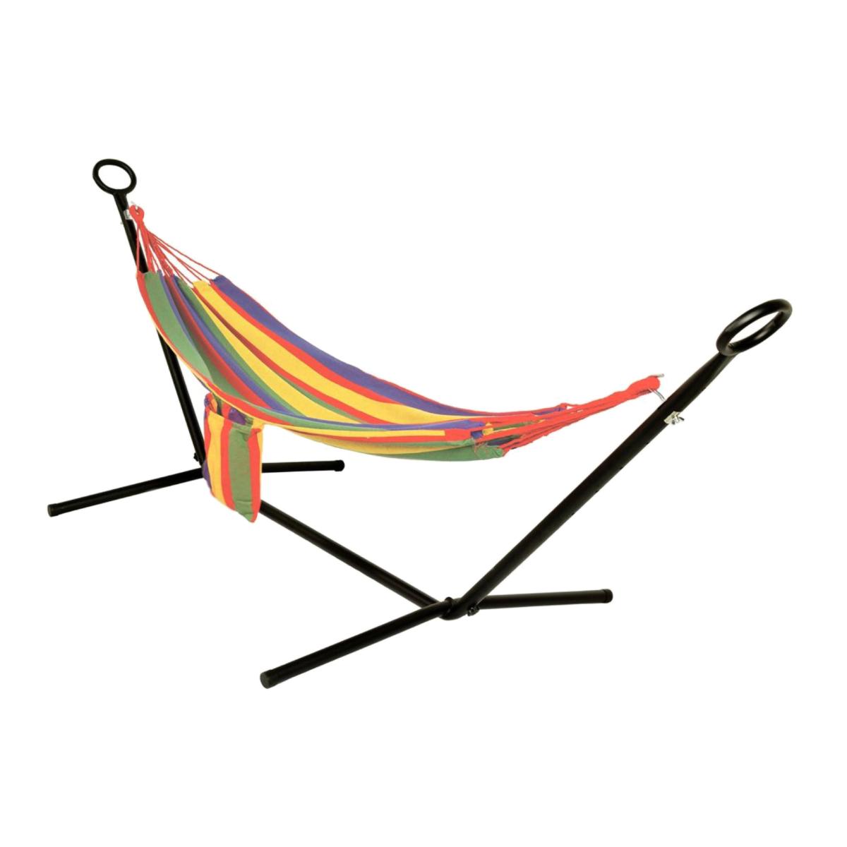 The Hammock has a built in storage bag, which helps you to store your hammock away easily when you aren't using it. It also allows you to pack up your hammock and take it with you, perhaps on holiday or even just to your local park. The material is made from 65% cotton and 35% polyester, 320. Ggsm which means that it will be a thick and therefore durable material perfect for a hammock. It will carry a maximum load of 120kg, so that this hammock will be able to support a large weight, with support ropes helping you to attach your hammock safely wherever you decide to put it. Thanks to the new attachment storage bag, you will never need to get up from your comfy spot. Simply store your phone, i. Pod and other essentials inside, lay back and enjoy.