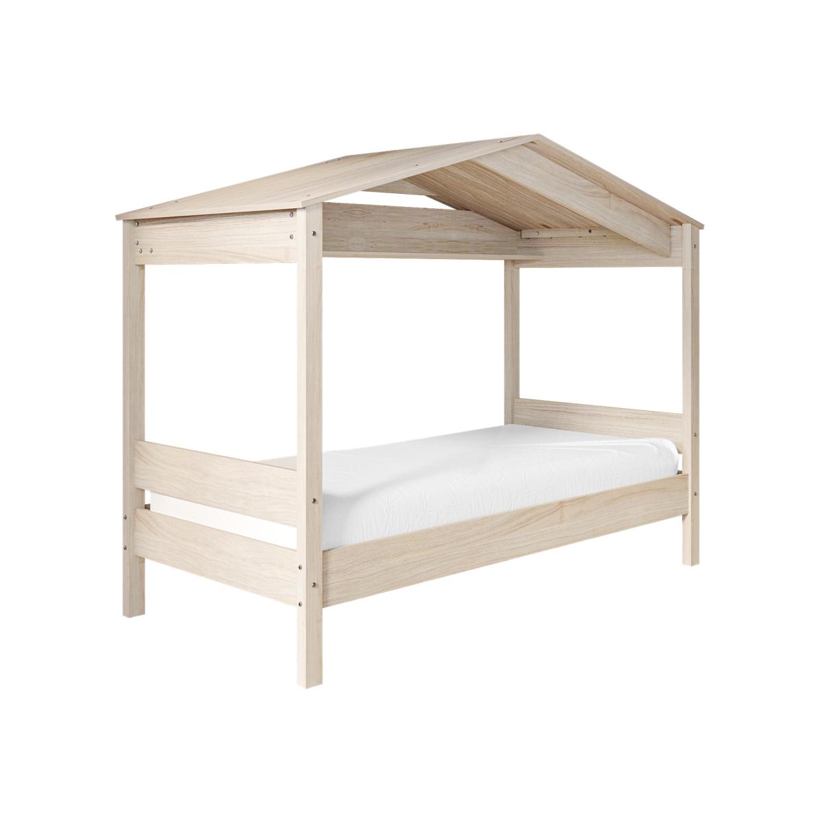 Features we love Scandi-inspired house bed frame – perfect for children Natural pine finish to suit any bedroom style Doubles up as a den or playhouse for daytime playing Generous space underneath for underbed storage Save 10% on your selected mattresses with this bed All about me This wooden house bed gives your children a fun space to sleep, play, and relax. It features a roof, which makes it cosy by night, and by day it makes it the perfect hideaway; your little one can get their imagination going. Why not personalise it with fairy lights, buntings, or decorative fauna? Made of solid pinewood, it's durable, while the slatted base provides comfortable mattress support. It fits a UK single mattress, which isn't included, so you're free to select the mattress of your choice. Need to know Total dimensions: W98 x D203 x H158 cm Product weight: 51kg Bed mattress size: Standard UK single (90 x 190cm / 3ft) Colour:Light pine wood Finish: Natural Material: Solid pine wood Bed base: Pine slats Assembly required: Yes Mattresses included: No Packaging dimensions: Box 1: W37.6 x D114.5 x H16.7 cm / Box 2:W28.1 x D199.5 x H19.7 cm Packaging weights: Box 1: 25kg / Box 2: 29kg