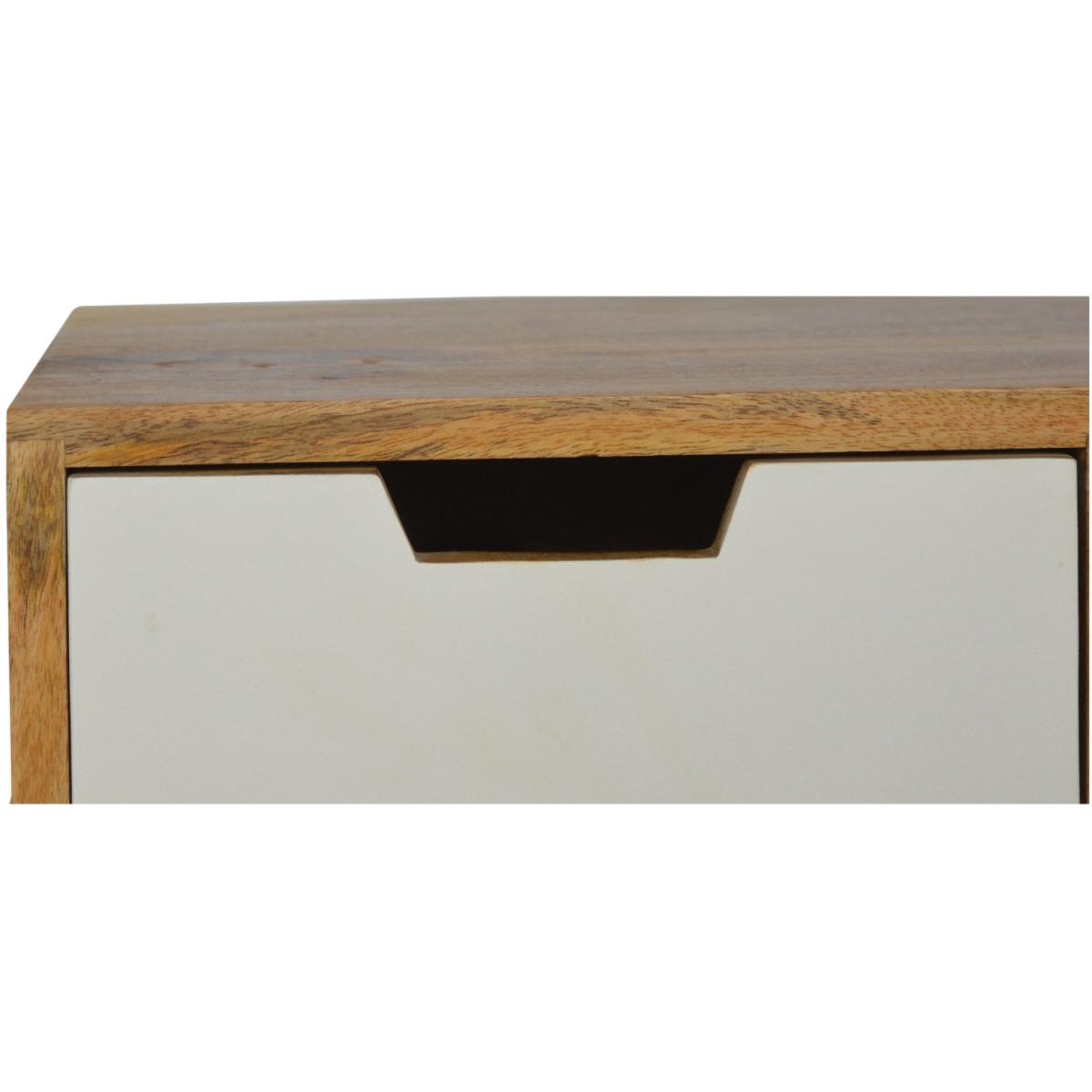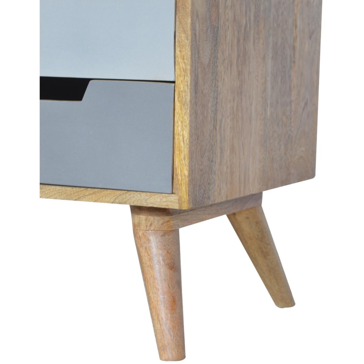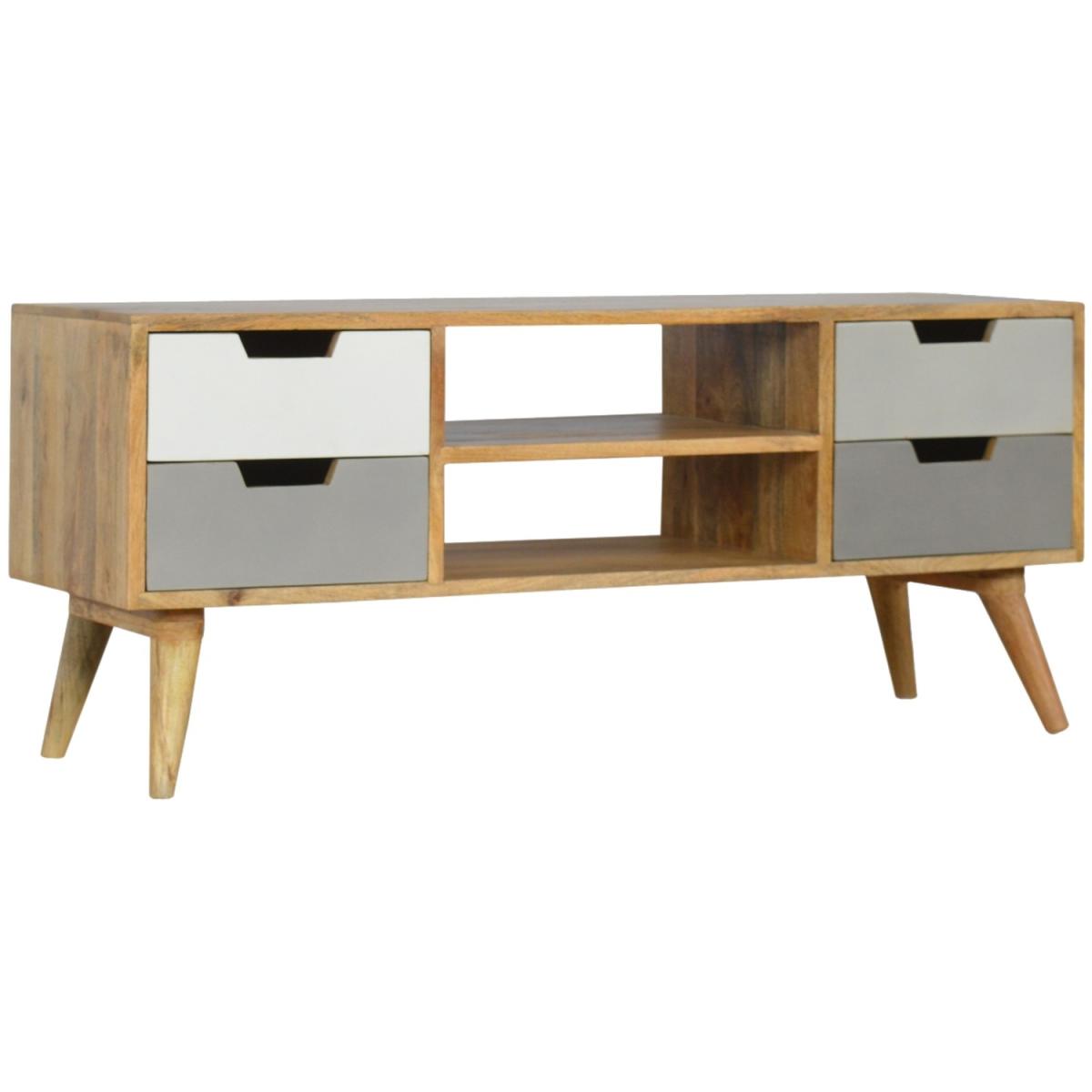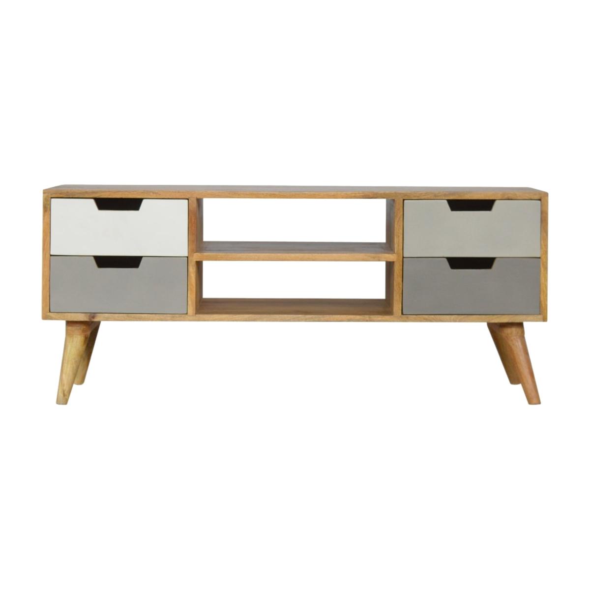This Nordic gradient style media unit will bring a whole new look to your home, with its simple yet modern and beautiful design this piece is constructed from 100% solid mango wood and has a fine smooth oak-ish finish. It has useful storage with 4 spacious drawers that are individually hand-painted with 2 tones of grey and 2 shelves for displaying any bits you wish to show off in the home. Some other features include 4 Nordic-style legs and cut handles for the drawers. Every piece of furniture is individually handcrafted and includes swing care tickets explaining the cautions and aftercare instructions.