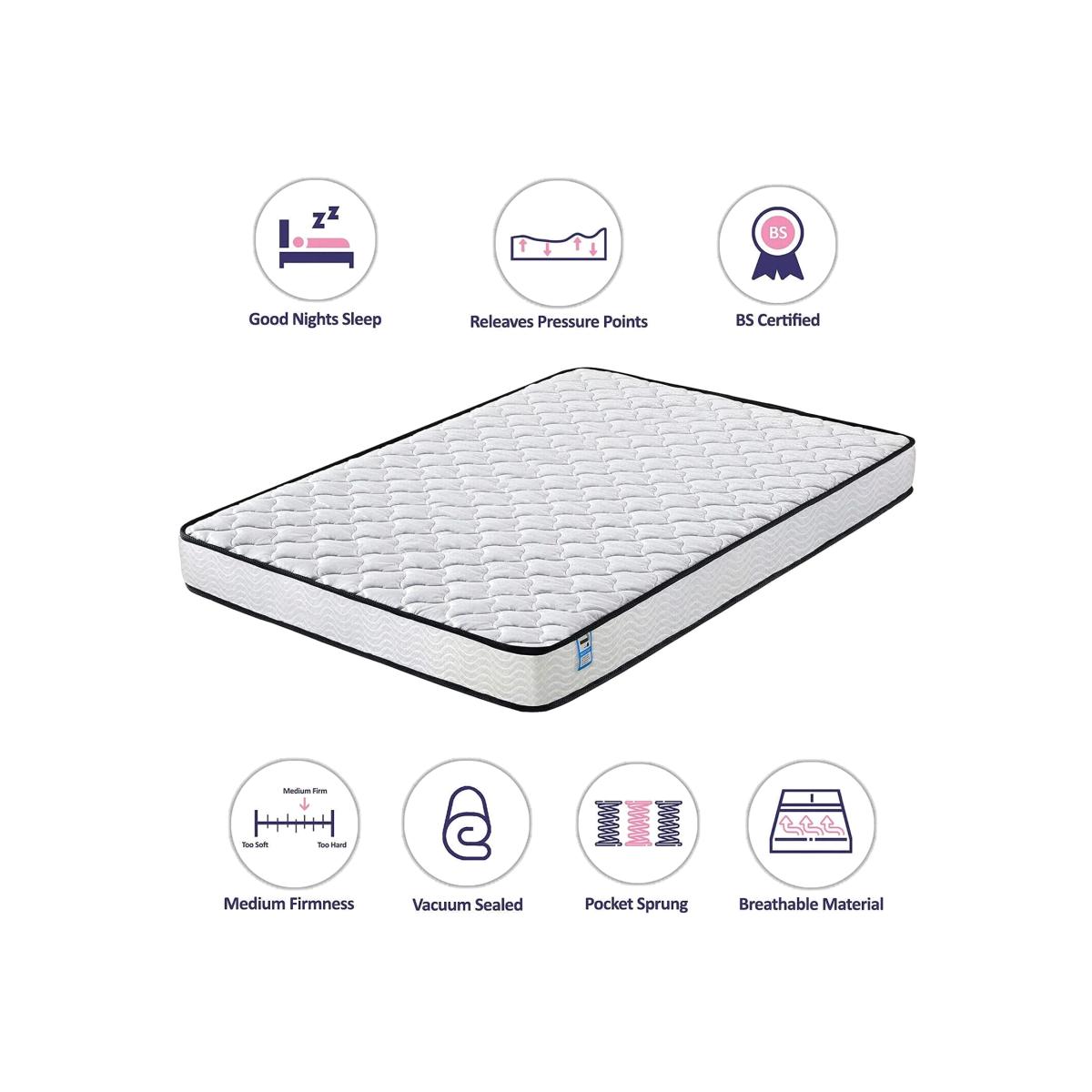 20cm Thick deluxe comfort pocket sprung mattress with quilted foam top layer. Featuring upto 609 independent springs that absorb weight and mould to sleeper. Breathable hypoallergenic polyester outer fabric keeps mattress fresh between sleeps & provide anti dust and mite protection. Medium Firm rating suitable for all sleeping positions and ages. Certified to BS7177 Fire retardant and UKFR safety tested.