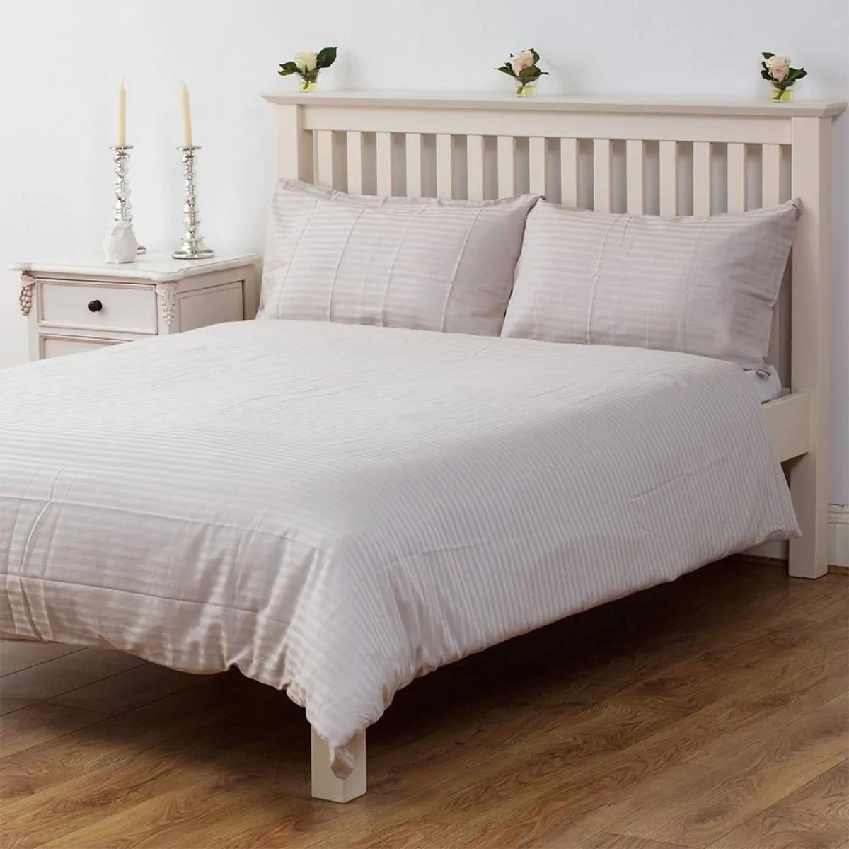 Bring a simple, comforting feel to your bedroom décor with our fantastic sateen bedding sets, which have a 210 thread count giving guaranteed high quality comfort to your home. This natural coloured set includes a single duvet cover and a matching pillowcase, giving a neutral theme that would look great inside of any décor, from classic to contemporary! The 100% cotton material feels smooth and relaxing, helping you to get a great night’s sleep every night!.