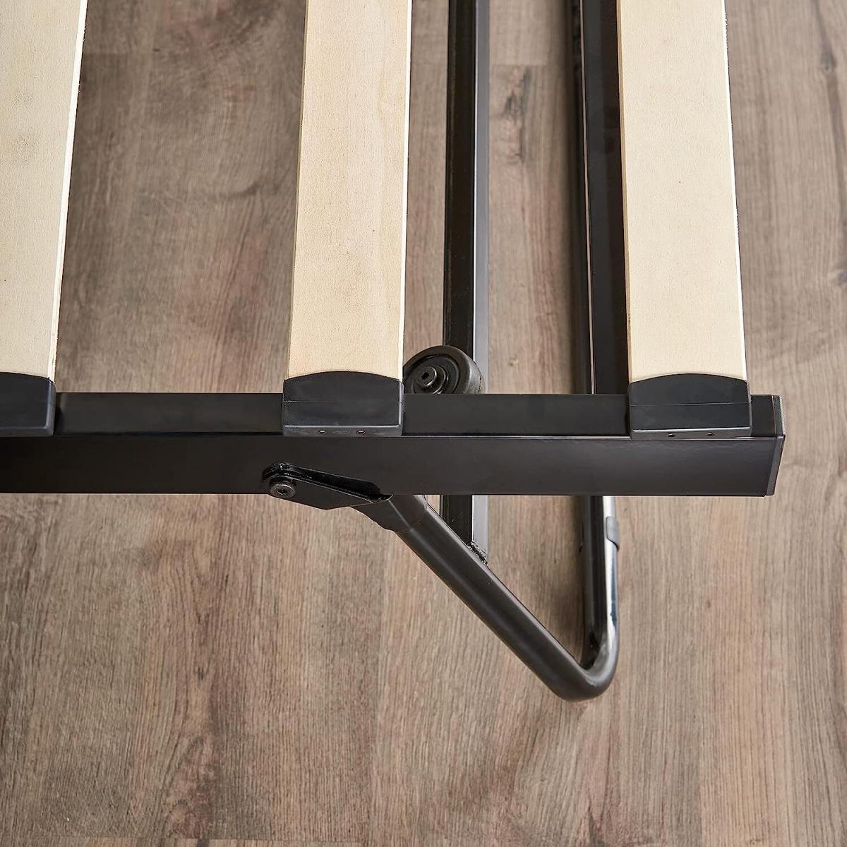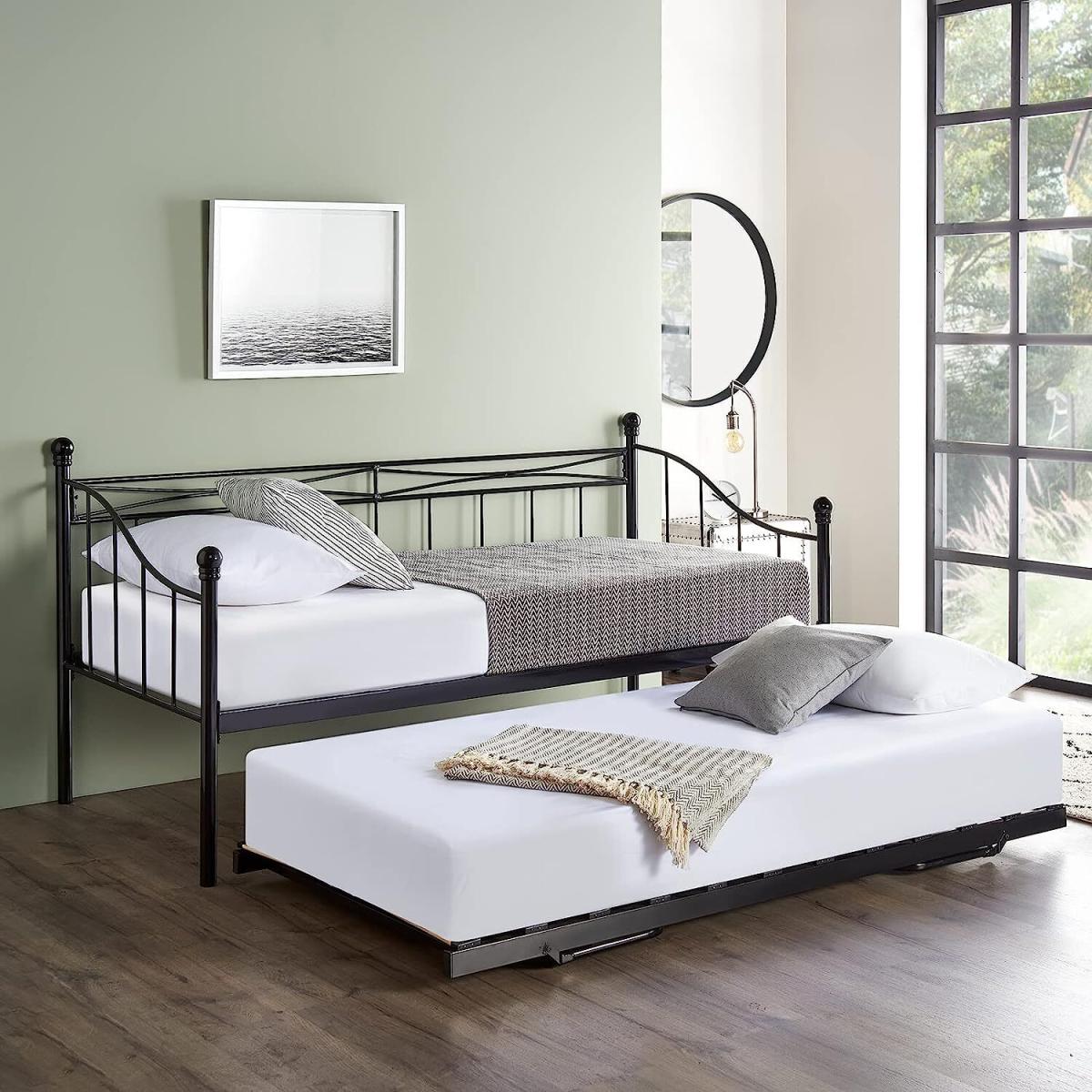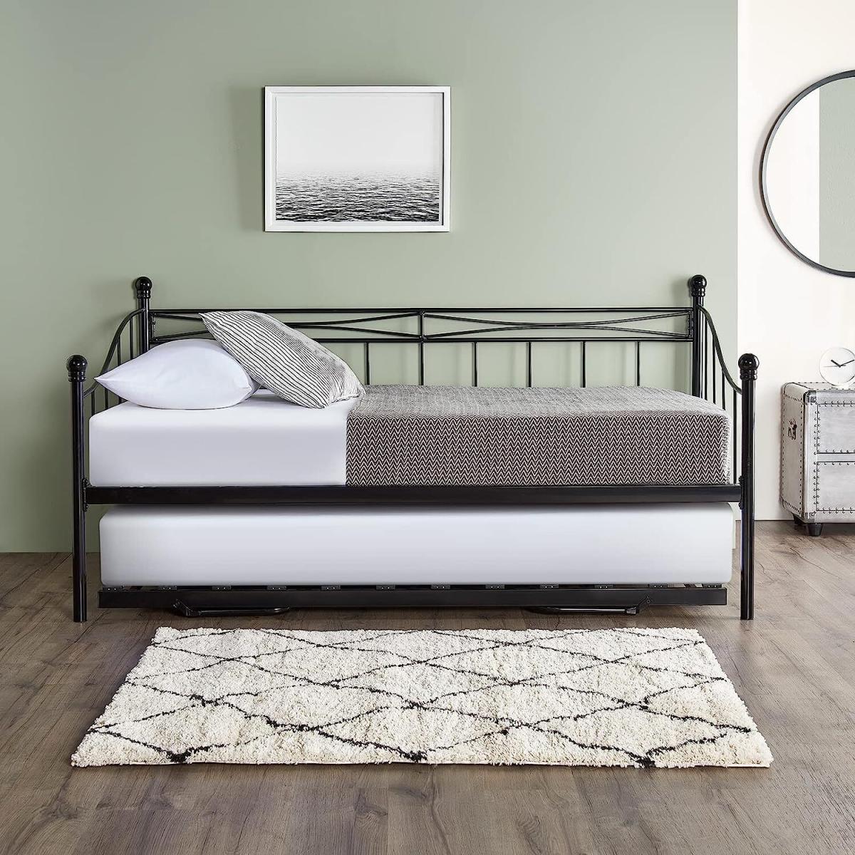 Finished in a sleek black gloss metal. Graceful lines & ball-topped posts will suit adults, teenagers and children's bedrooms alike. Easy pull-out & raise trundle base perfect for guests, sleepovers, extra sleeping options. Discreetly hide away the trundle bed when not in use. Perfect alternative to bunk beds - Trundle bed can be made to pull out from either side. Use as seating during the day sleeping at night. Includes a full backrest bar and side panels for support. Trundle is fully removable not attached to bed, can be used anywhere in the room. This trundle day bed is made from high-grade metal. Bar design headboard and footboard. Strong support beams & slats. Solid caster wheels to pull out the bed easily. Strong support beams & slats. Solid caster wheels to pull out the bed easily.