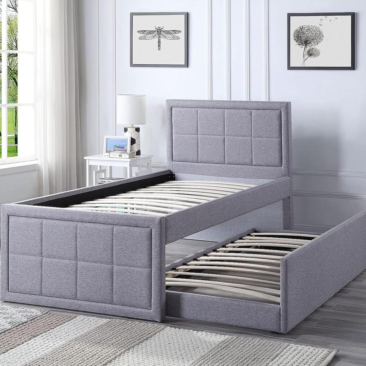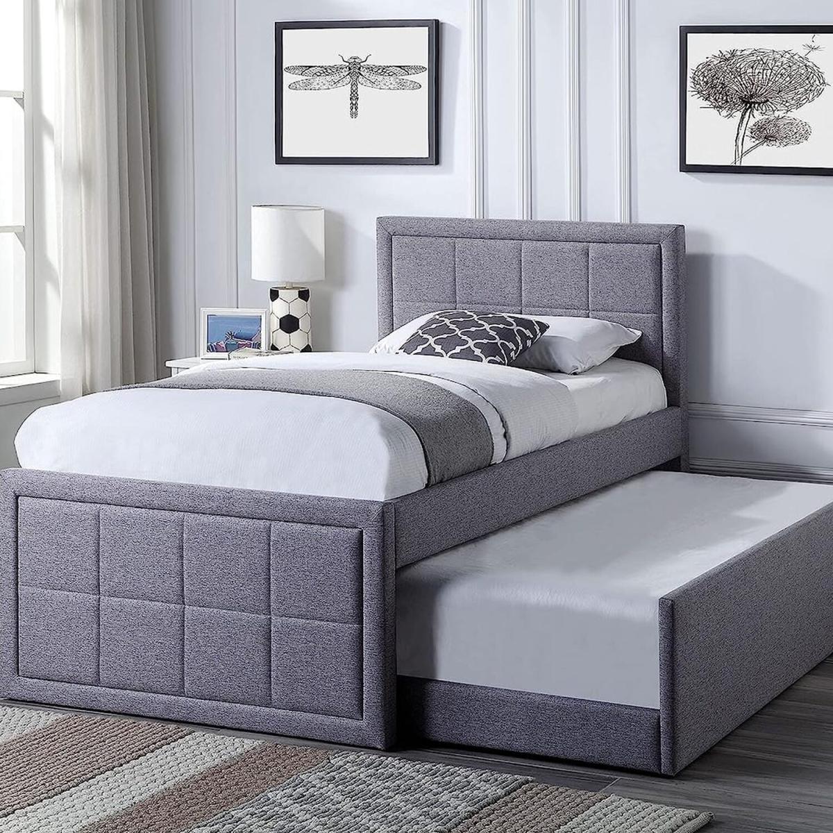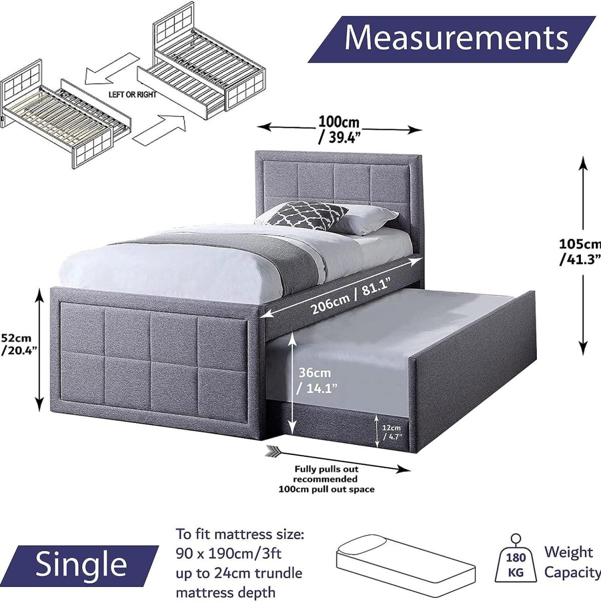 Upholstered in a grey hopsack linen. This ottoman storage bed frame will effortlessly blend into any bedroom interior. Extra Bed on demand easy pull-out trundle base perfect for guests, sleepovers, extra sleeping options. Discreetly hide away the trundle bed when not in use. Perfect alternative to bunk beds - Trundle bed can be made to pull out from either side. Padded headboard, base & sides with strong sprung wooden slats for support and strength. Trundle is fully removable not attached to the bed, and can be used anywhere in the room. This storage bed is made from the highest quality materials including the strong centre support beam and hardwearing water and mark-resistant linen fabric finish.