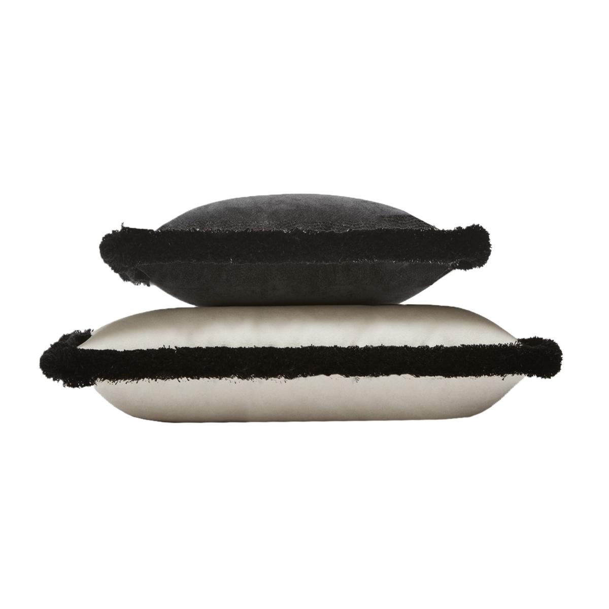 The chromatic scheme characterizing this cushion lends it a distinct luxe yet restrained allure. It features soft padding in polyester fiber, while its rectangular silhouette is outlined by bold garnet cotton trimming outlining the light-beige velvet upholstery. The possibility to easily remove the cover simplifies its cleaning process. These accent pieces will make an eye-catching addition to a sophisticated living room, study or bedroom. All pieces are marked by simple versatility and charming hues that are easy to mix and match. Handmade in Italy.