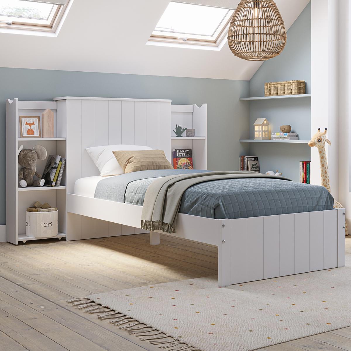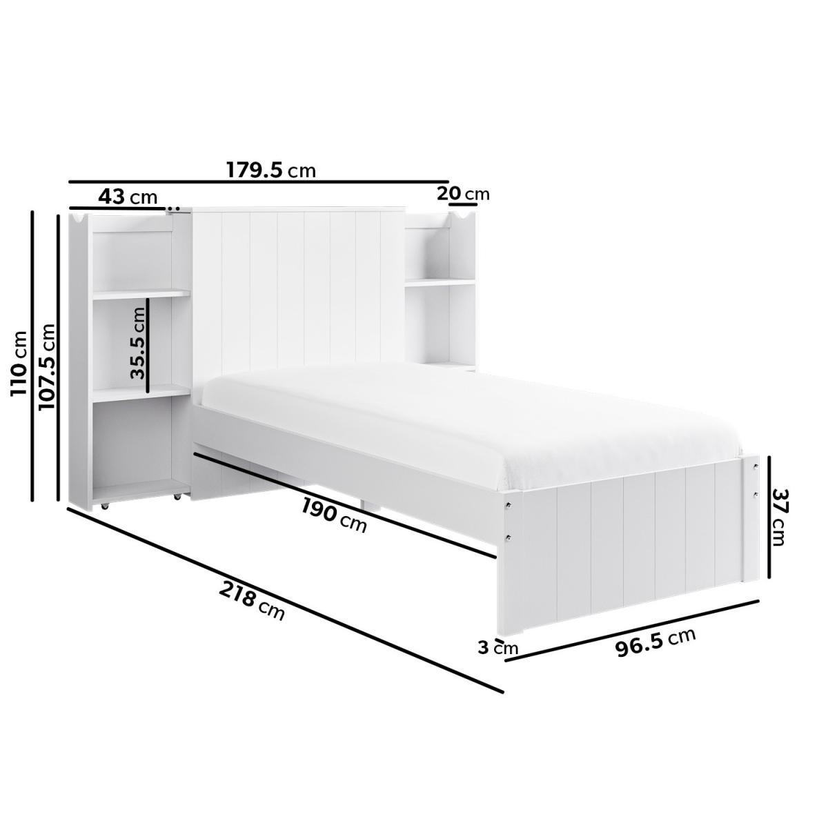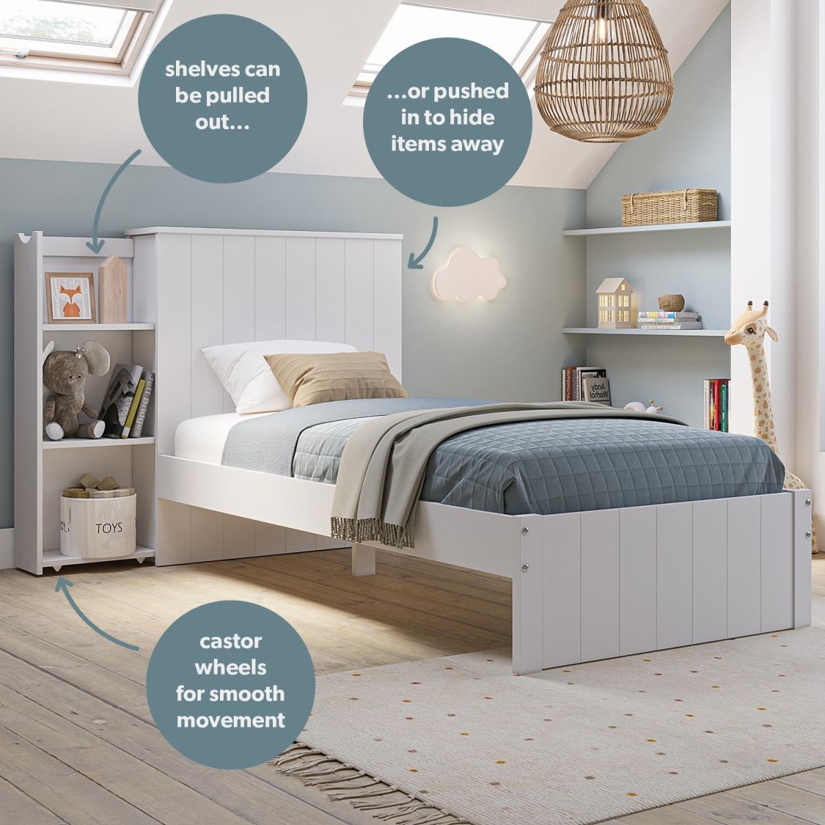 All about me Our Pery single bed with hidden pull-out storage units is the perfect solution for those who yearn for floor space in an instant. It's ideal for a kid's bedroom to grow with due to its timeless wooden design. It features a bookshelf within each side so children can tidy up copious amounts of books effortlessly. Plus, the headboard shelf storage allows them to display their own personal touch. Need to know Product (with shelves pushed in):W96.5 x D218 x H110 cm Product (with shelves pulled out): W179.5 x D218 x H110 cm Each cabinet dimensions (x2):W43 x D20 x H107.55 cm Product weight: 60.7kg Bed mattress size: Standard UK Single (3ft / 90 x 190cm) Colour: White Finish: Painted Material: Solid pine wood and MDF Bed base: Sprung-slatted Assembly required: Yes Mattress included: No Packaging dimensions: Box 1: W103.5 x D122.5 x H6 cm / Box 2: W44.4 x D194.8 x H7.9 cm Packaging weights: Box 1: 27.5kg / Box 2: 33.2kg